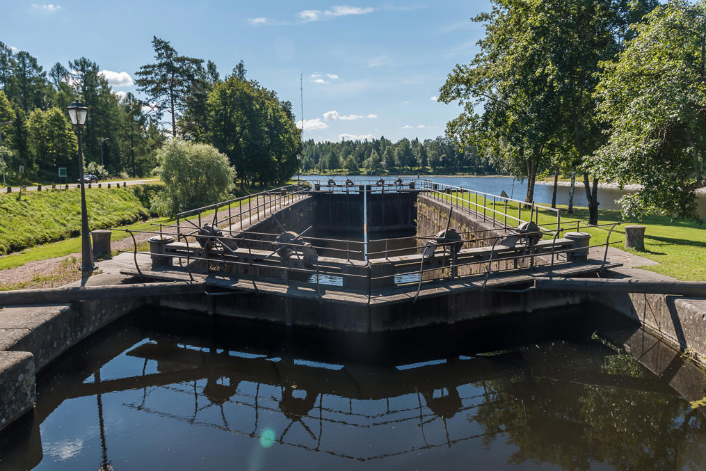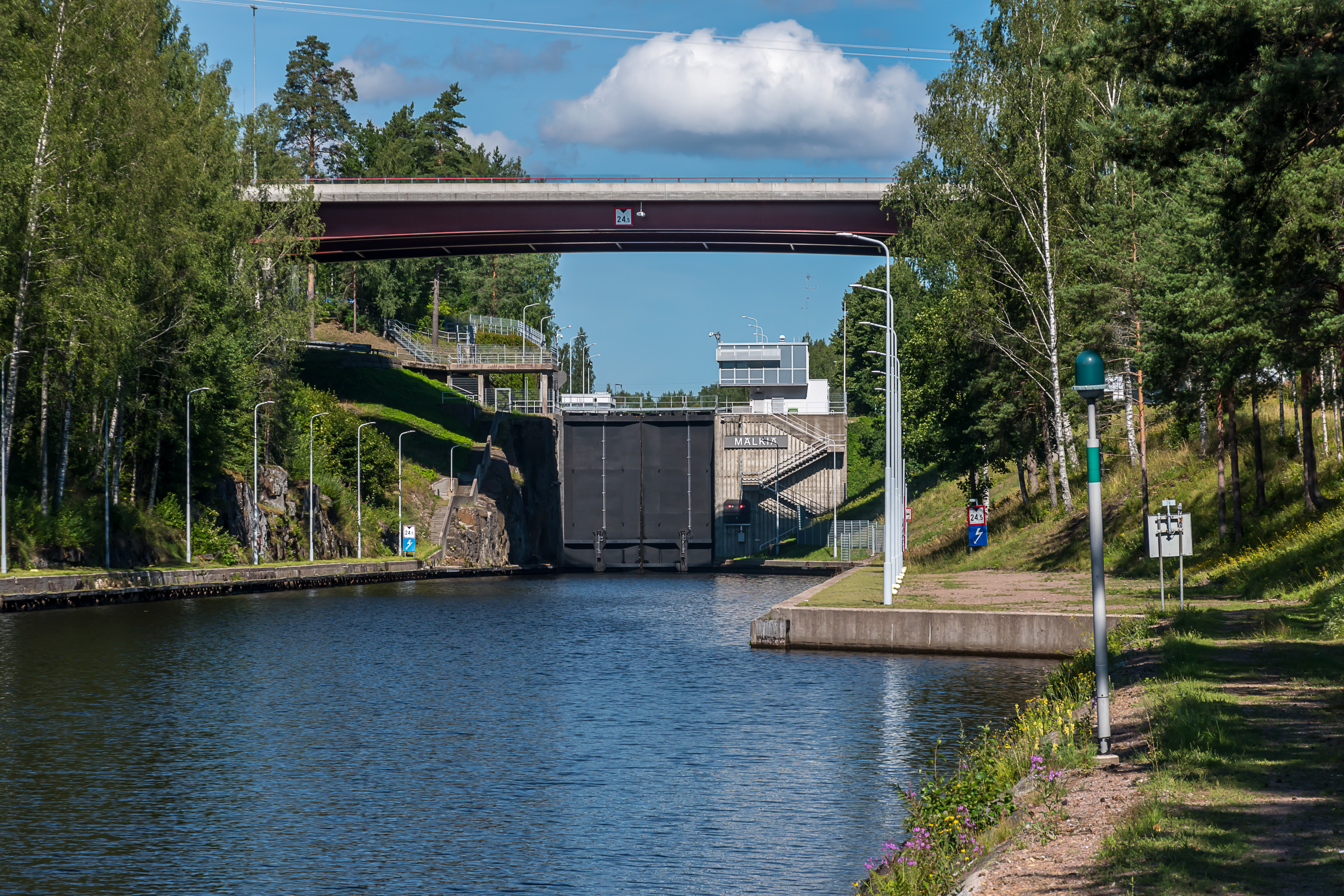16. Самый высокий из современных шлюзов (12.4 м) — самый верхний же — шлюз Мялкия (Mälkiä), в паре километров от центра Лауритсалы, над которым проходят мосты автомагистрали 6 Лаппеенранта-Иматра.