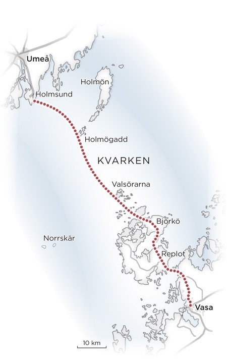 Реально, конечно, максимально шли по островам, вышло 120 км. Мостов между островами и с материка на архипелаг тогда не было, маршрут был Вааса — залив Грёнвик — о. Реплот — о. Бьёркё — о-ва Лаппёрарна — о-ва Валсёрарна — о. Хольмёгадд — порт Хольмсунд — Умео.