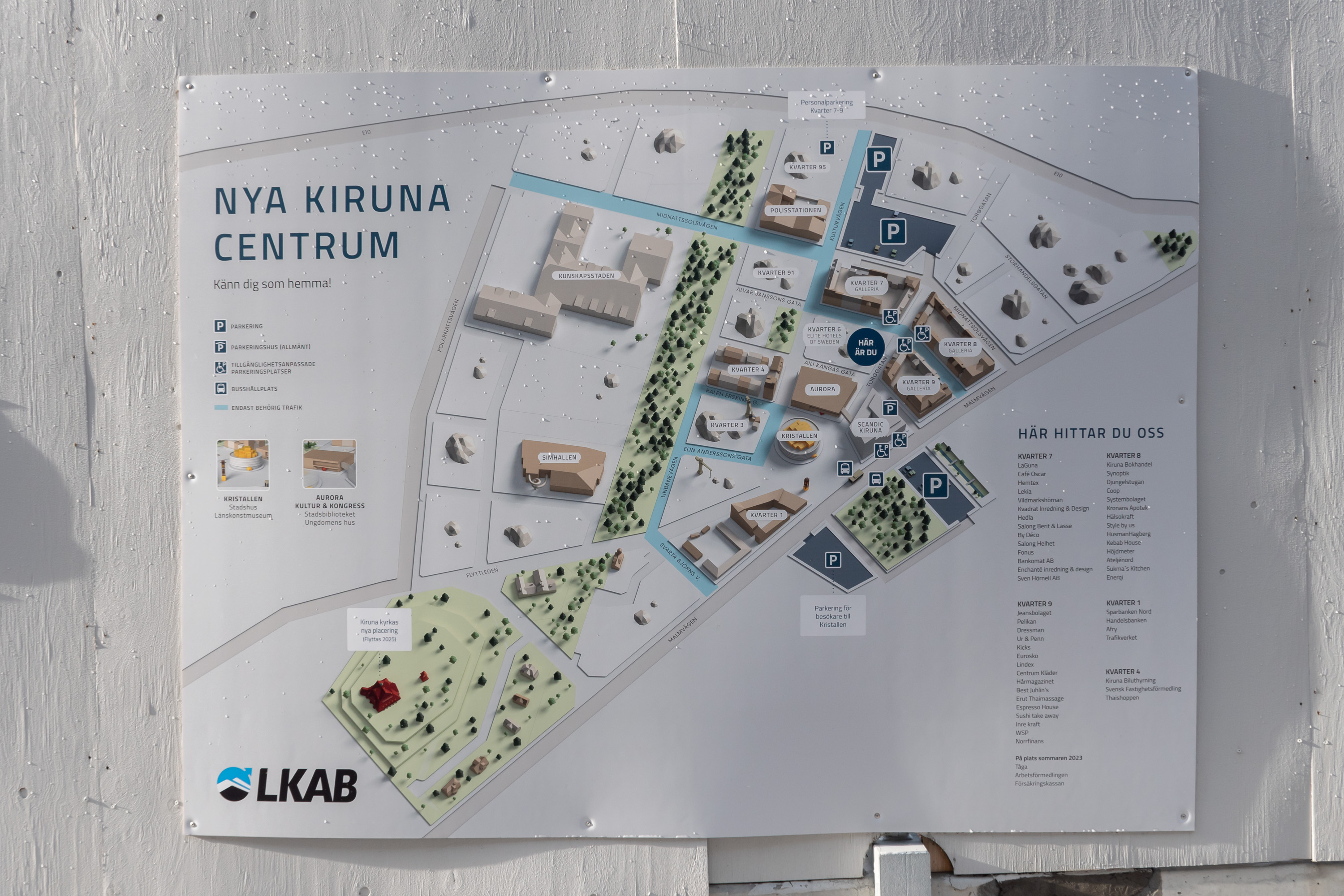 Переезжает, конечно, не весь город, который ожидаемо раскидистый и большая его часть имеет малоэтажно-пригородную застройку, а старый центр, который находится ближе всего к шахте под горой Киирунаваара (Kiirunavaara). Новый центр строится в 3 км восточнее, в местечке Туоллаваара (Tuollavaara), на восточной окраине. Ж/д и объездная автодорога уже перенесены.