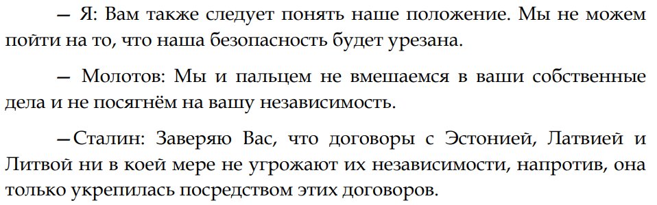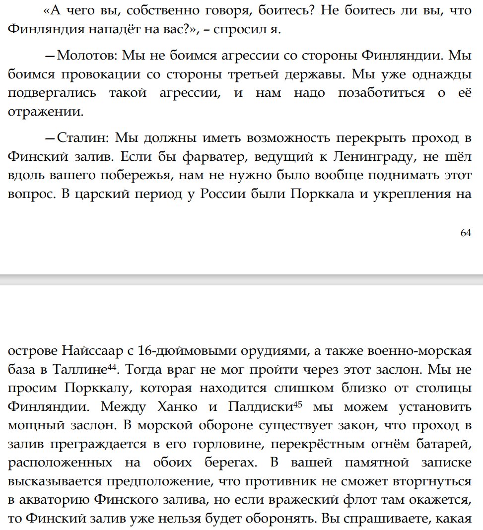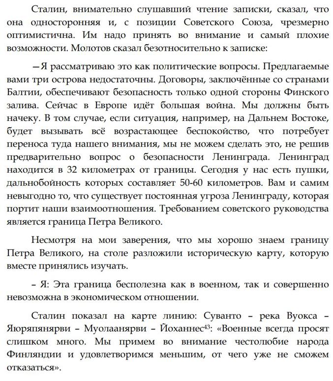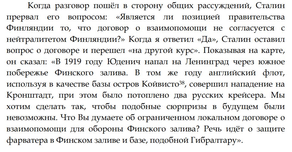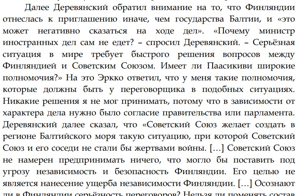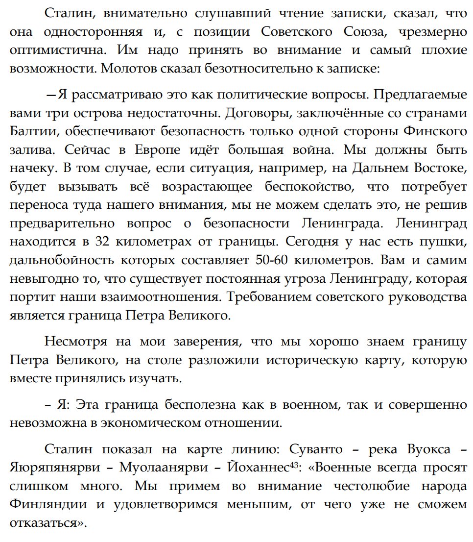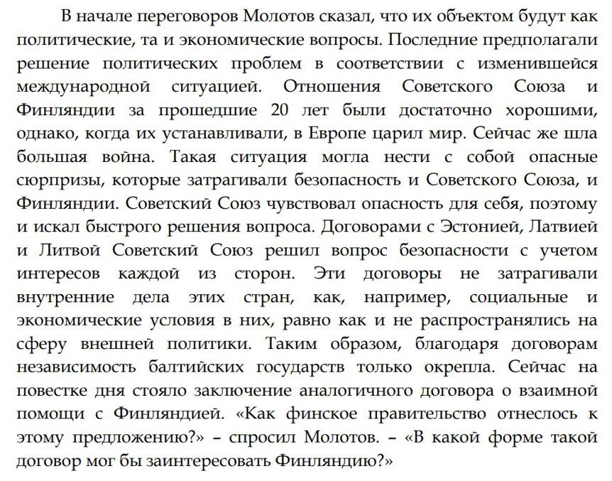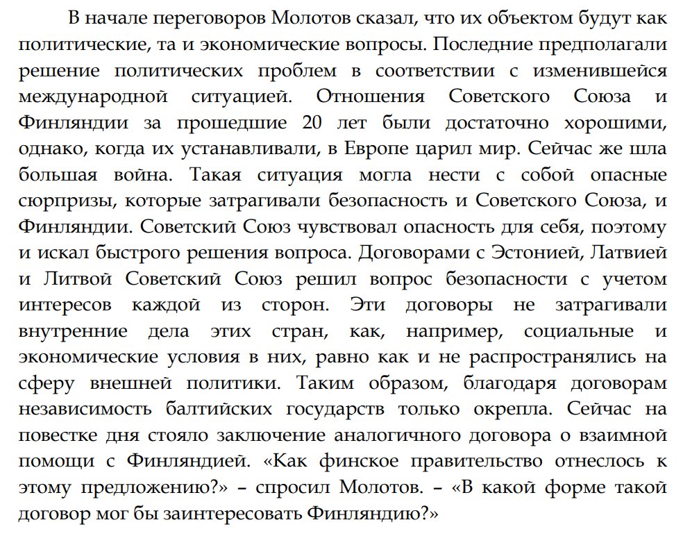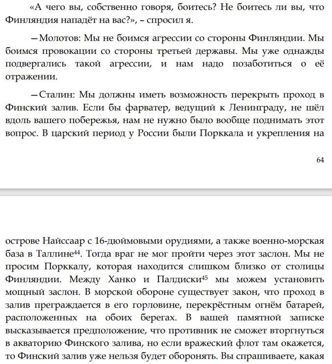 Паасикиви, надо сказать, в основном исходит из тезиса, что советская сторона вела переговоры in good faith, ну требования, мол, конечно, дикие, но они, скорее всего, сдержали бы свое слово. Вот это упоминание стран Балтии, с которыми мы прекрасно знаем, что потом стало, конечно, ставит под большой вопрос добрые намерения Сталина.