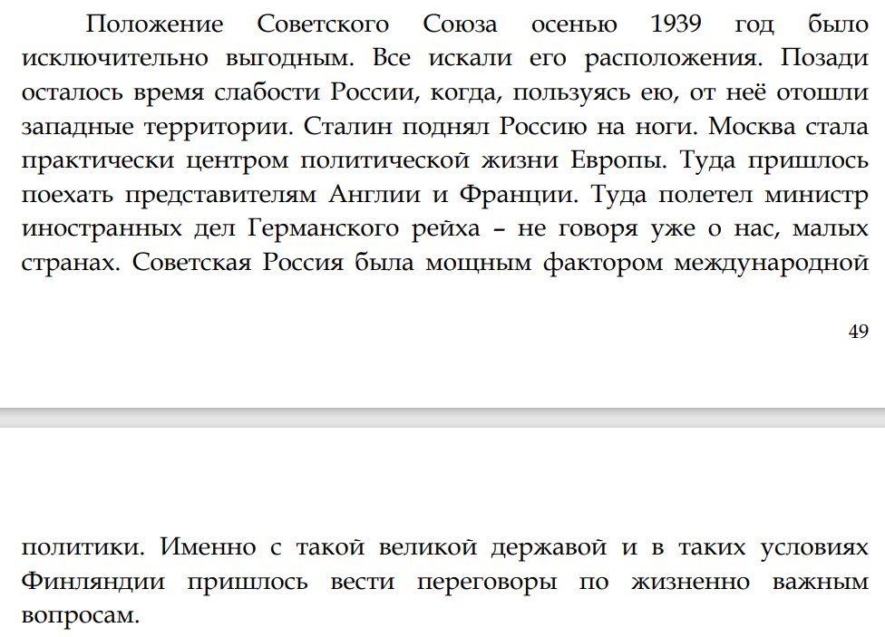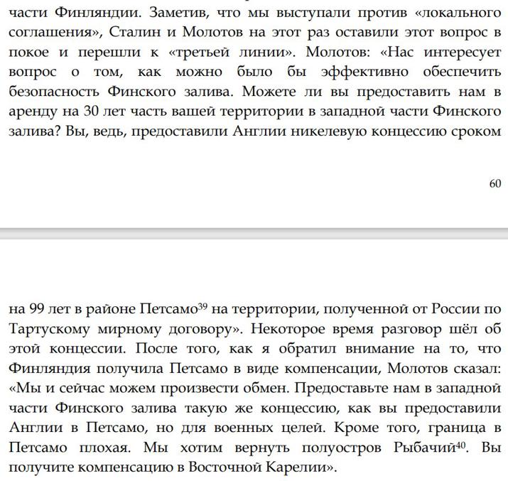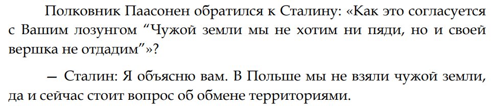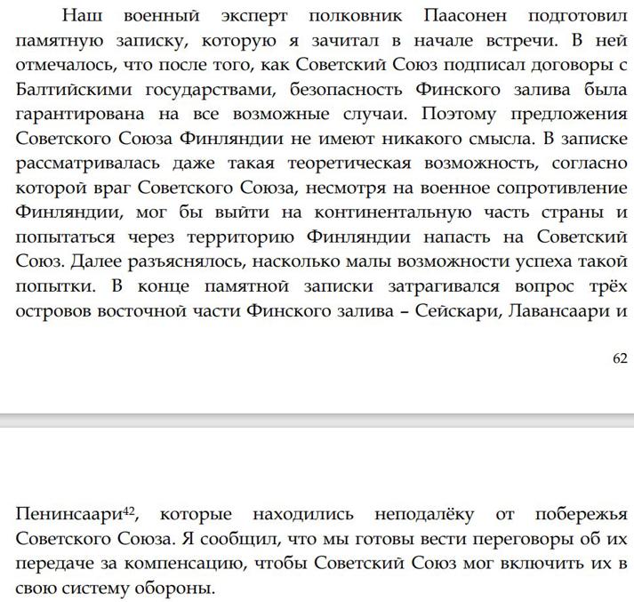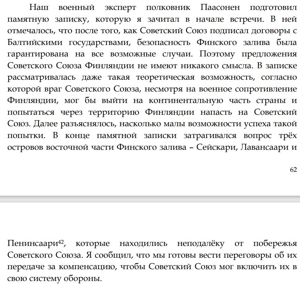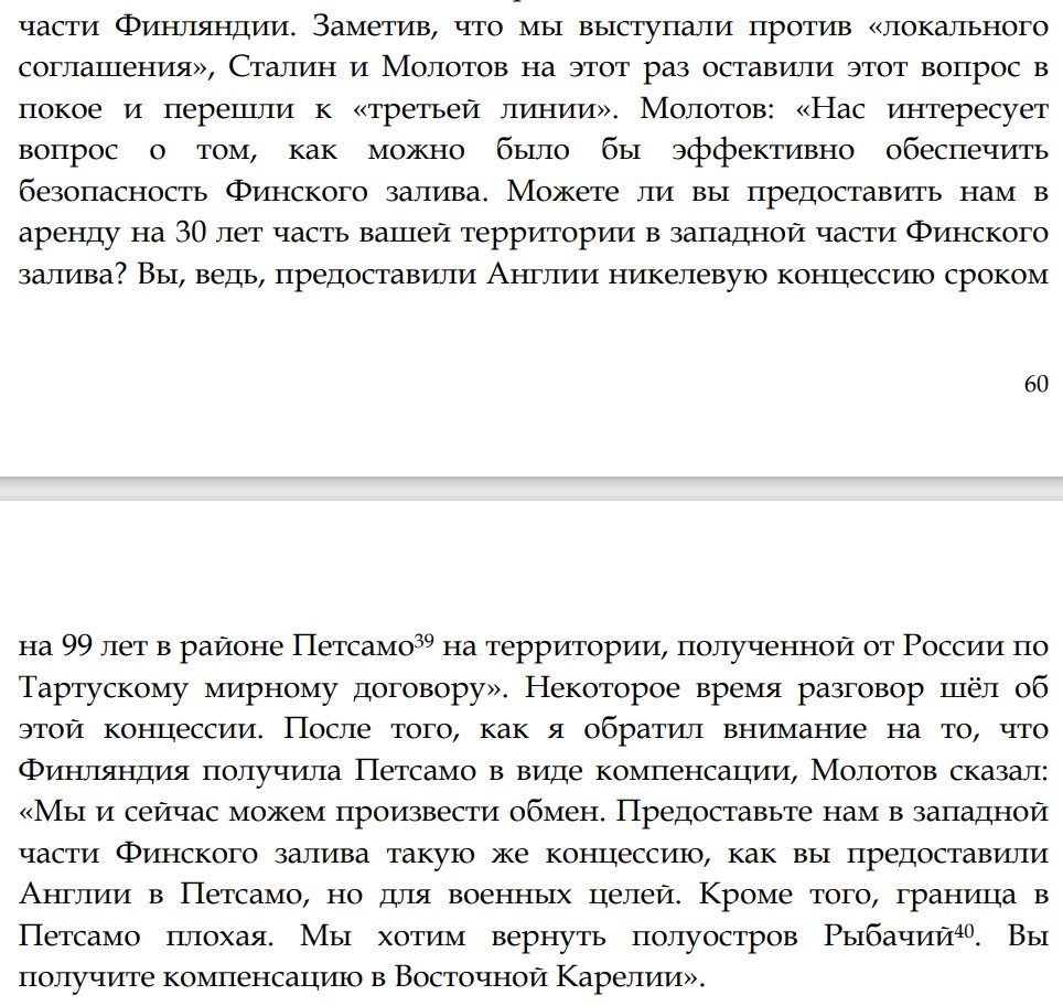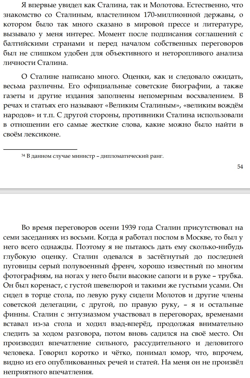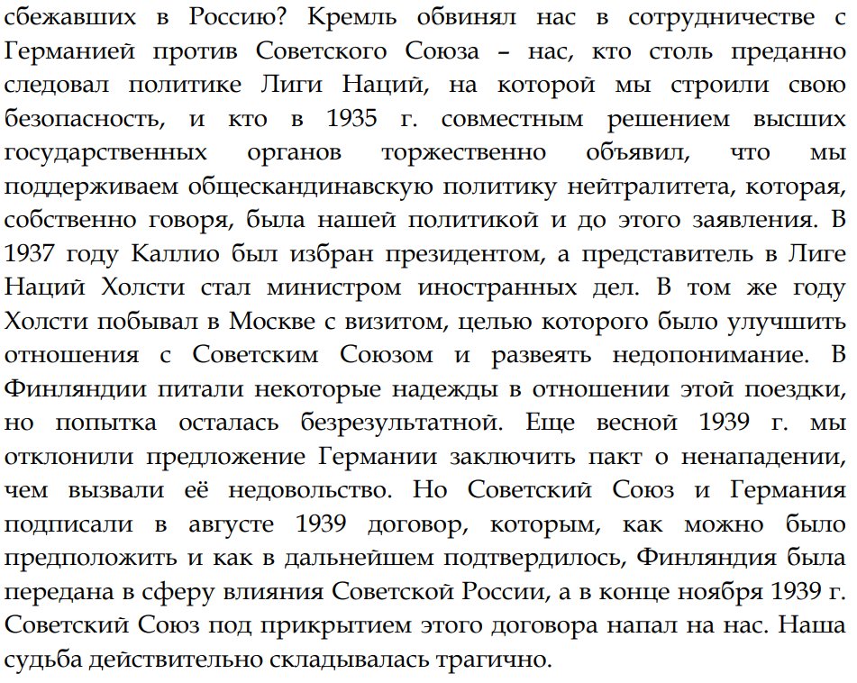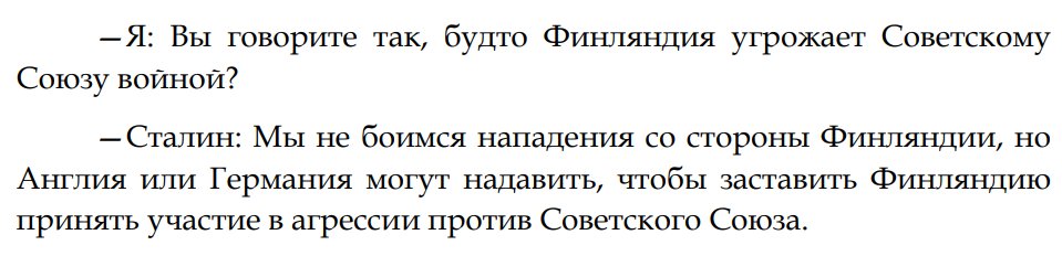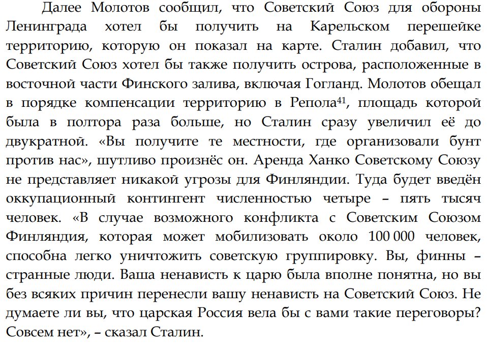 Паасикиви, надо сказать, в основном исходит из тезиса, что советская сторона вела переговоры in good faith, ну требования, мол, конечно, дикие, но они, скорее всего, сдержали бы свое слово. Вот это упоминание стран Балтии, с которыми мы прекрасно знаем, что потом стало, конечно, ставит под большой вопрос добрые намерения Сталина.