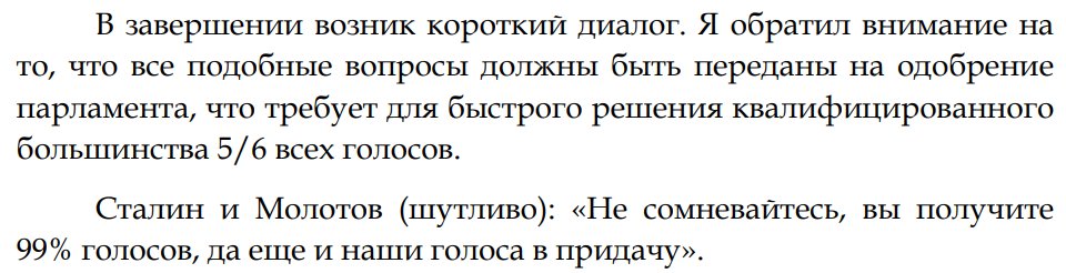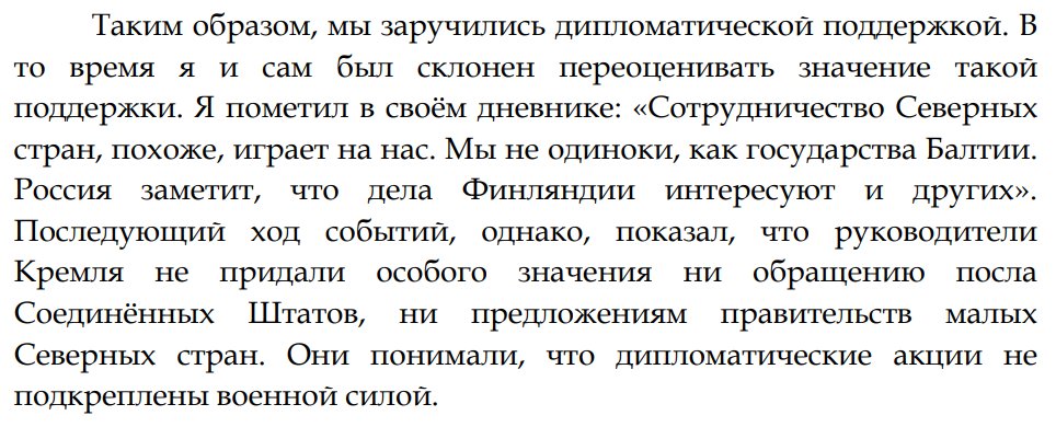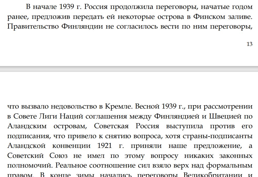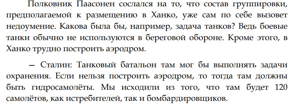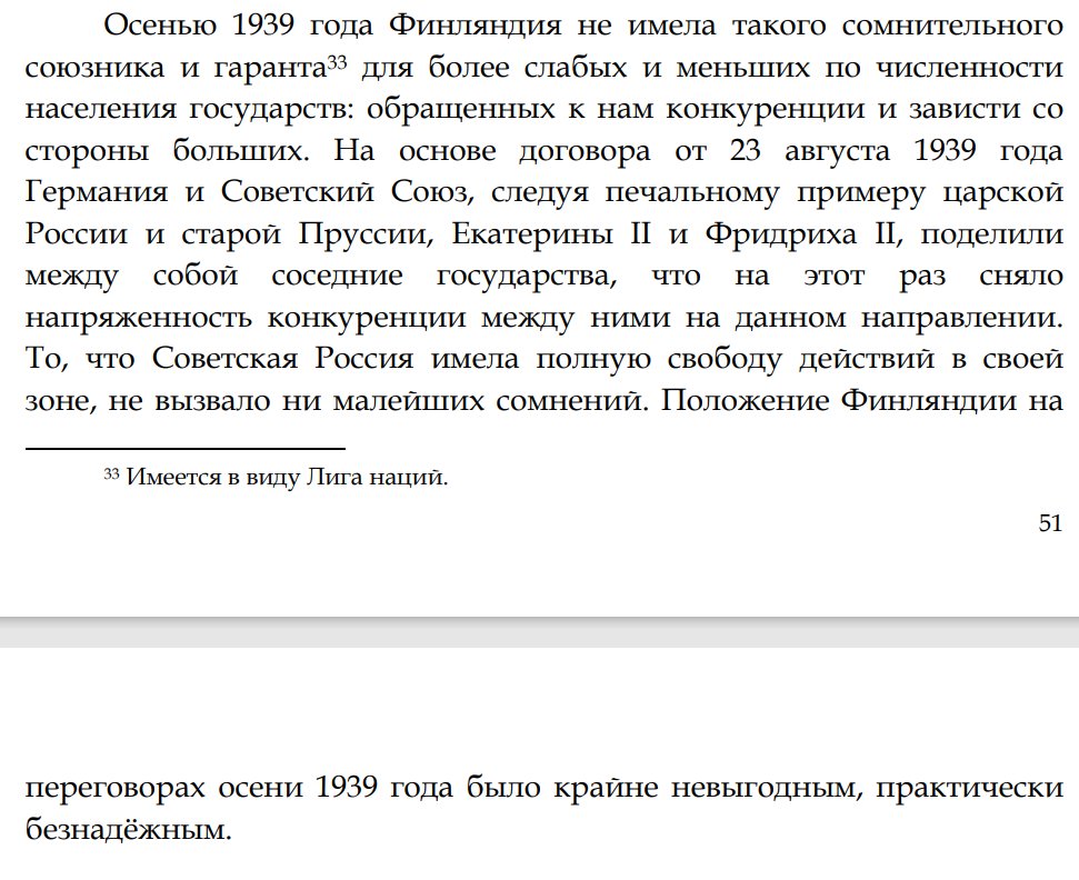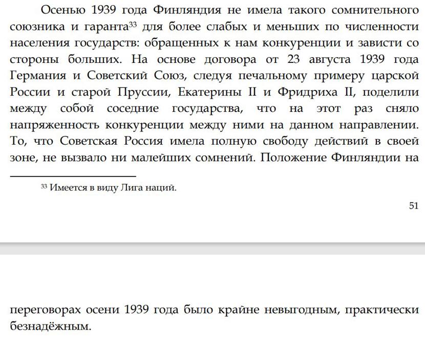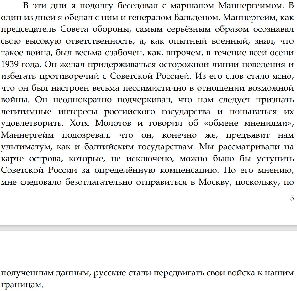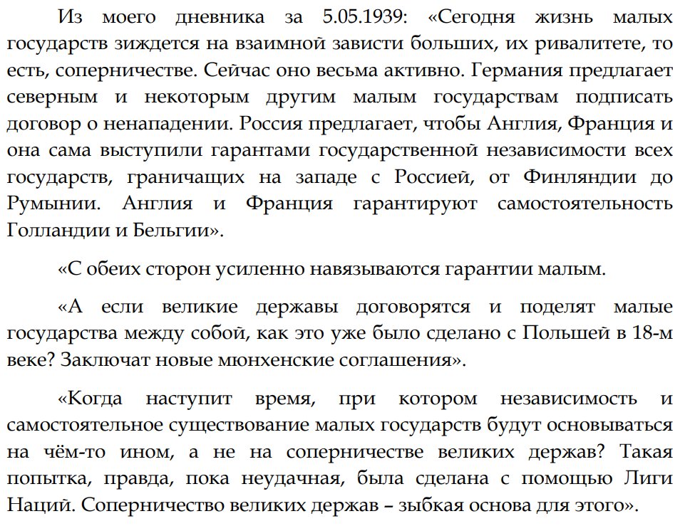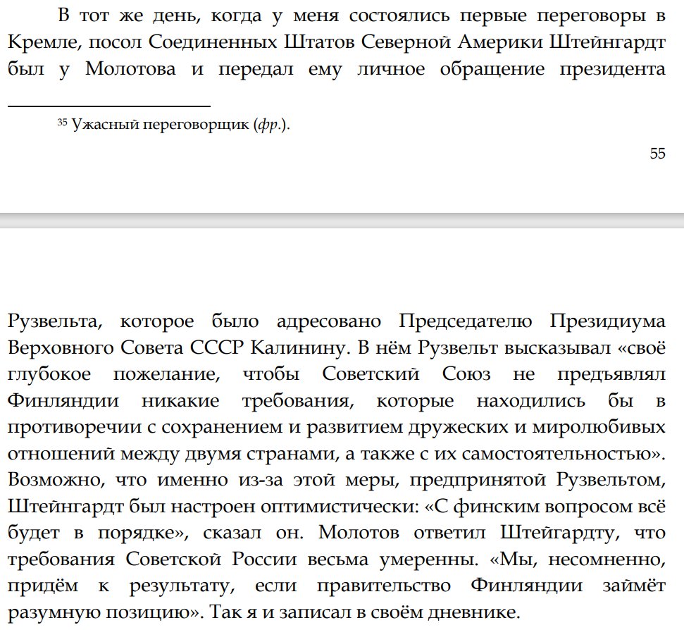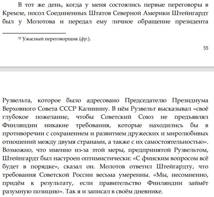Паасикиви, надо сказать, в основном исходит из тезиса, что советская сторона вела переговоры in good faith, ну требования, мол, конечно, дикие, но они, скорее всего, сдержали бы свое слово. Вот это упоминание стран Балтии, с которыми мы прекрасно знаем, что потом стало, конечно, ставит под большой вопрос добрые намерения Сталина.