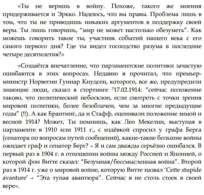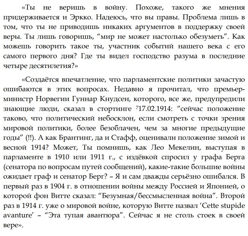 Паасикиви на это замечает, что в 1914 тоже все думали, что не настолько же мир ебанутый, чтоб воевать, и в конечном итоге маленьким государствам нужно думать самим за себя, а не полагаться на то, что крупные державы адекватные.