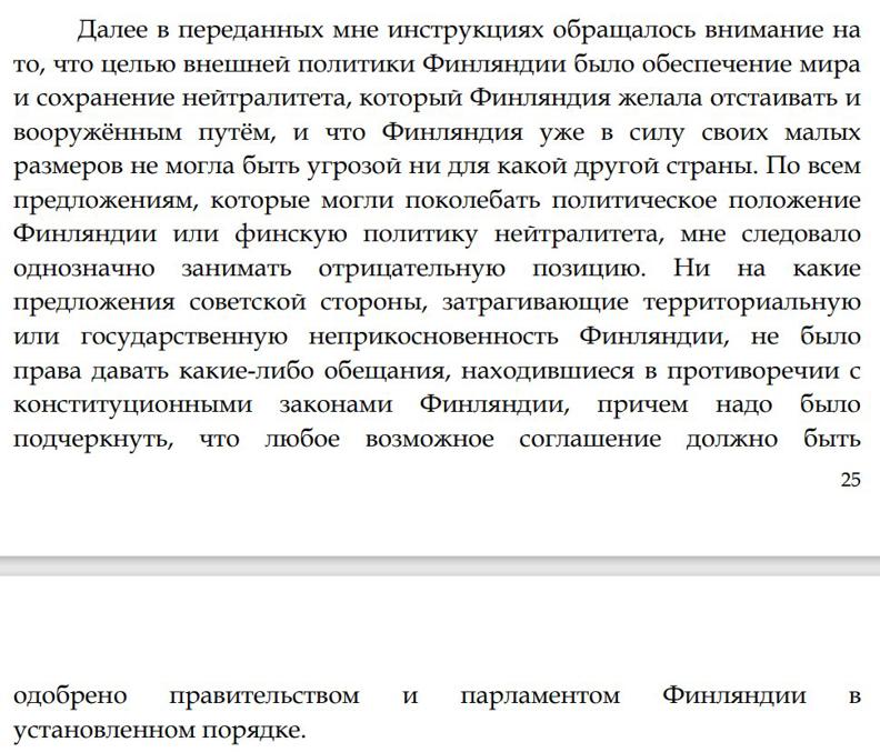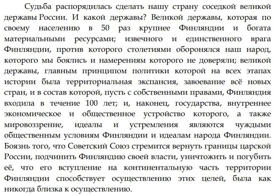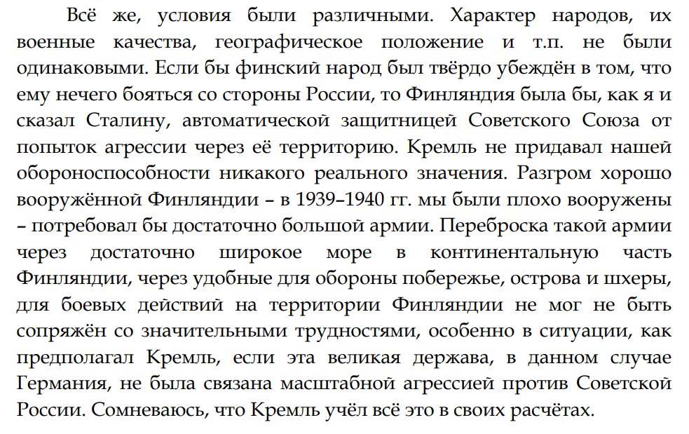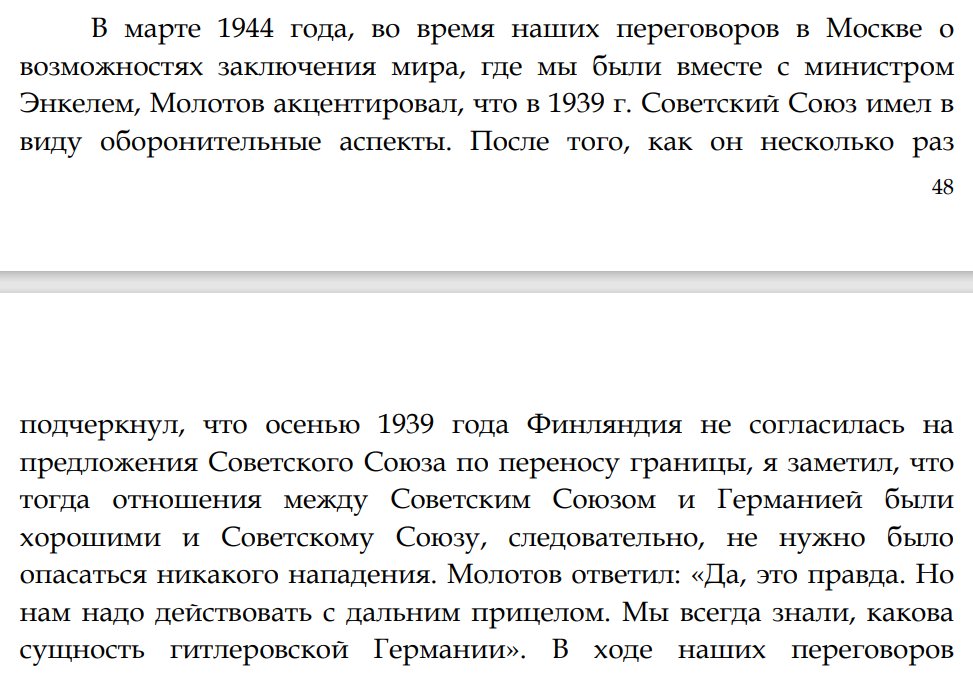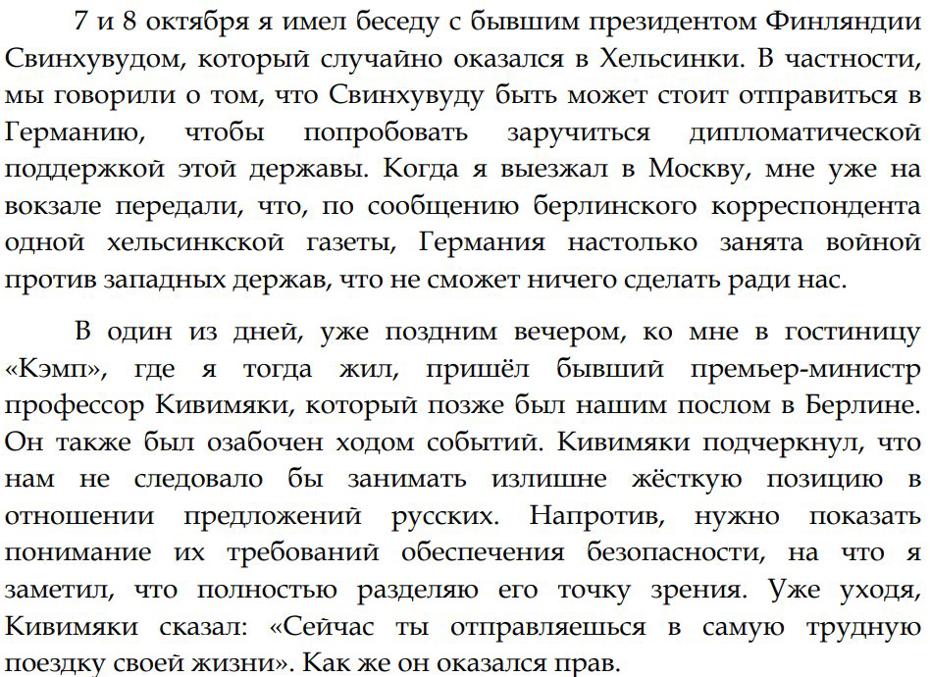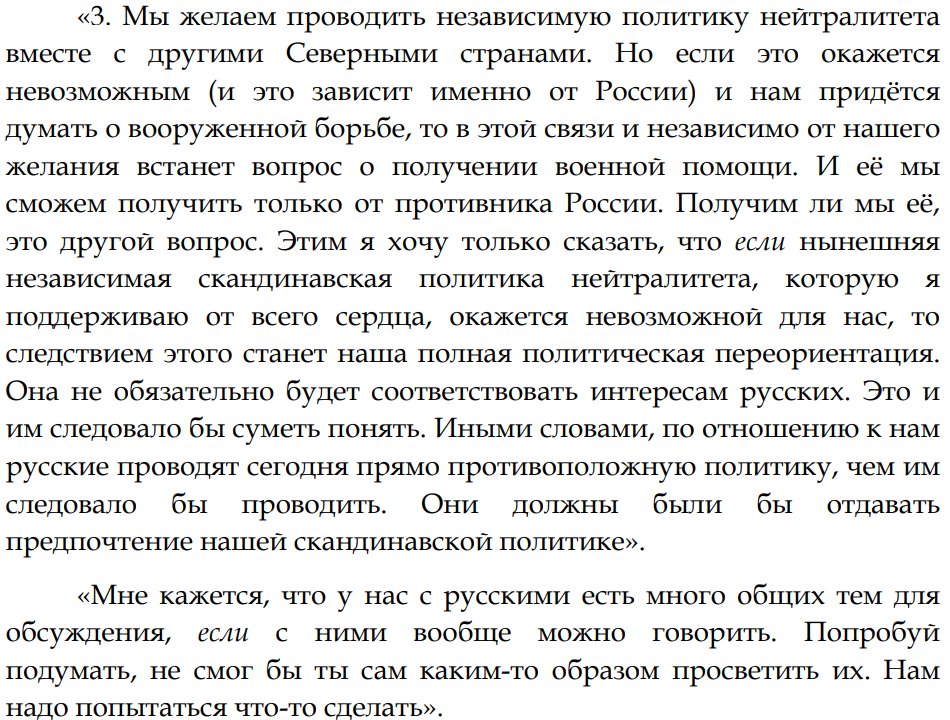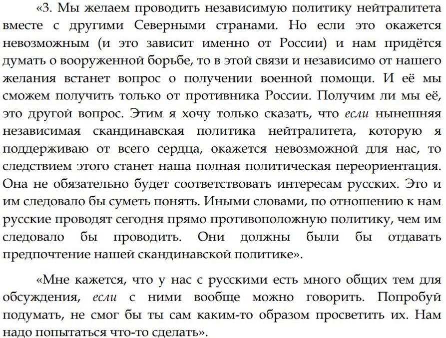 Дальше идут размышления Паасикиви. Он повторяет совершенно для финской стороны очевидный тезис, что для СССР в тысячу раз лучше было бы дружить с Финляндией и доверять ей.