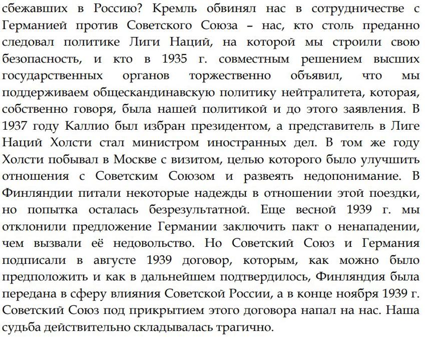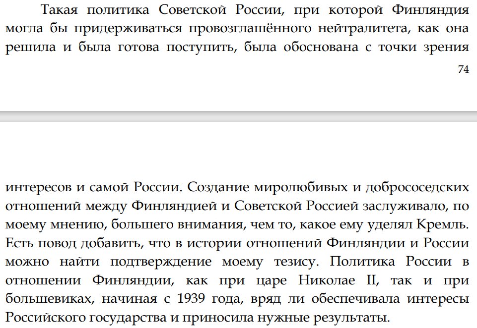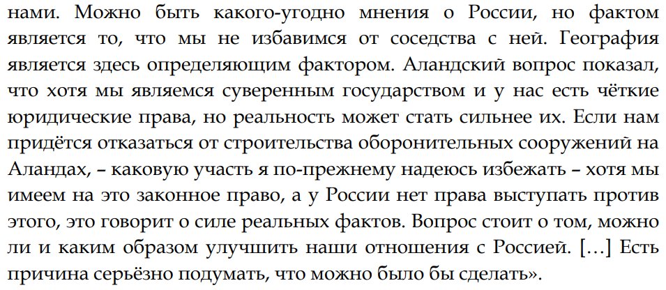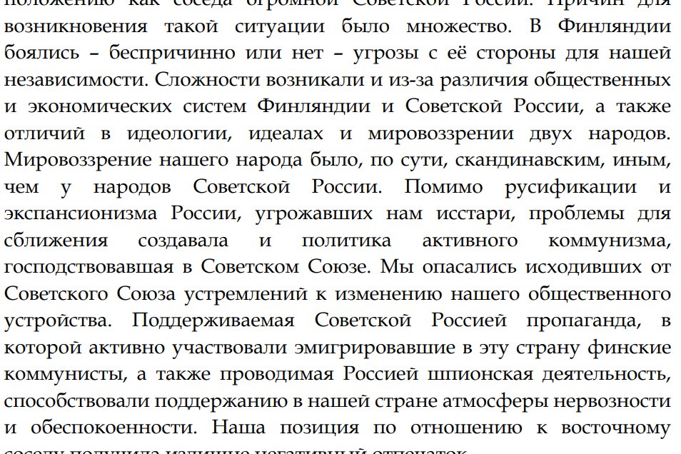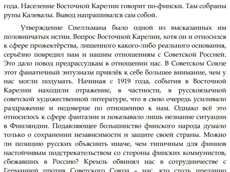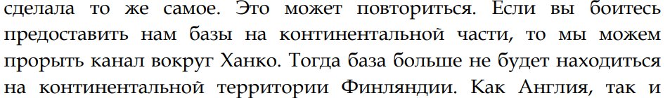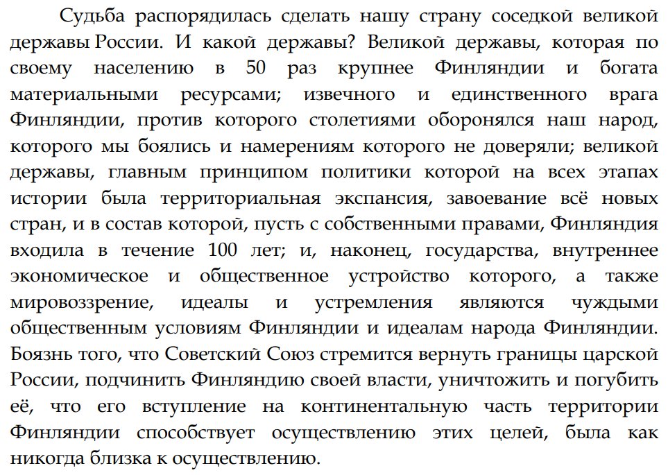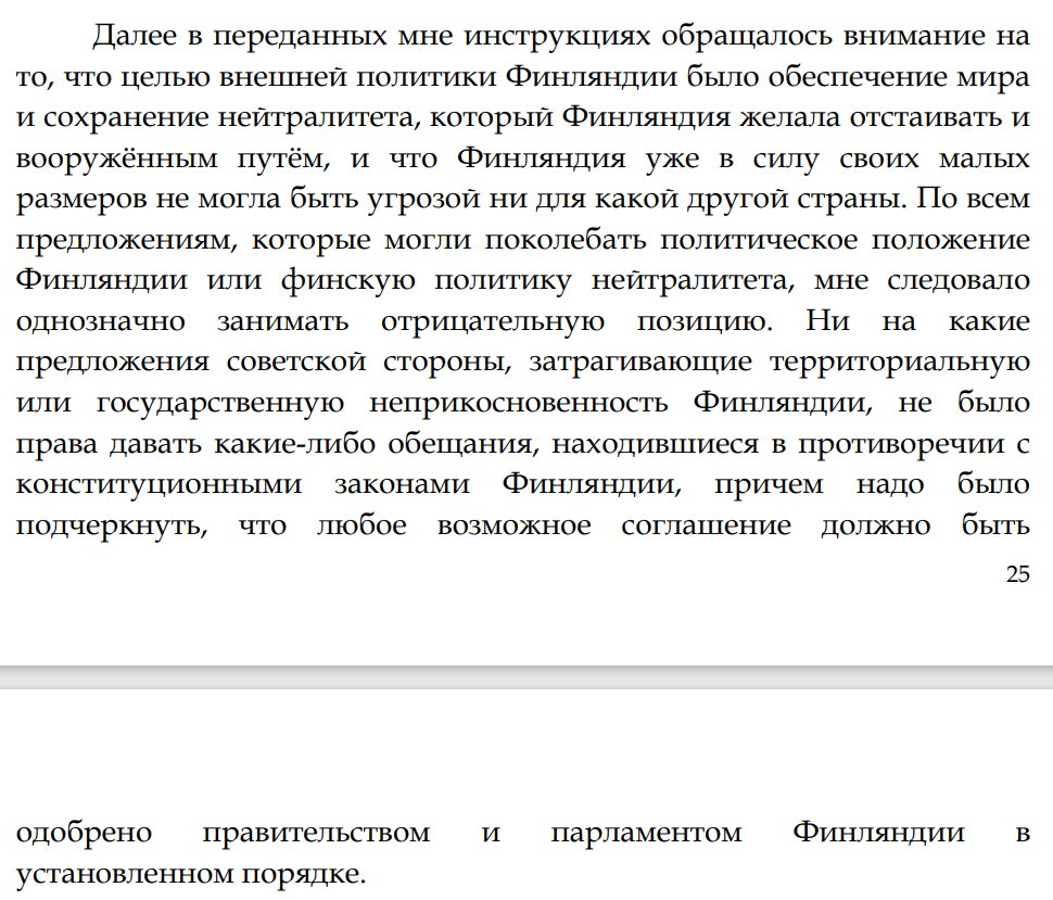 Дальше идут размышления Паасикиви. Он повторяет совершенно для финской стороны очевидный тезис, что для СССР в тысячу раз лучше было бы дружить с Финляндией и доверять ей.