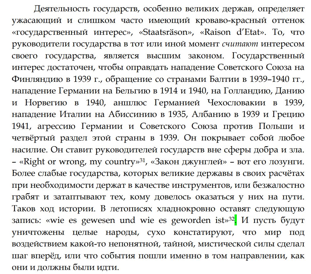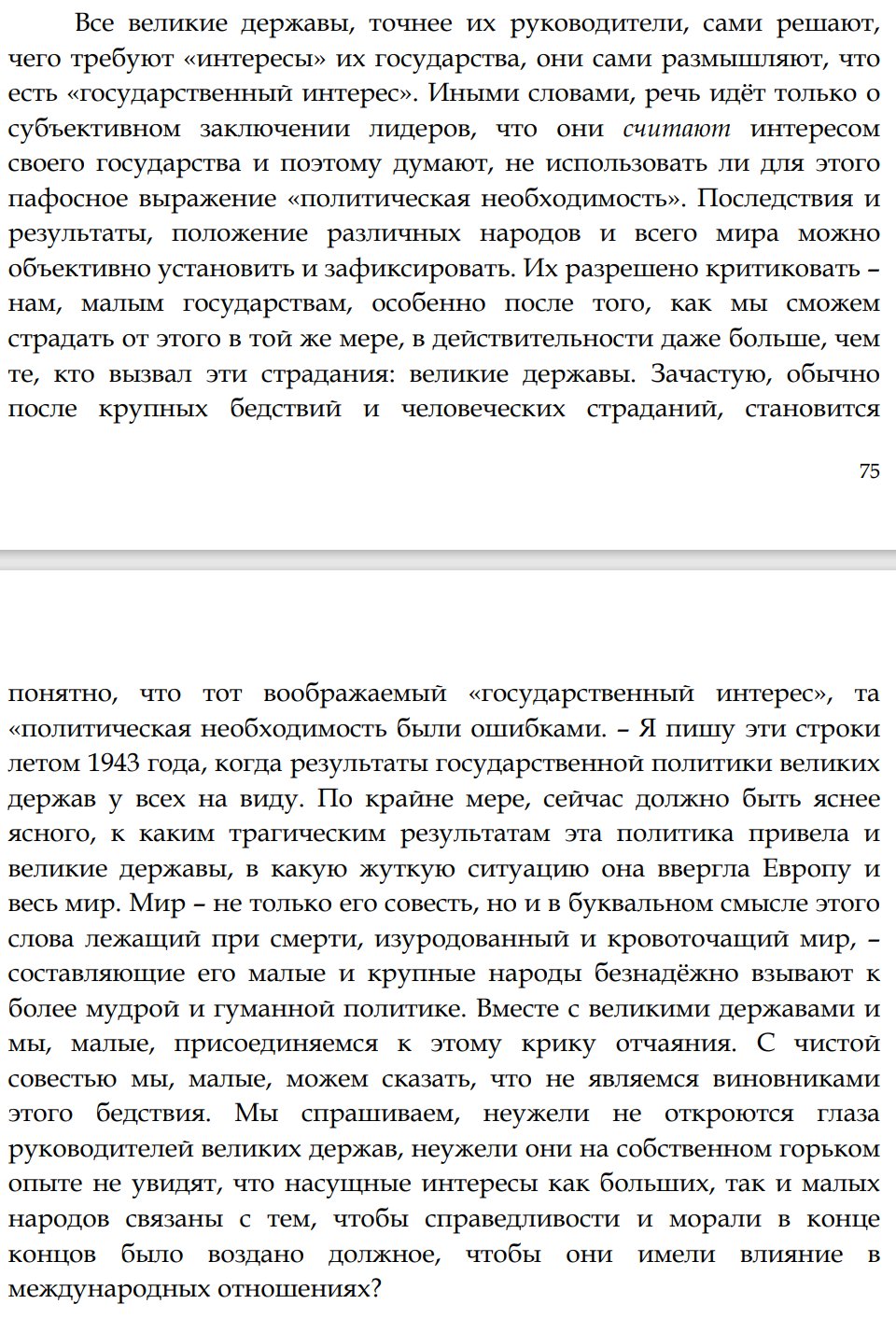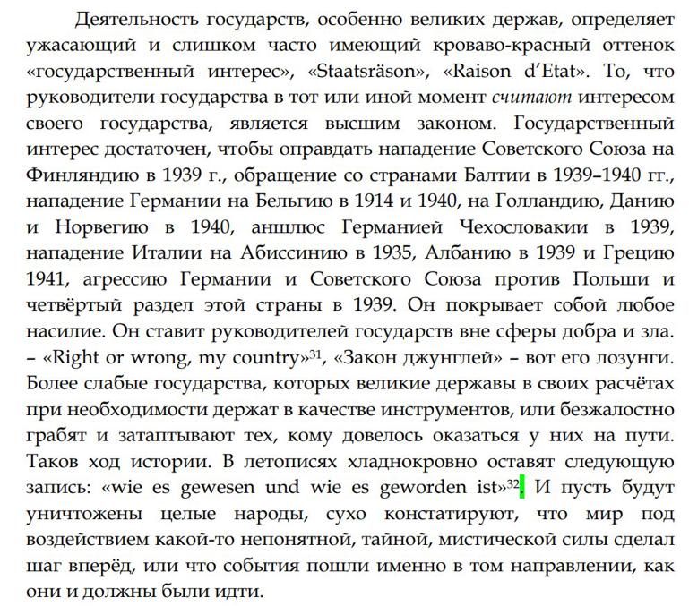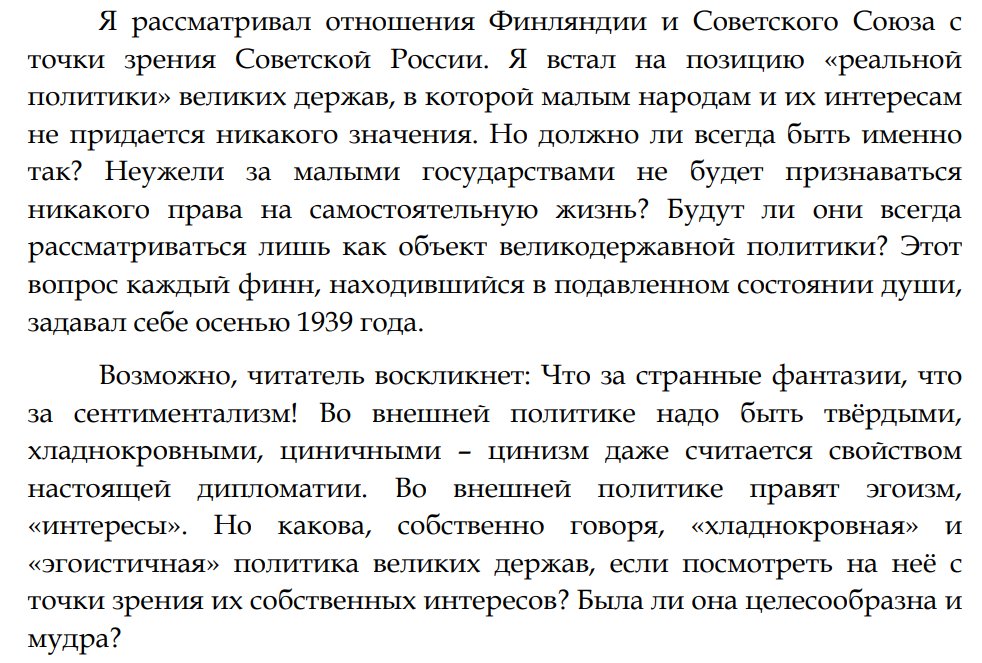 Паасикиви горько заключает, что если "государственные интересы" крупной державы — какими бы они иррациональными и абсурдными на самом деле не были — потребуют завоевания мелкой, то противопоставить этому, по сути, особо нечего.