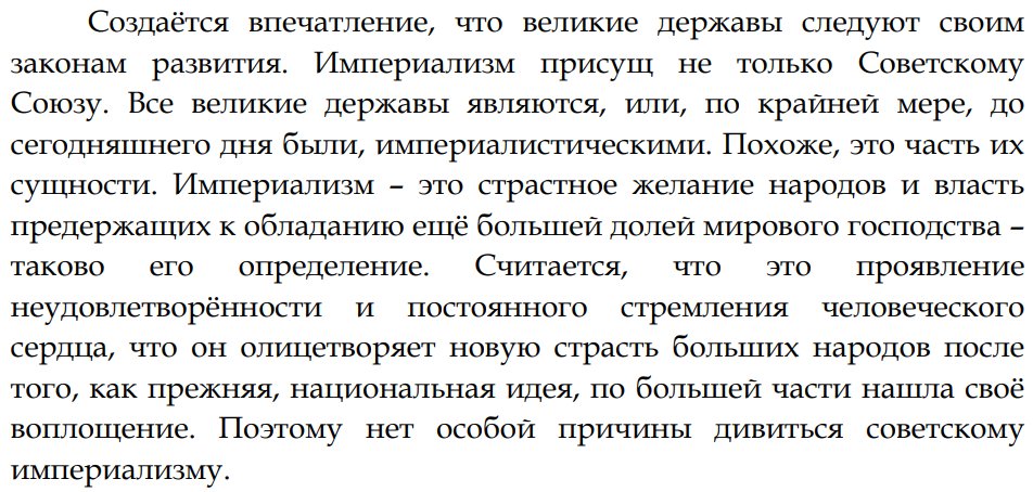 Паасикиви тут замечает, что на тот момент для больших держав империализм был в принципе обычным делом, и не считает, что для российского и советского империализма нужны какие-то особые объяснения.