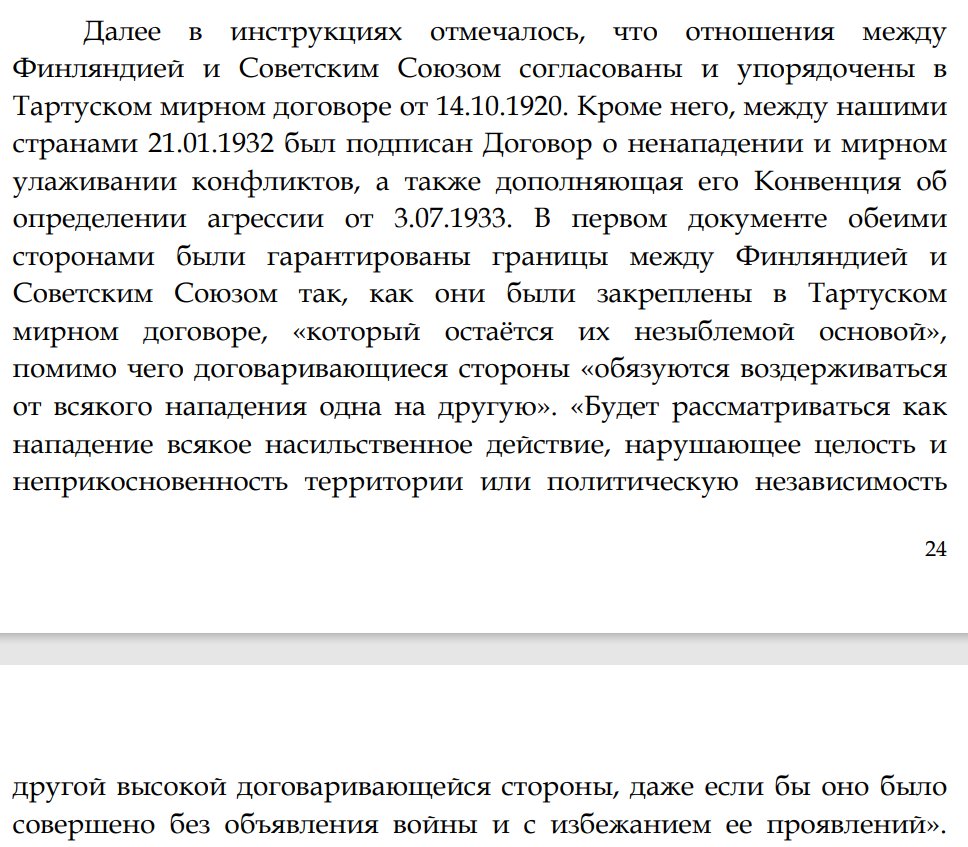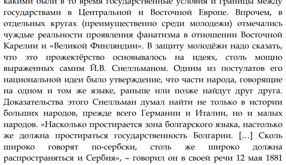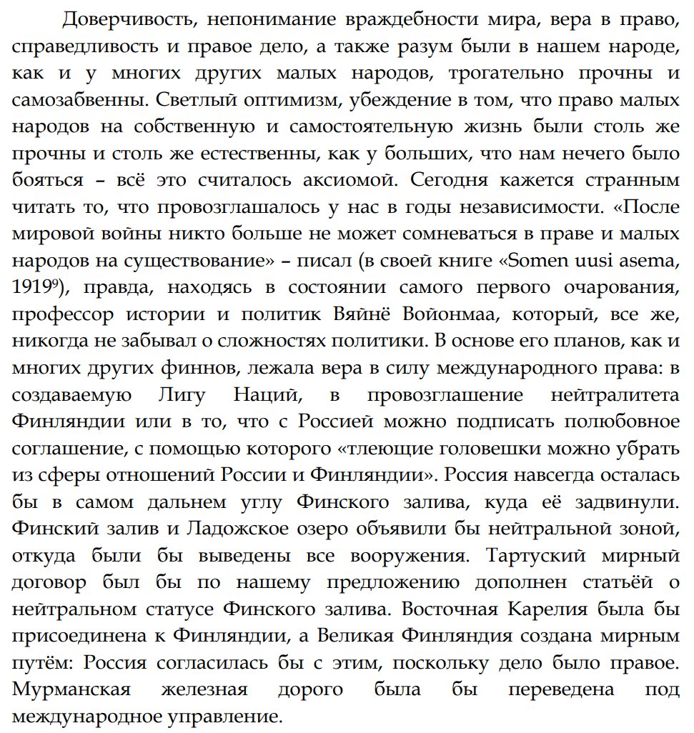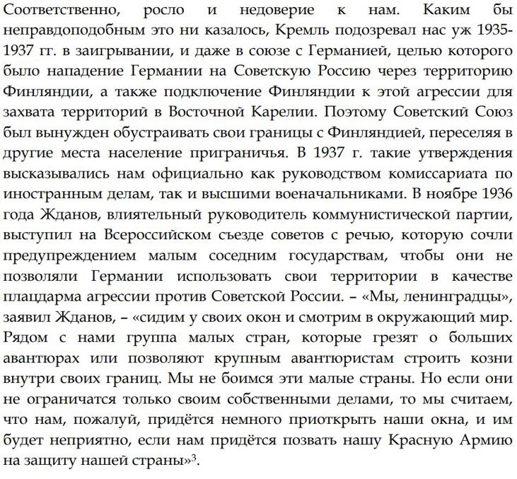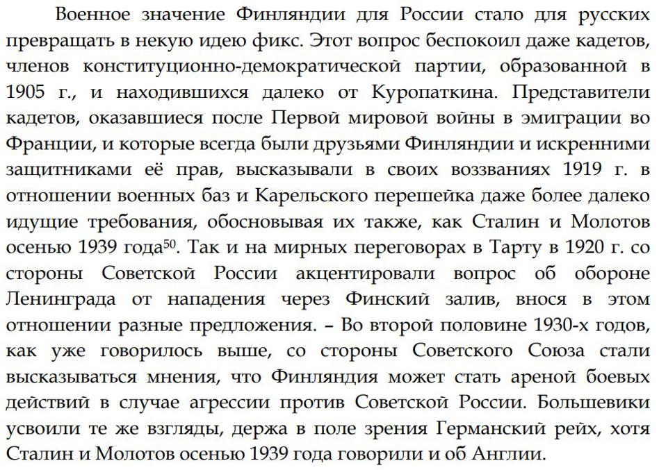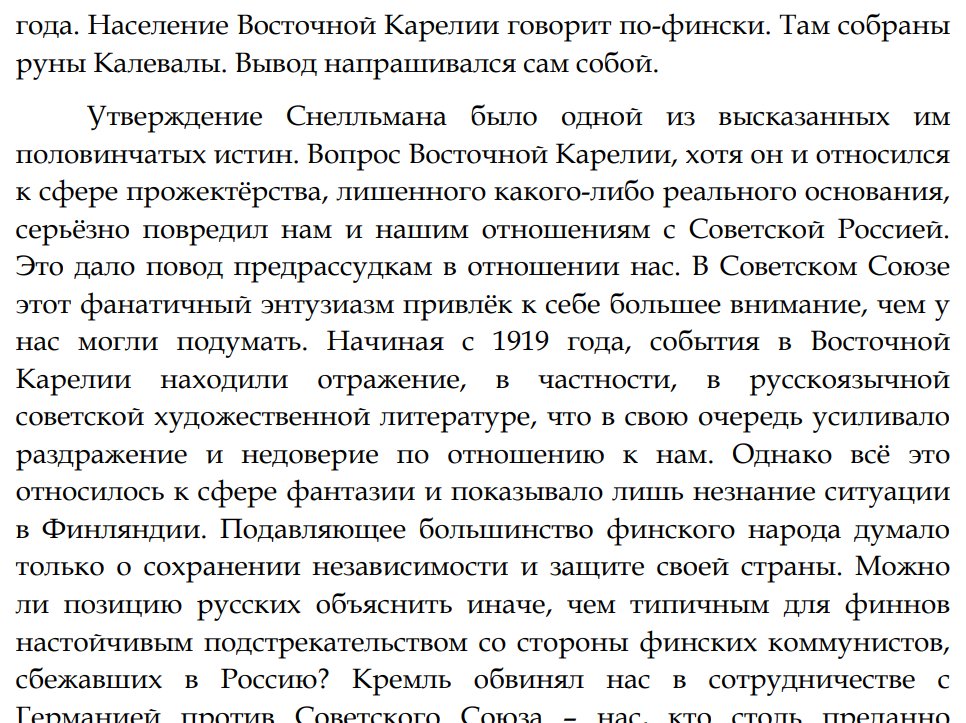 Он признает, что в Финляндии были и националистические настроения на освобождение карелов и проч., являвшиеся логичным продолжением идеологии Финляндии как государства финнов. Правильно это или нет, они не имели широкой поддержки к 1930-м, но давали СССР оружие для пропаганды.