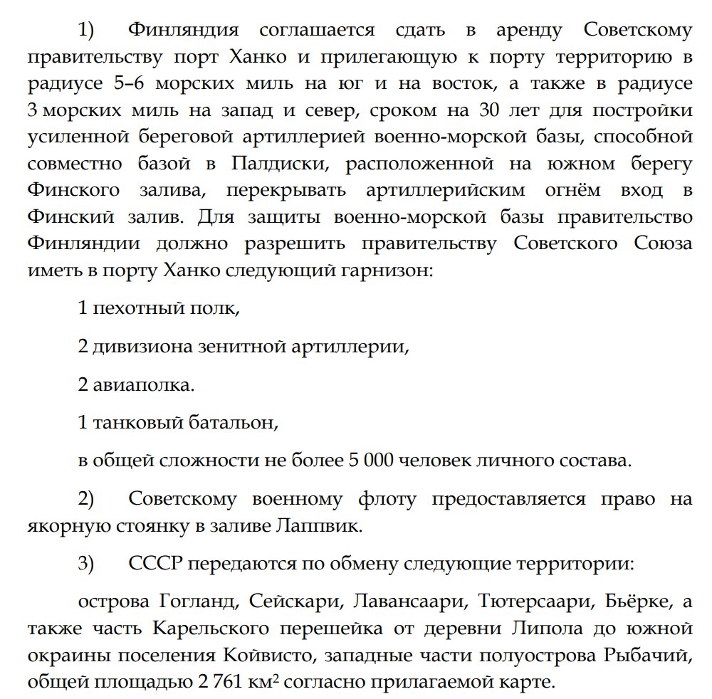 Ключевой вопрос об аренде Ханко встал уже сразу. Говорили о 4-5 тыс. человек. По итогам Зимней войны СССР разместил таки там базу, с порядка 30 тыс. человек. Но и такую группировку в 1941 Финляндия с минимальными усилиями оттуда выпиздила — так что зачем все было?..