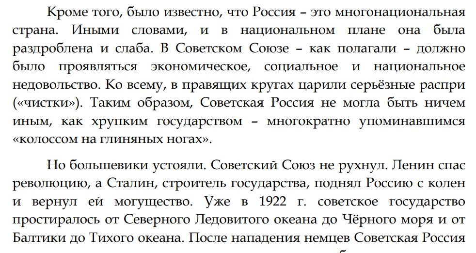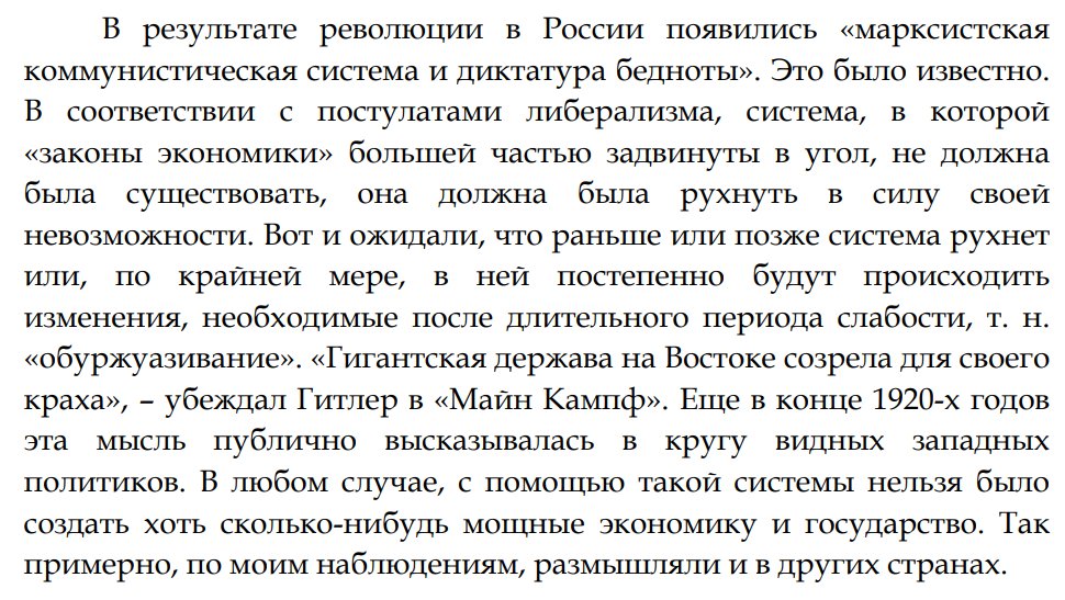 Порассуждав про сущность революции и сравнив кровавые революции в России и Франции с мирными в Британии и Швеции (хз даже что он называет революцией в Швеции), он все же приходит к выводу, что фундаментально СССР остался империей, в которой в принципе нет и понятия о свободе.
