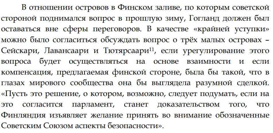 Финская сторона, разумеется, изначально отвергла все предложения, кроме передачи трех мелких островов на востоке Финского залива, на что Паасикиви уполномочили в Хельсинки. Советская, разумеется, не согласилась.