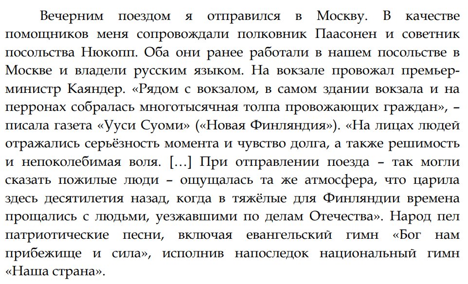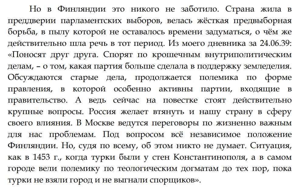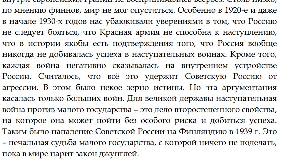 Эти мемуары были опубликованы после его смерти в 1956, а по-русски — аж в 2021, и выложены бесплатно на сайте фонда "Общество Паасикиви". Поцитирую то, что в глаза бросается; конечно же, вся эта предыстория Зимней войны — просто отражение предыстории 2022, и мотивация СССР, по крайней мере то, что говорит лично Сталин, очень похожа на мотивацию России и Путина — параноидальная, но в их собственной системе координат логичная. Красной нитью через рассуждения Паасикиви проходит мысль, что неважно, прав или неправ СССР, важно то, что он держит дубину.