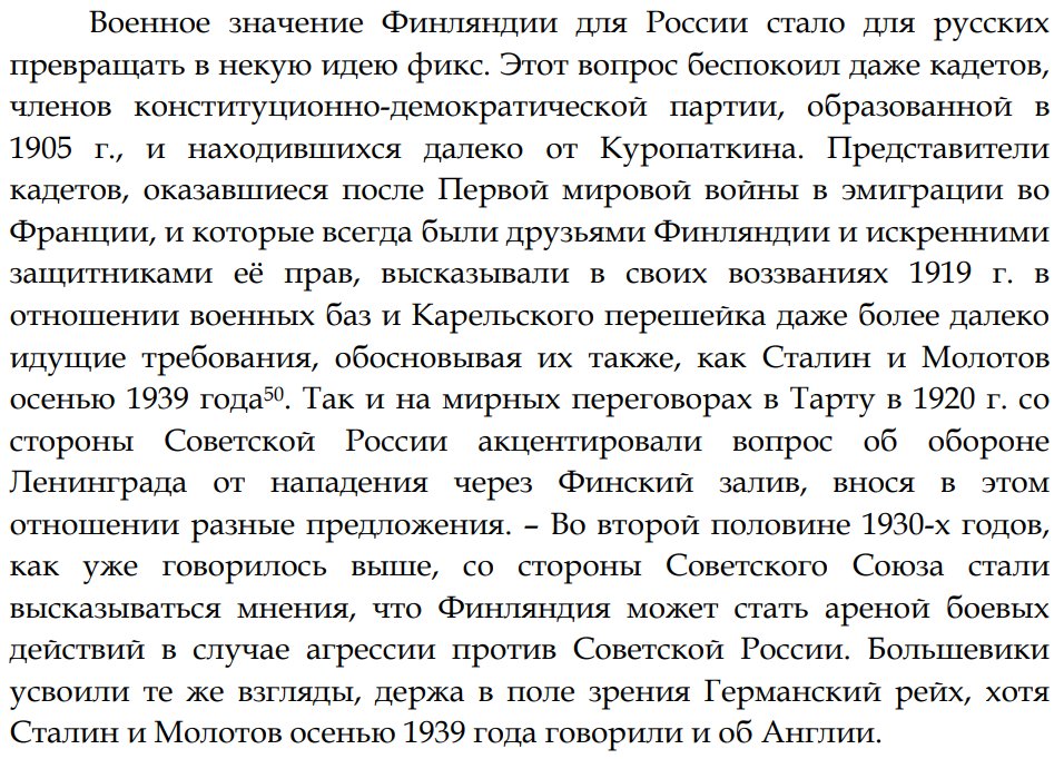 Вот важный момент. Это не идея-фикс была одного Сталина, так же как и сейчас не из-за одного Путина Россия воюет. Даже умеренная русская эмиграция считала, что России нужны территории Финляндия.