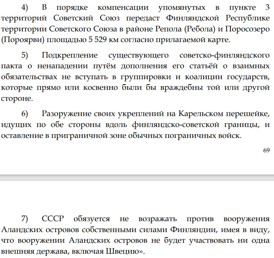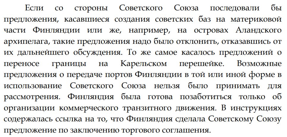 В итоге Паасикиви поехал на эти переговоры, получив указания придерживаться весьма жесткой линии. Земли, где живут финны, отдавать нельзя. Финляндия нейтральна. Мир с СССР установлен в 1920, есть договор о ненападении от 1933. Базы СССР на территории Финляндии неприемлемы.
