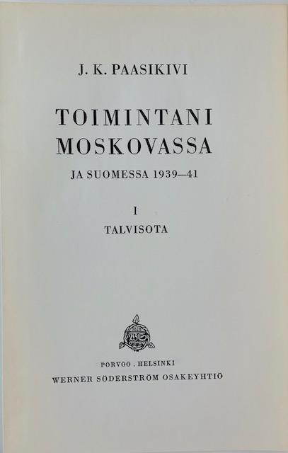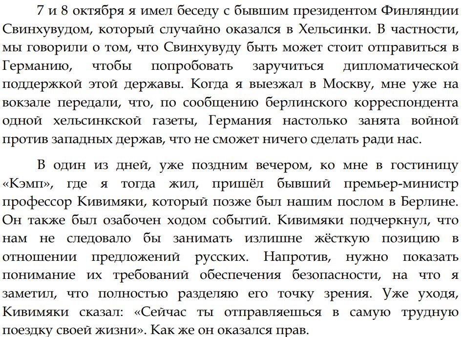 Залип на известную книгу Ю. К. Паасикиви "Моя работа в Москве и Финляндии в 1939-1941" (Toimintani Moskovassa ja Suomessa 1939-41). Паасикиви, опытный политик и президент в 1946-1956, в 1939 перед Зимней войной возглавлял переговоры с СССР, в 1940-1941 был послом Финляндии в Москве. Книга свободно доступна на сайте Общества Паасикиви (Paasikivi-Seura) на русском языке.