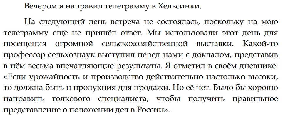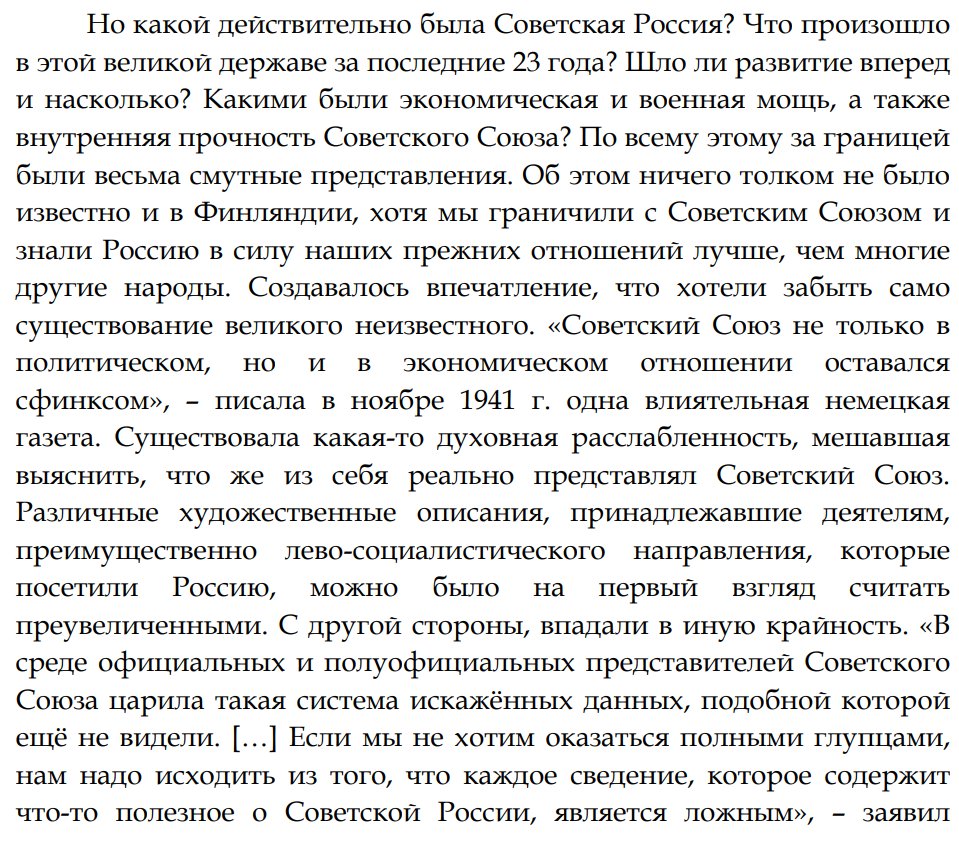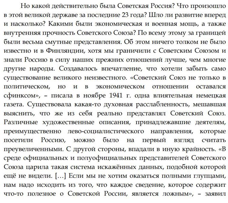 До этого было все про положение Финляндии. Дальше Паасикиви большую главу отводит на рассмотрение того, чем же на тот момент являлась Советская Россия. Это интересная внешняя перспектива на СССР, бывший тогда особенно закрытой страной.