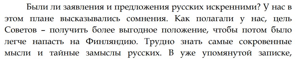 Таннер, друг Паасикиви, в частности, вообще не верил в то, что Россию интересуют какие-то завоевание, помимо валидных интересов безопасности. Но в любом случае ну не настолько же они ебанутые, чтоб воевать!