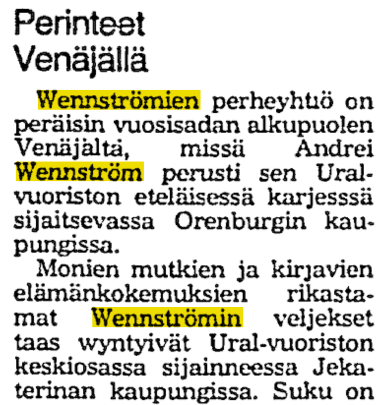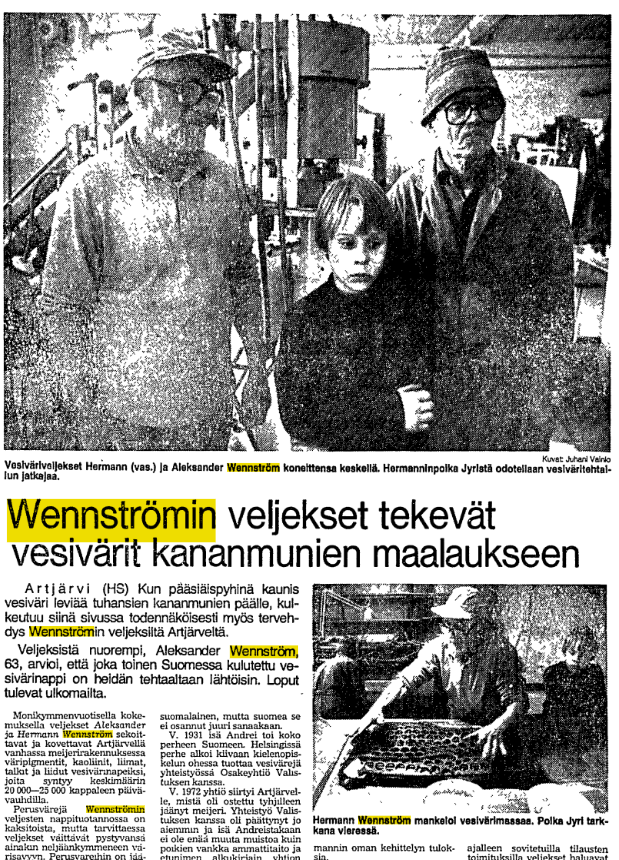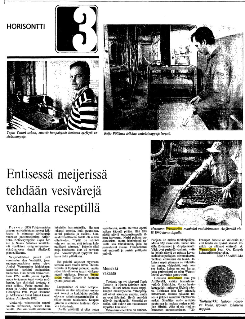 Фабрика долгое время находилась в Хельсинки и принадлежала семье Веннстрёмов; в 1970-х переехали в Артъярви и в 1980-х продали нынешнему хозяину, Тапио Таттари. Это уже не так интересно, интересно, откуда этот Веннстрём в Екатеринбурге оказался. Выяснить удалось мало, на генеалогических сайтов нужных Веннстрёмов нет, но в архивах HS в старых статьях, упоминавших фабрику, удалось найти несколько крупиц информации. В 1978 году писали, что Андрей Веннстрём начал работать в Оренбурге, а в Екатеринбург переехал позднее.
