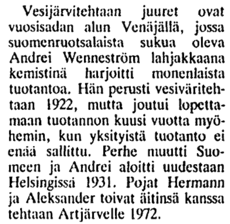 Акварель делают на фабрике Wennström в Артъярви, где-то в 110 км на северо-восток от Хельсинки. Все честно, сами делают. Крошечная фабрика, 6 человек и менее миллиона оборота. Утверждают, что они единственный производитель акварели в Северных Странах. И в разделе про историю на сайте или, к примеру, в статье Yle от 2011, пишут, что основал фабрику некий Андрей Веннстрём из... Екатеринбурга! В 1922 начал производство акварели в Екатеринбурге, и в 1931 переехал в Финляндию.