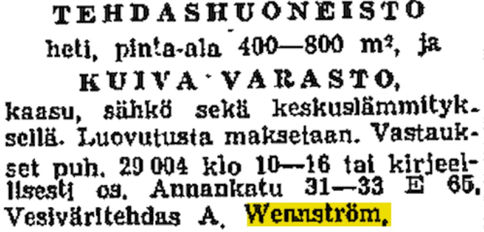В статье HS 1983 года пишут, что Андрей Венстрём, из финско-шведского рода, был одаренным химиком и имел в Екатеринбурге заводик в 1922-1928 годах, был вынужден закрыть, когда частное производство в России запретили. Т. е. Венстрём был предпринимателем-нэпманом.