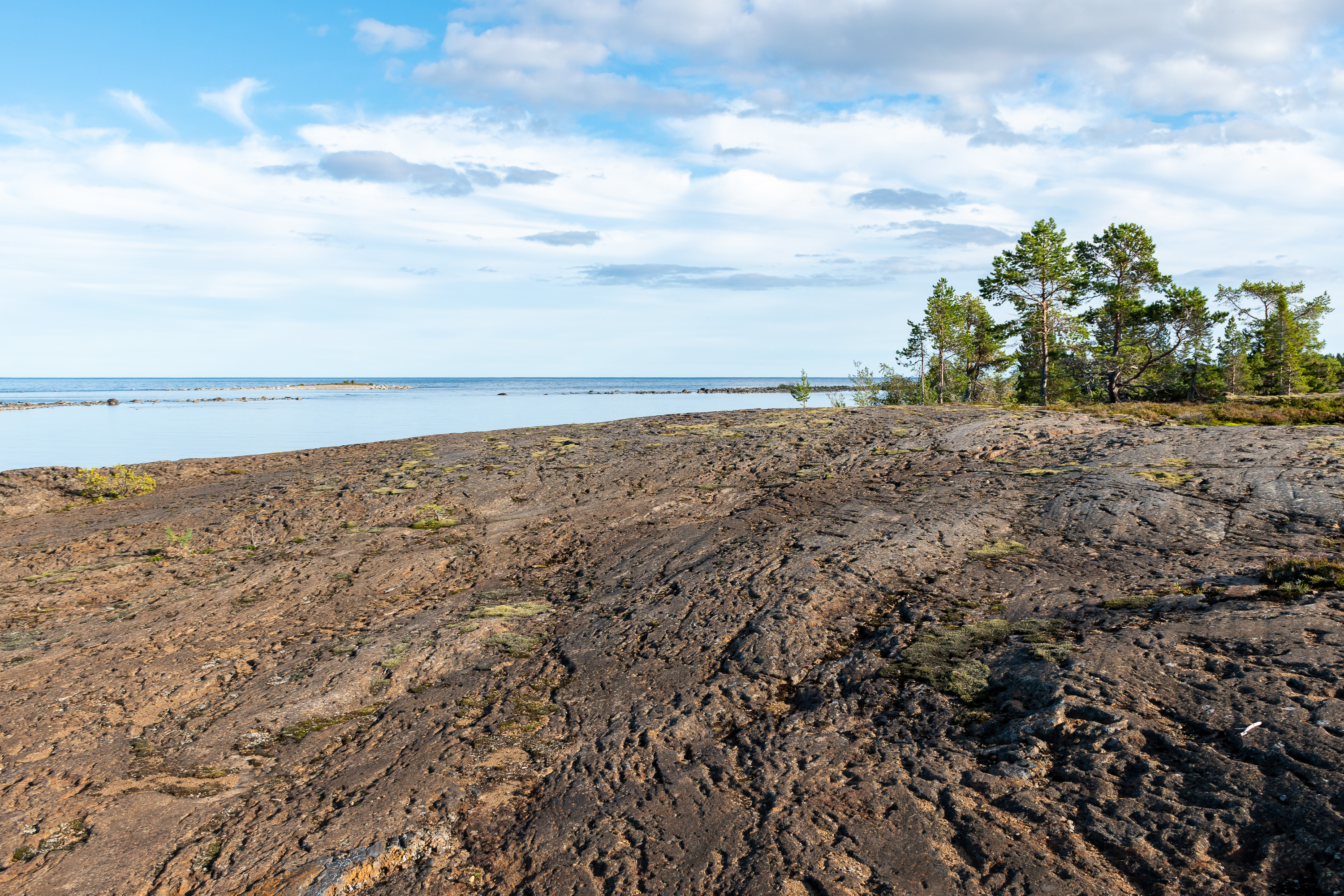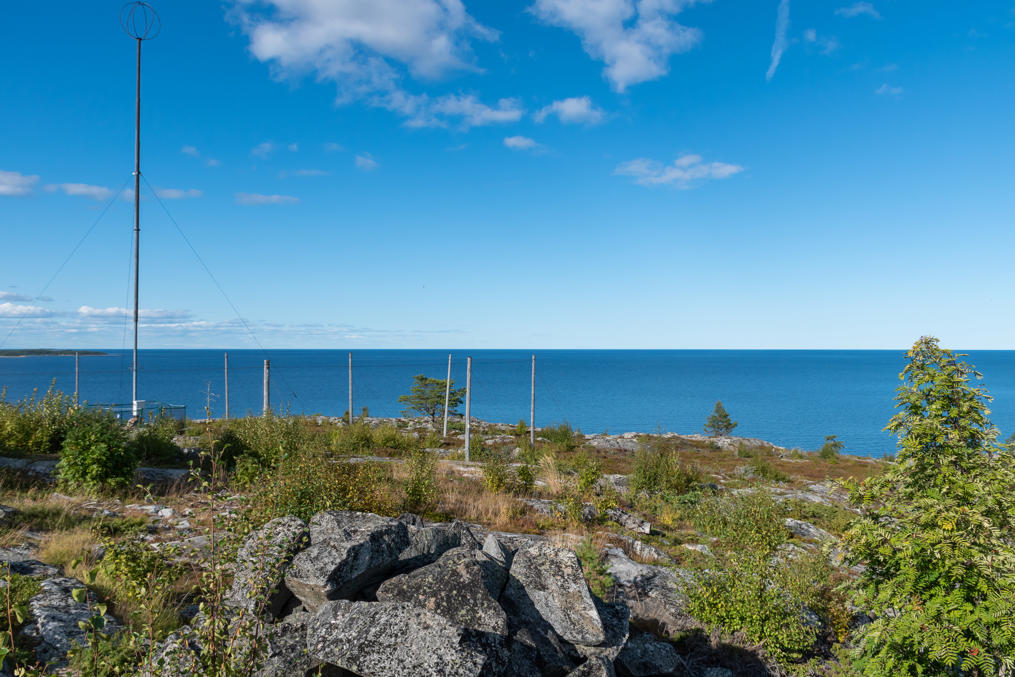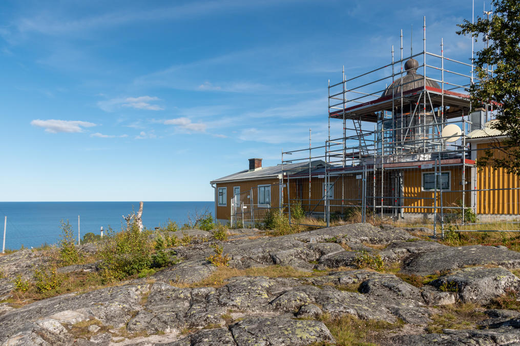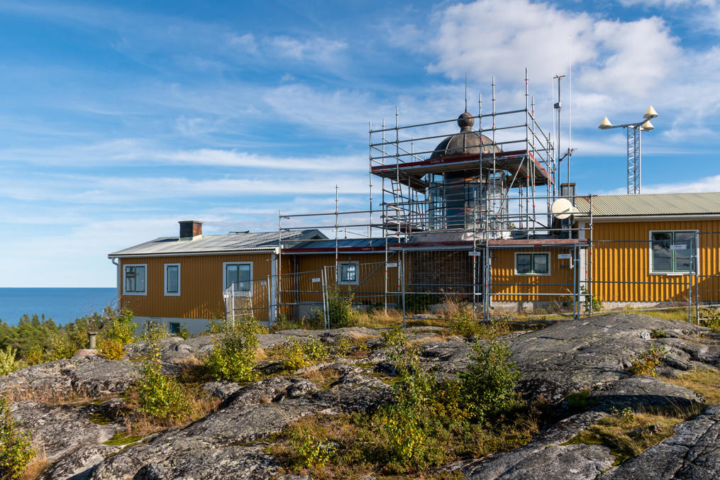 Мыс поднимается из моря примерно на 50 м. На финской стороне Ботнии нет и близко таких скал. На скале стоит маяк (ремонтировавшийся, когда я тут был в августе 2022) — башни для него строить нужды не было, так что он маленький совсем.