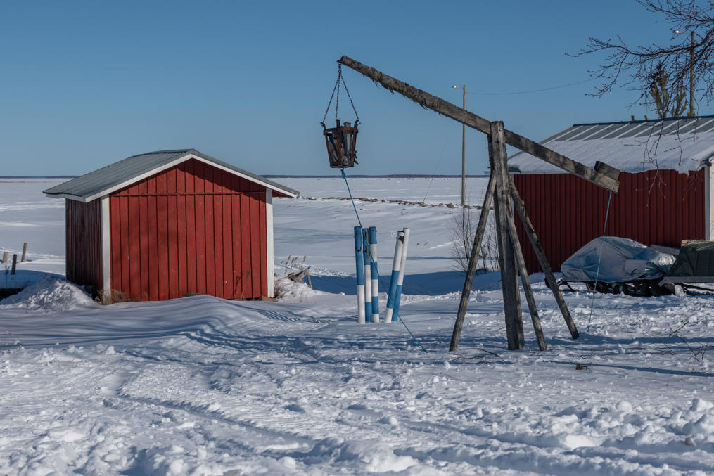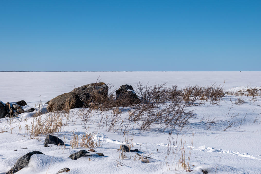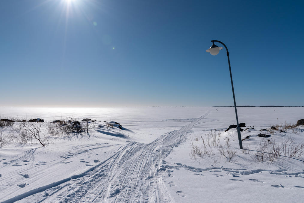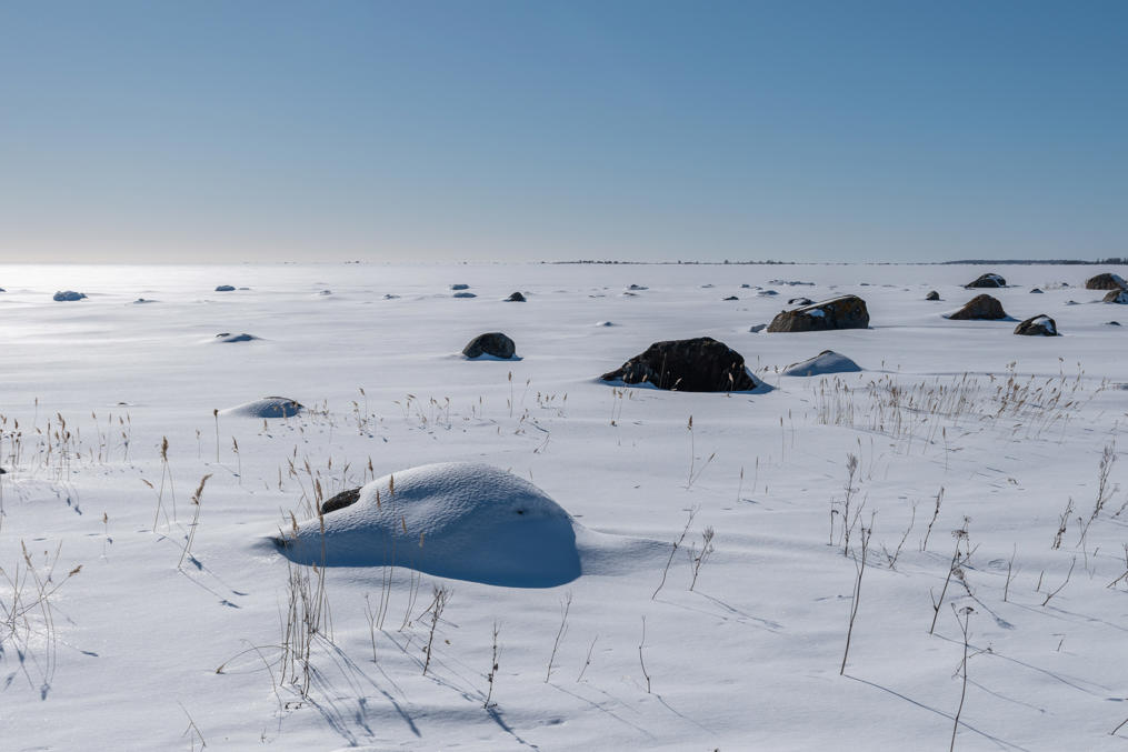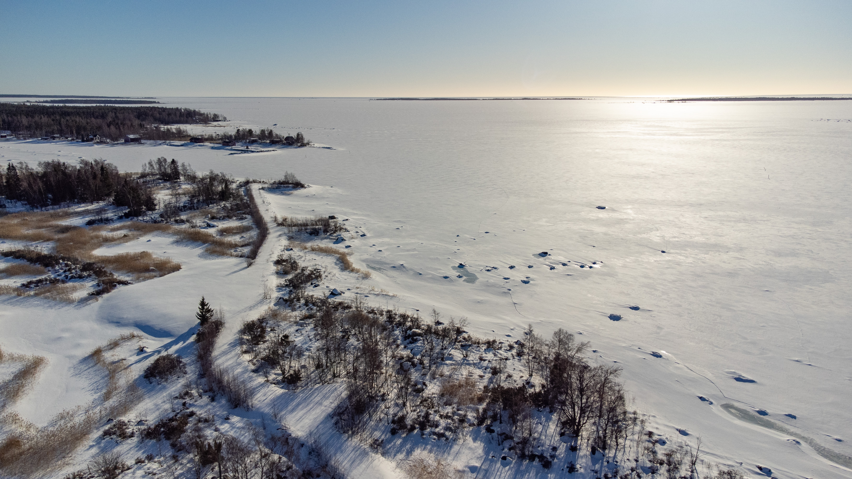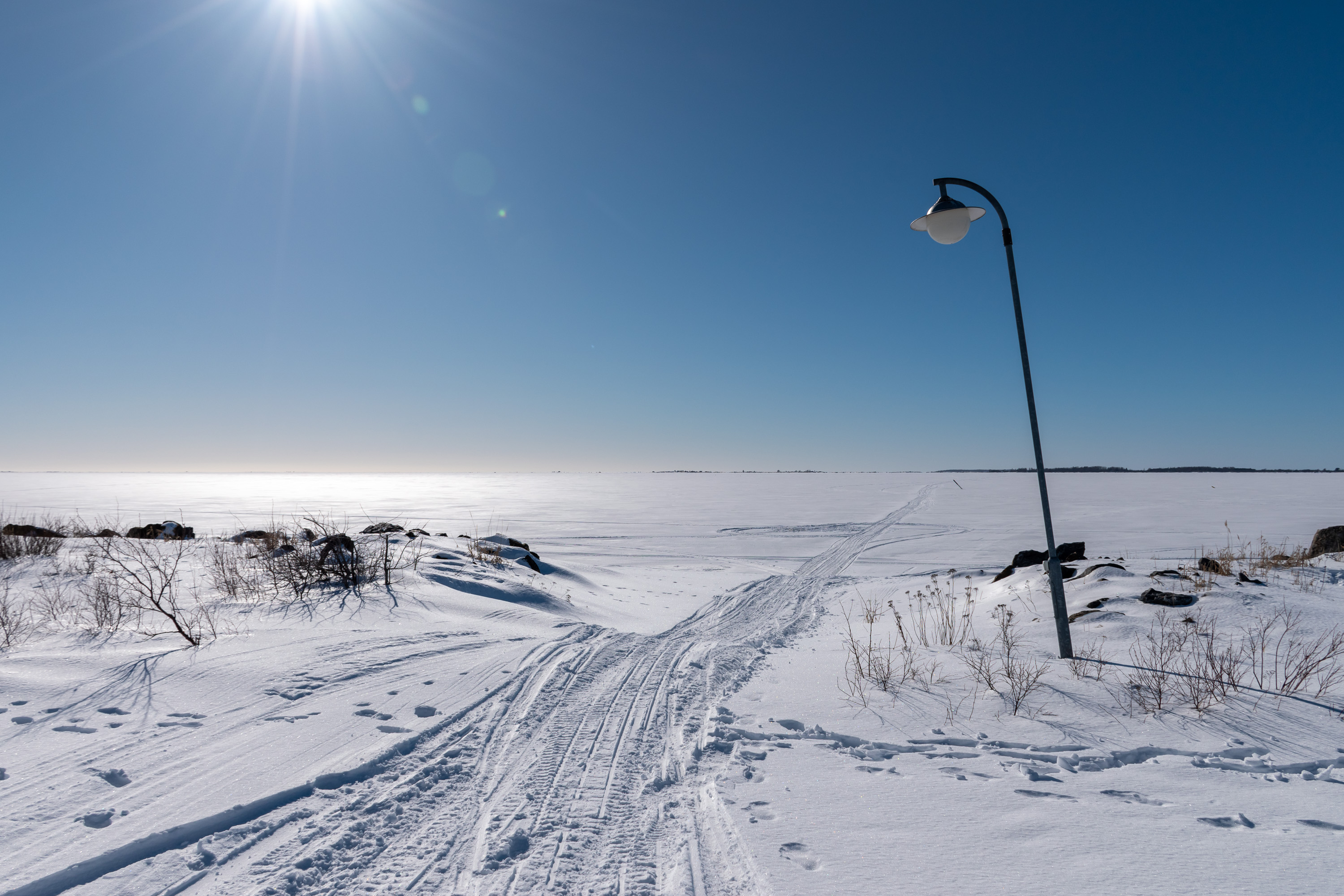 13. Фото на самом деле мартовские и весной уже немного пахло, но лед еще не показывал, конечно, абсолютно никаких намеков на таяние. Полоску открытой воды на горизонте можно только с высоты увидеть на западе, и то только потому, что солнце там отражается. У берега местами растет облепиха — главная ягода ботнических берегов.