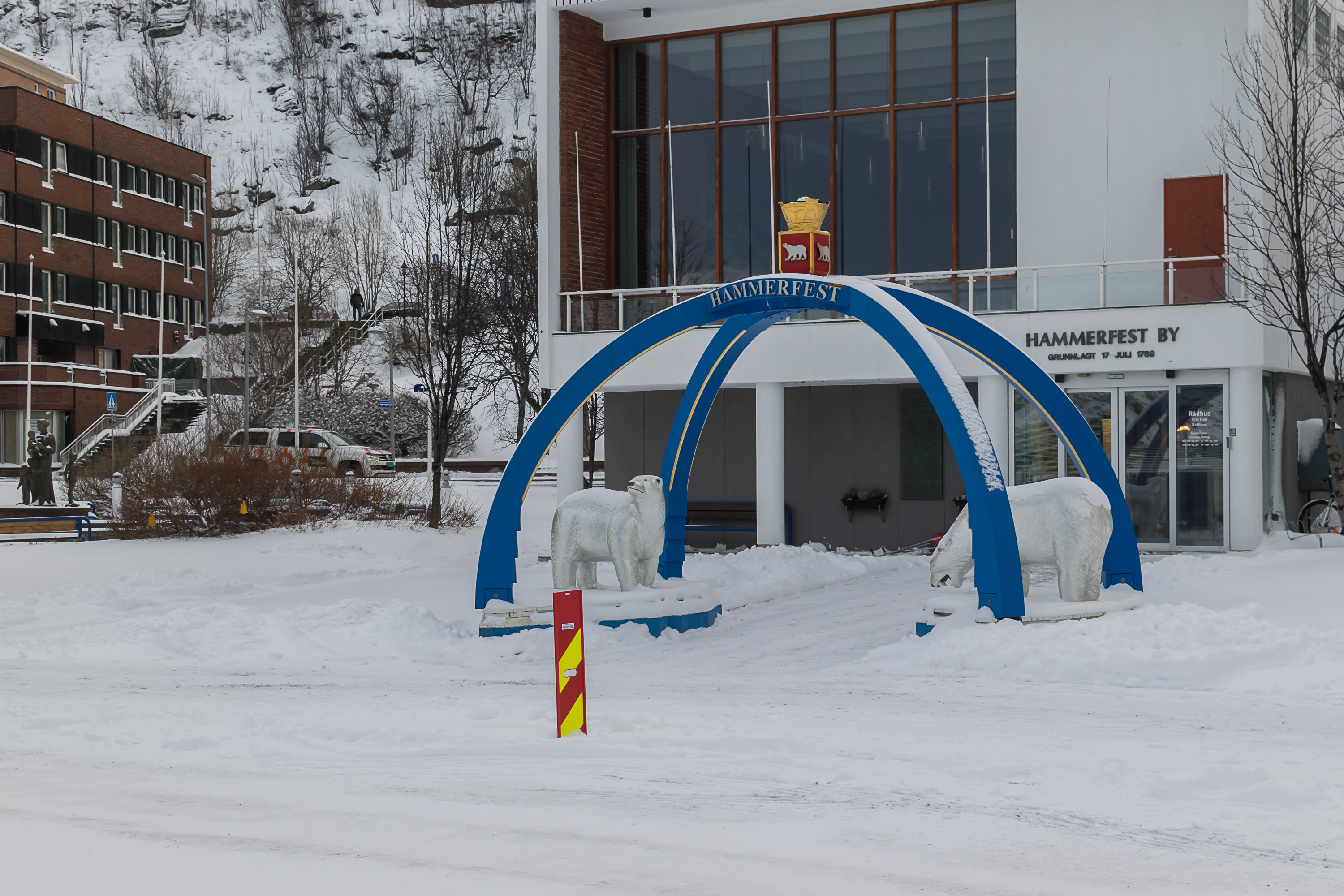 На гербе здесь даже нарисован белый медведь зачем-то, хоть они и не водятся в континентальной Норвегии. Климат в Хаммерфесте, как и в остальной Северной Норвегии, не столько холодный, сколько снежный и буйный.