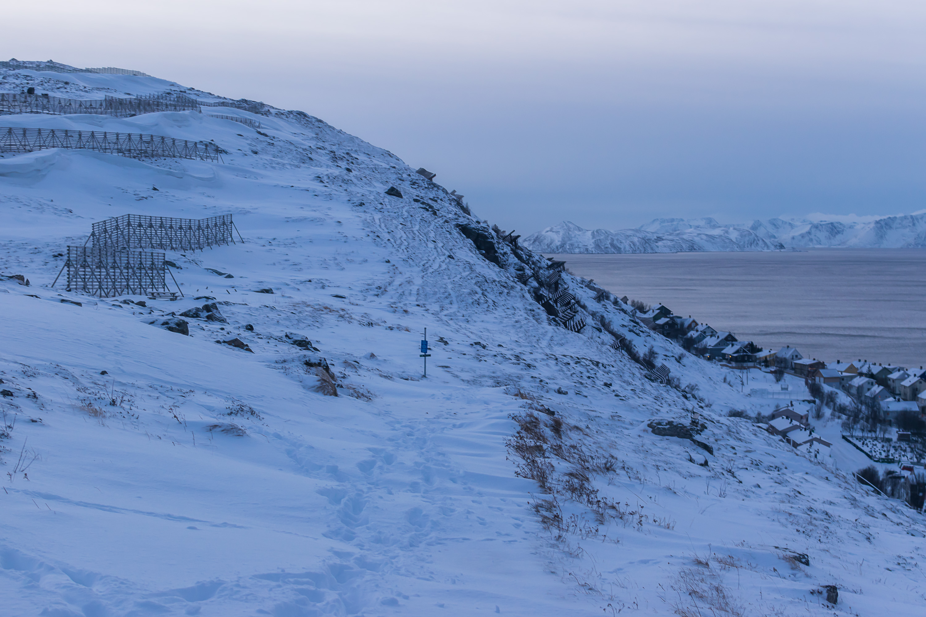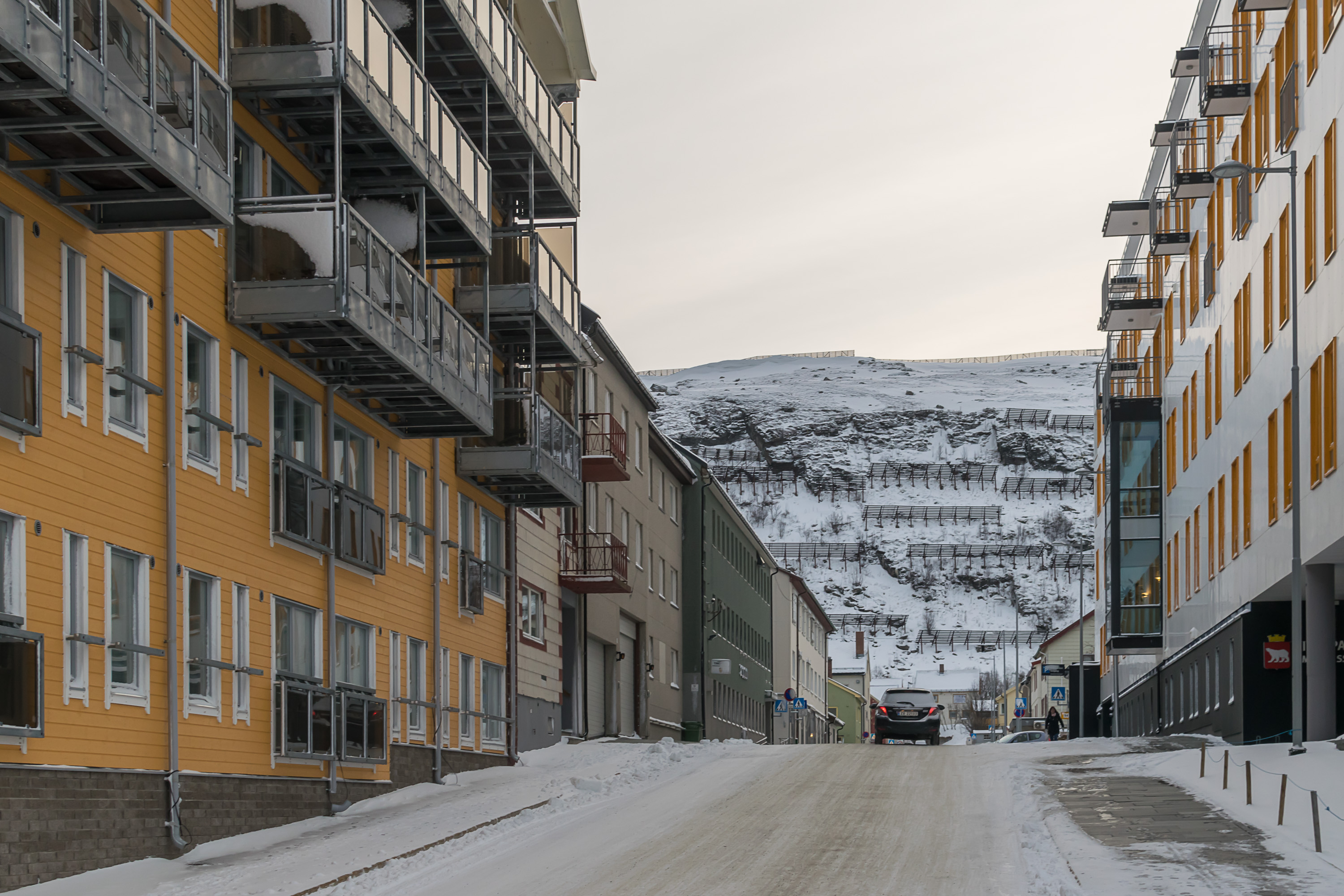 К смотровой площадке, откуда сделаны эти фото, можно заехать по старой дороге. Отсюда хорошо видно, что город и окрестные низкие горы полностью лишены деревьев, от лавин город защищают специальные изгороди. Здесь же музейные (?) саамские постройки.