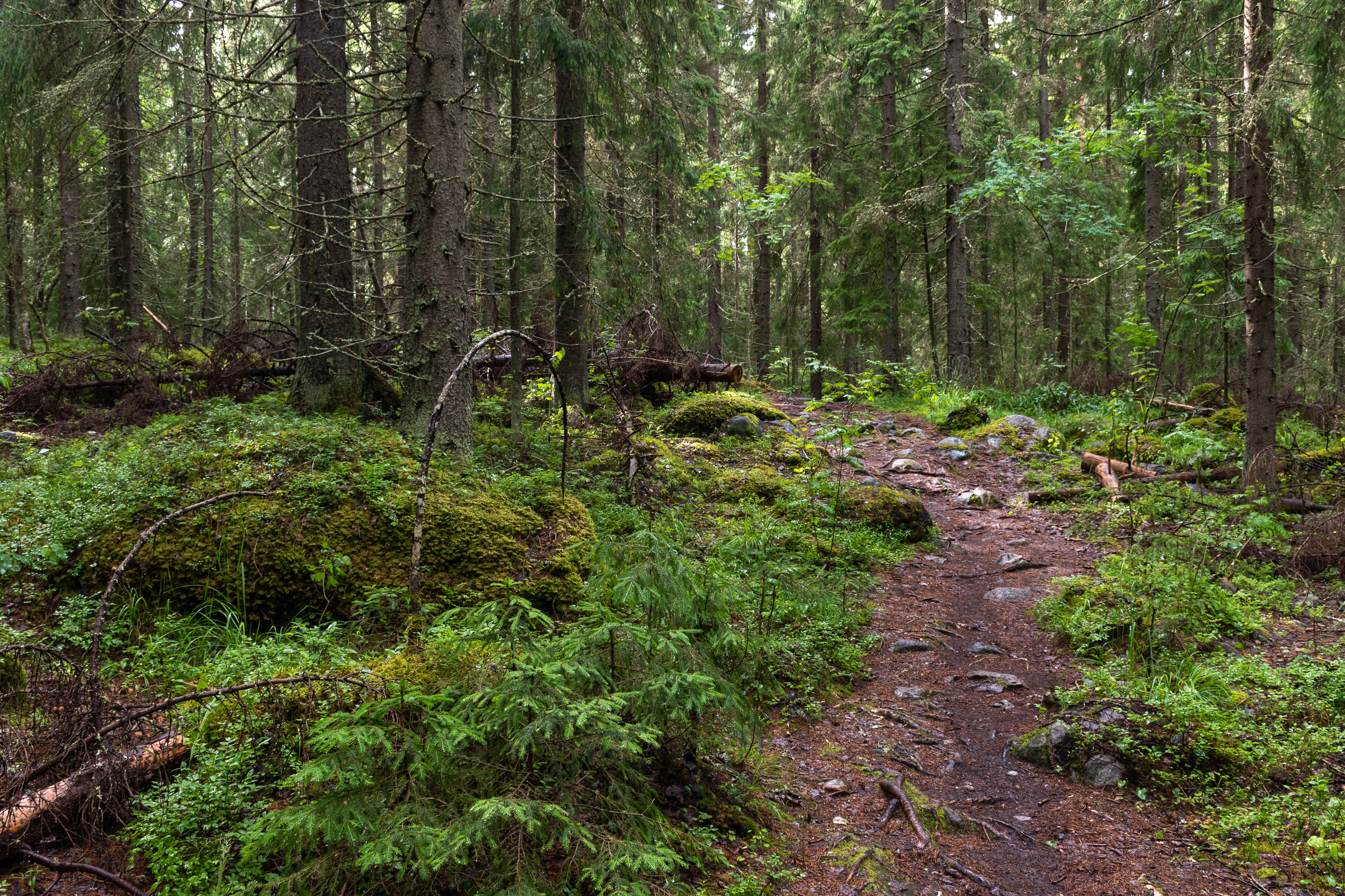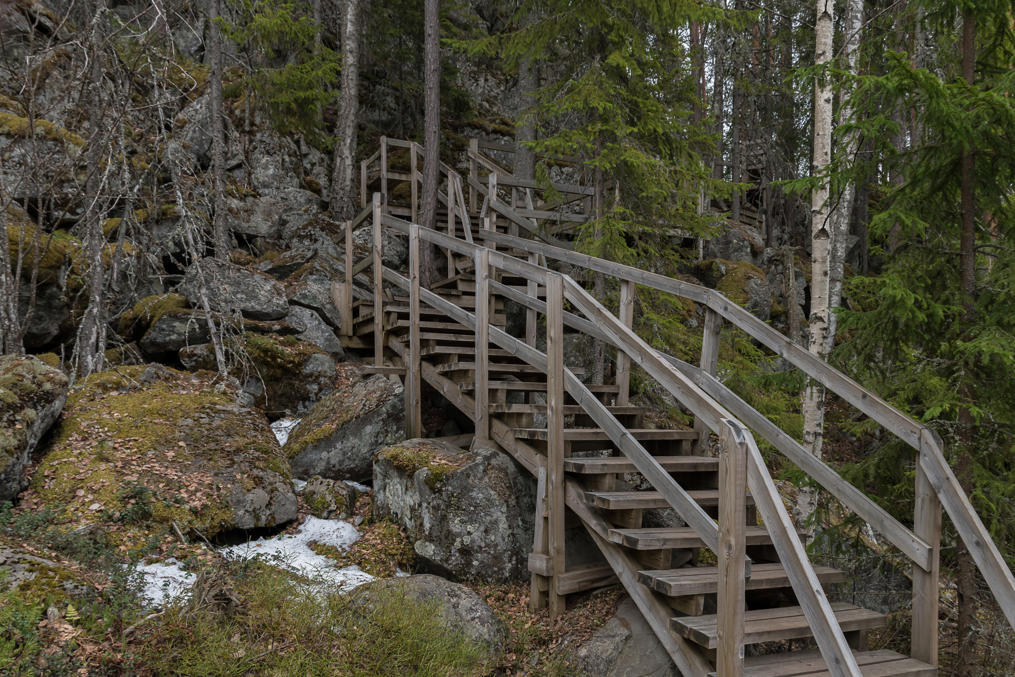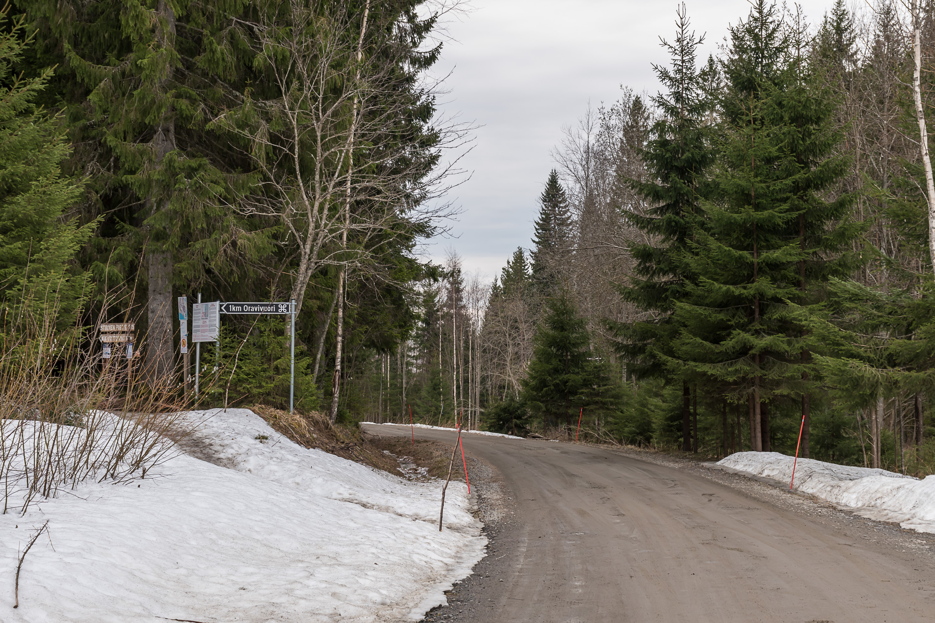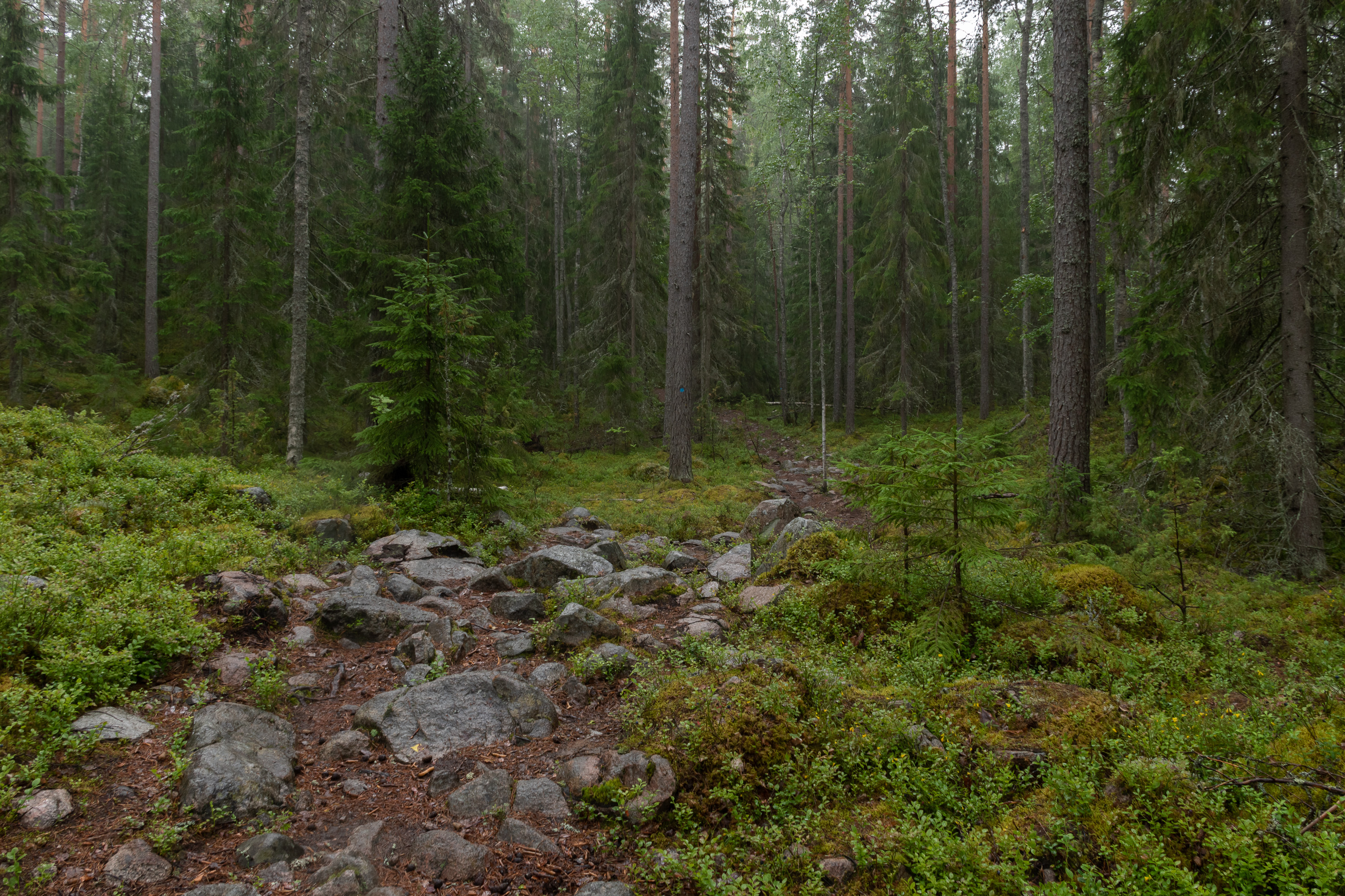 11. Тропа к обрыву идет через остатки старой дороги. Это одна из всего двух дорог, идущих поперек Пяйянне — озеро тянется на сотню километров с севера на юг, и в двух местах достаточно узкое, чтоб его можно было пересечь по дорогам. Когда-то это была узкая гравийка с совершенно дикими уклонами, новую асфальтированную дорогу перенесли севернее. Раньше она пересекала Пяйянне в узком месте через паром, а с 1997 — через мост. За озером и Ваарунвуорет дорога идет дальше на Луханку, один из самых маленьких муниципалитетов Финляндии.