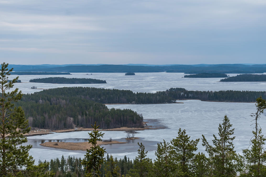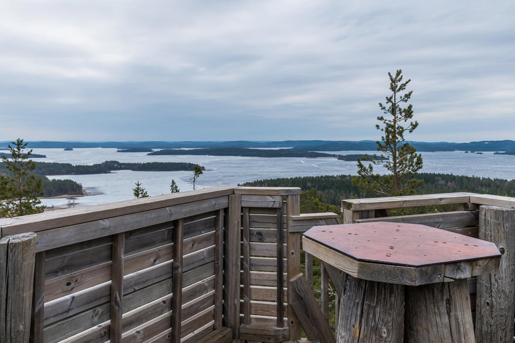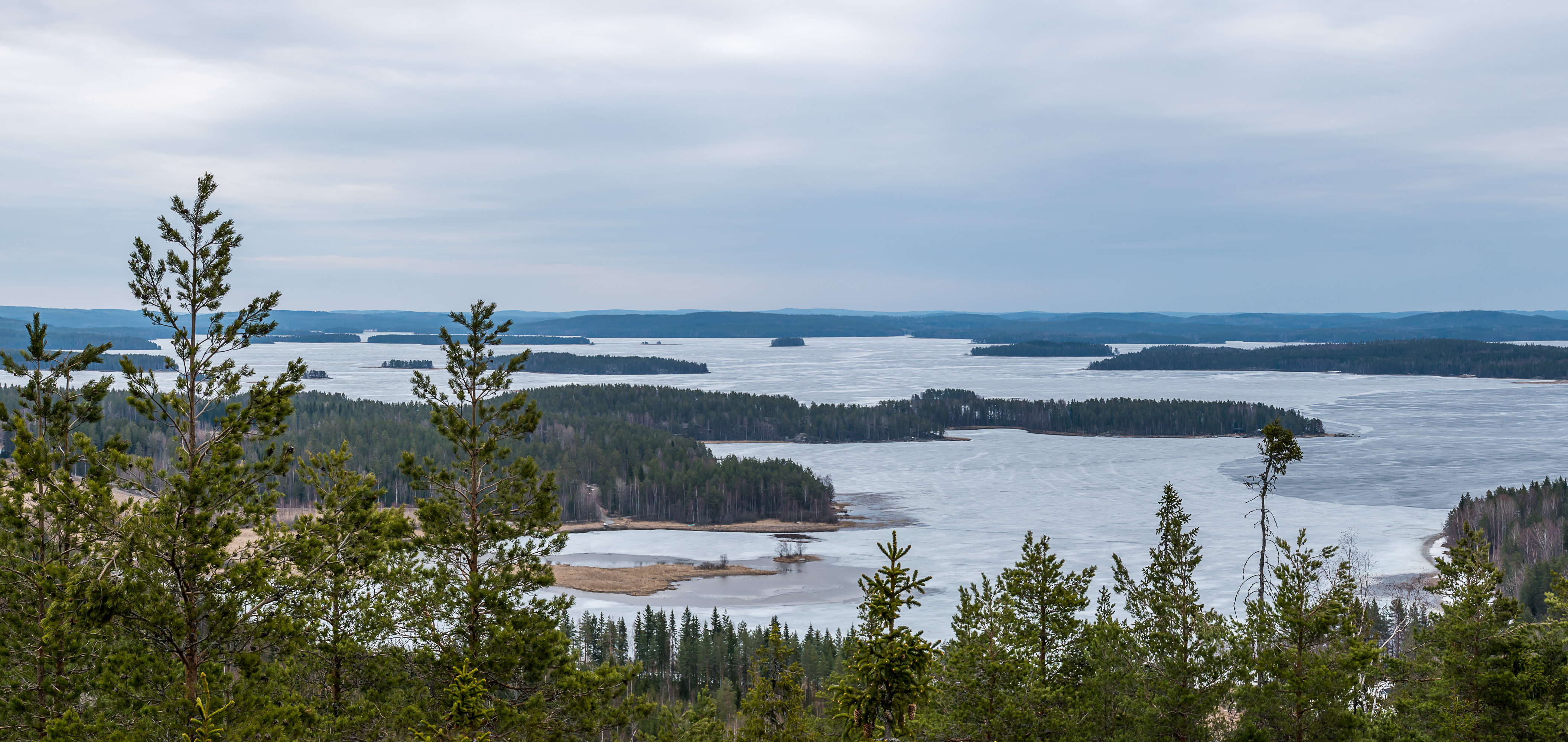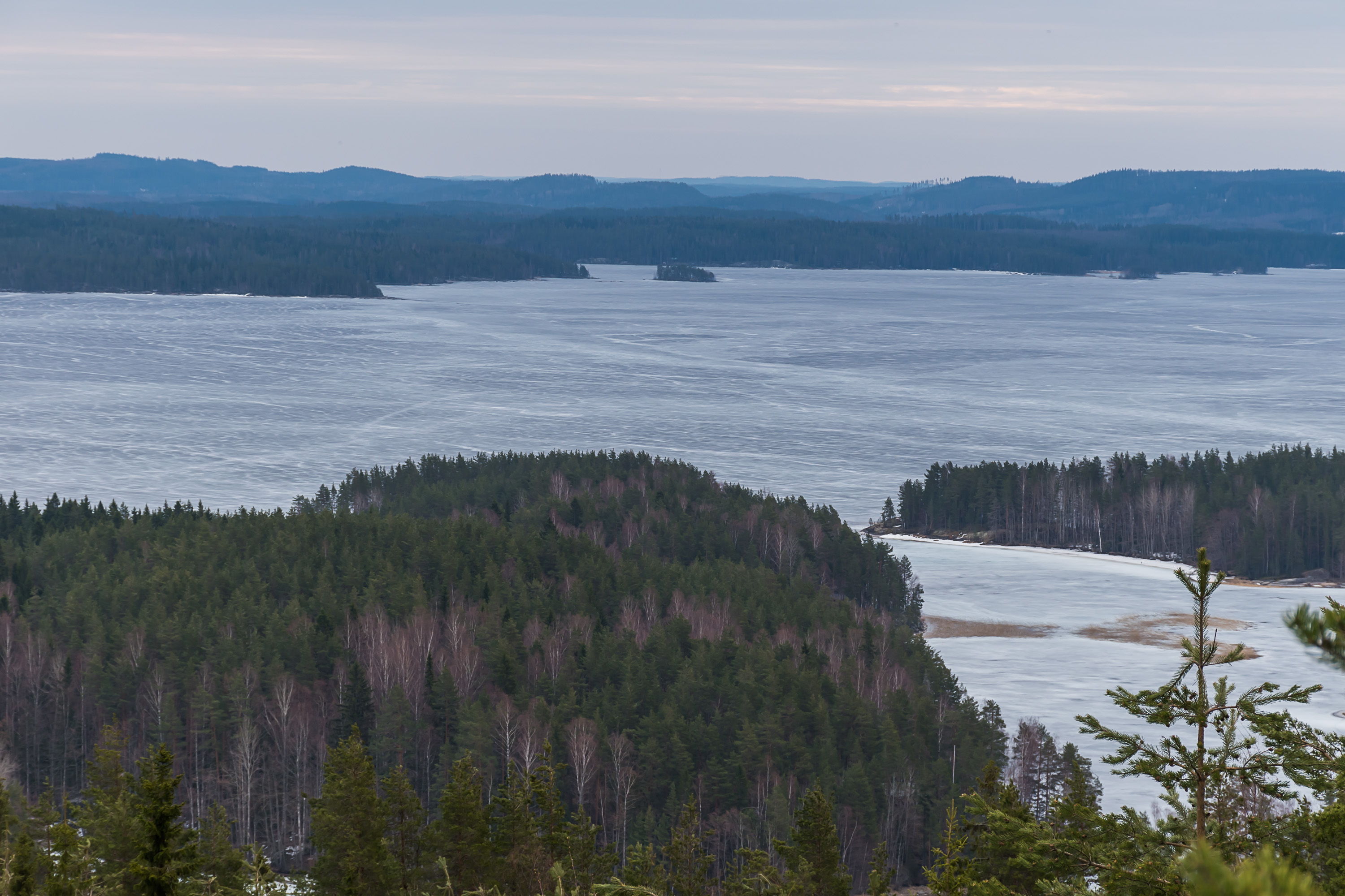 16. Еще и вышку смотровую построили, чтоб над верхушками сосен было видно тоже. Гора высотой 192 м над уровнем моря возвышается над озером Пяйянне на 115 м. Озеро, конечно, в апреле еще подо льдом, и снега на склонах холмов еще хватает.