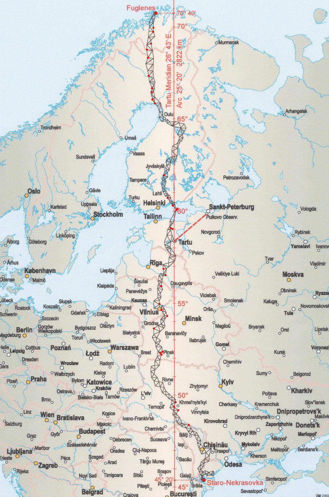 14. Дугу Струве в первой половине 20 в. построил, как известно, российский астроном германского происхождения Василий (Фридрих) Струве, из 265 триангуляционных пунктов на 2820 км от Черного до Баренцева моря, с целью точного измерения формы и размеров Земли.