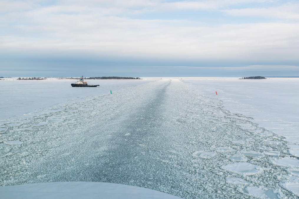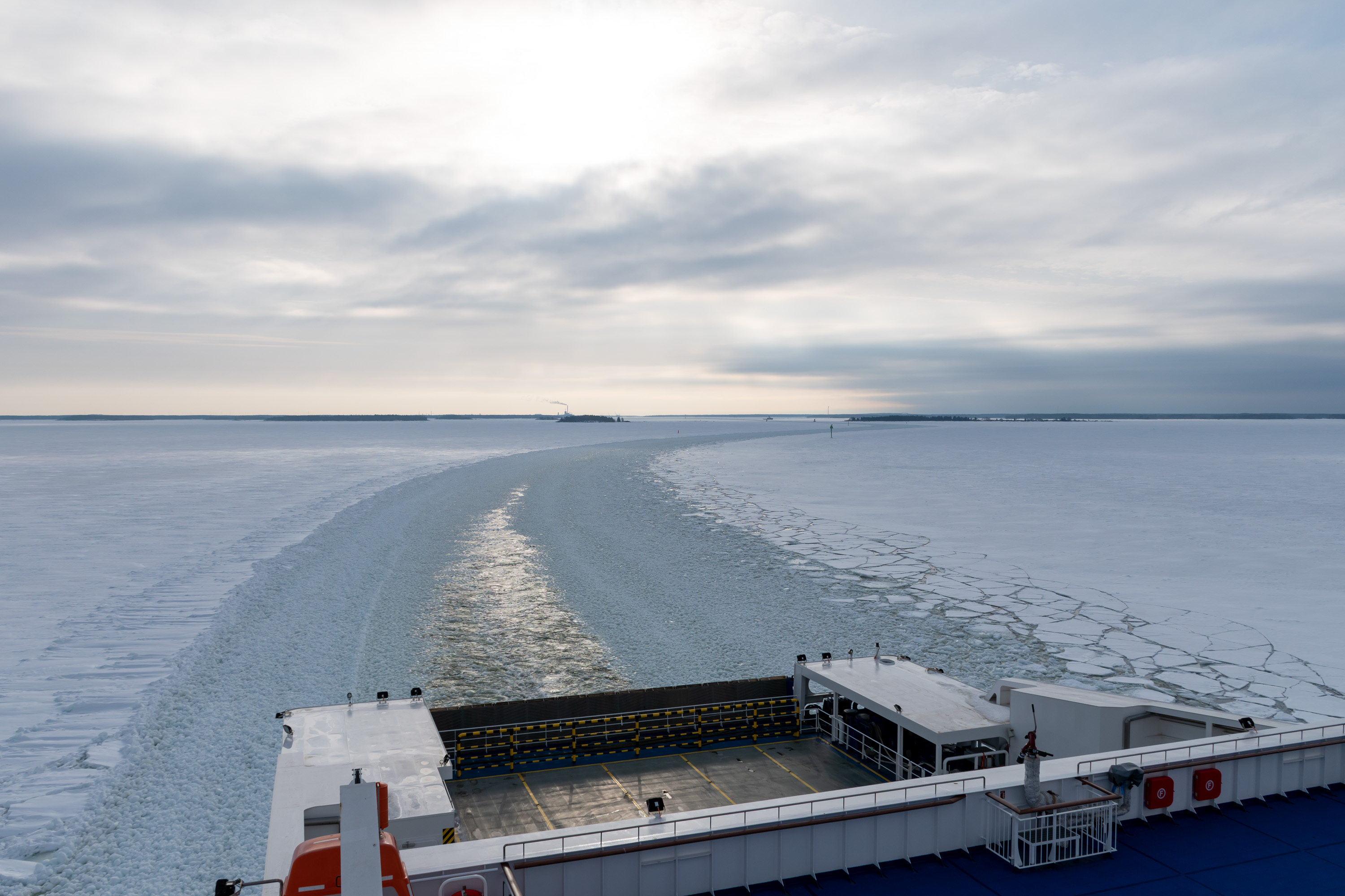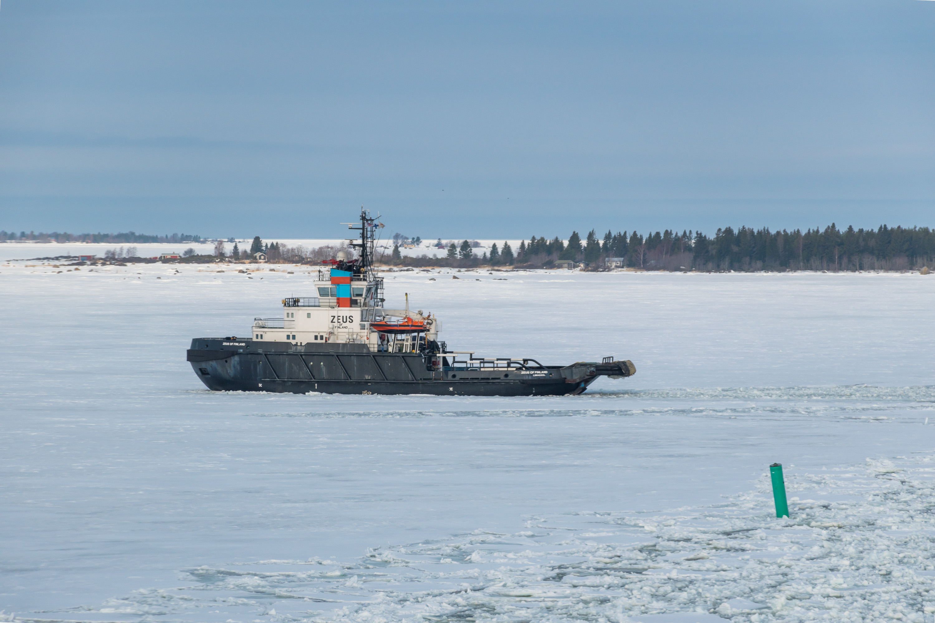 19. У Ваасы, где лед толщиной 20-50 см, ледоколом в большинство зим служит ледокольный буксир "Зевс Финляндский" (Zeus of Finland), который государство фрахтует у компании Alfons Håkans. Тут он отдыхает в стороне от фарватера. Наверное, "Зевс", потому что под кипрским флагом зарегистрирован. В большинство зим лед-припай начинается примерно от шхеры Энстен, в десяти милях от порта.
