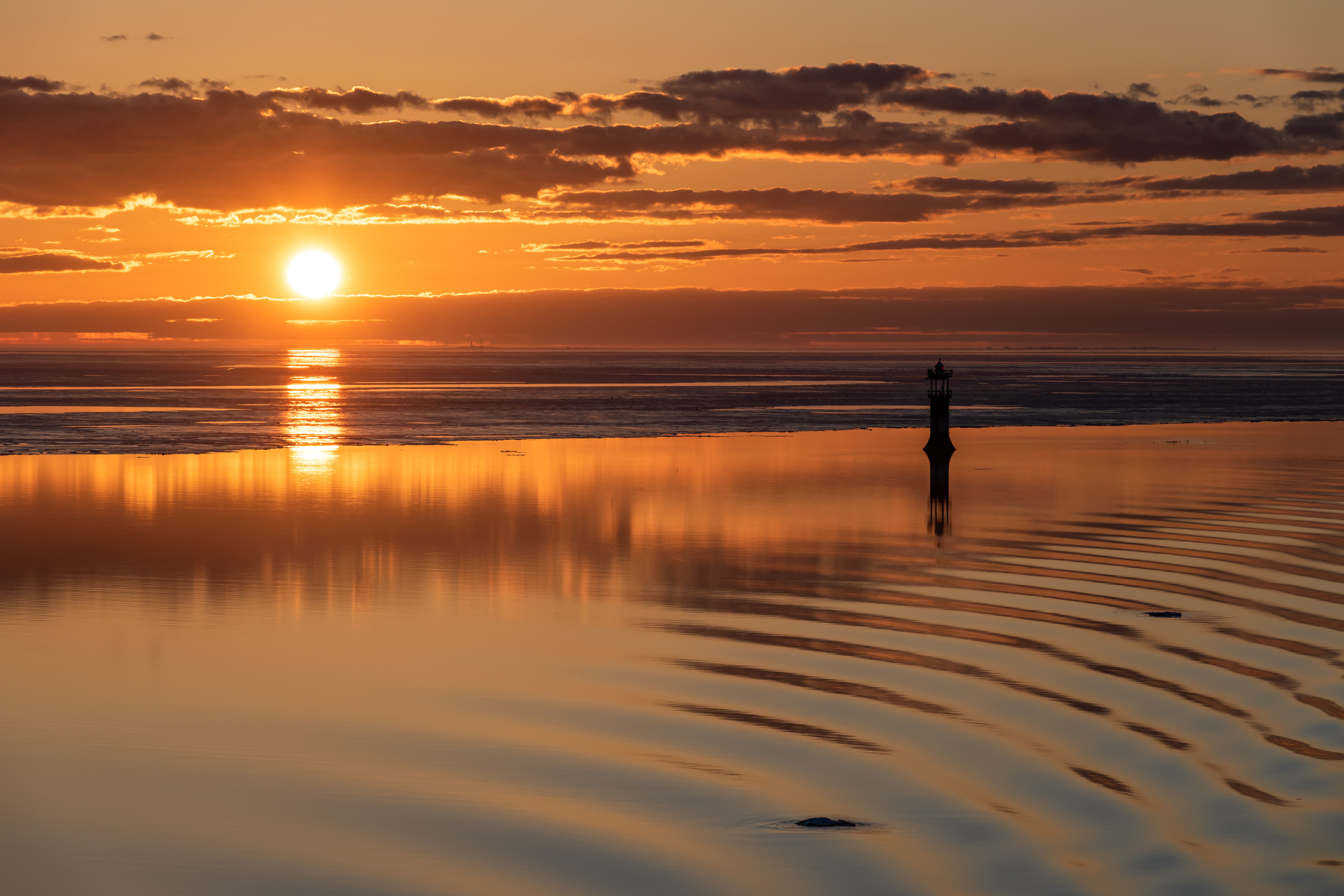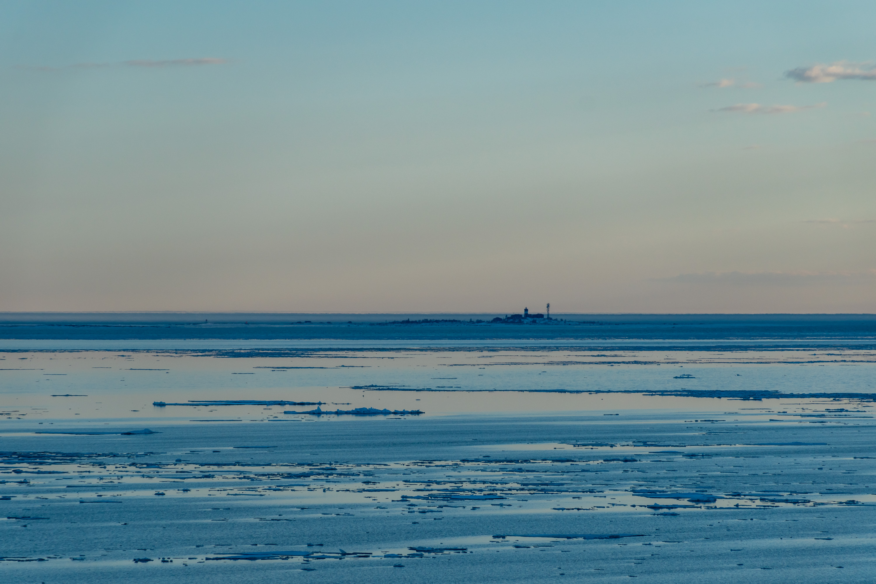 11. Ну а теперь посмотрим на море с парома. Очень красивые фото у меня получилось сделать в поездке в апреле 2023. Мы тогда ездили в Умео на Пасху, без машины, время провели неплохо, но в Умео был разгар самого сырого и грязного времени весны, показывать особо нечего. Зато на обратном пути было просто сказочно. Лед в апреле потихоньку тает, но большая его часть еще остается — лед в Кваркене кончается только где-то спустя месяц, в первой половине мая. "Аврора Ботния", конечно, соответствующим образом укреплена, чтобы льды ей не были помехой. На фото маяк Норра-Глоппстен (Norra Gloppsten).