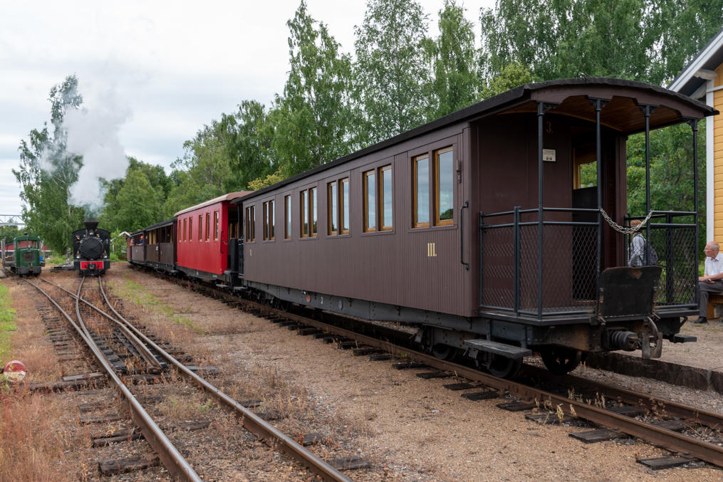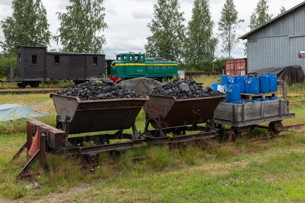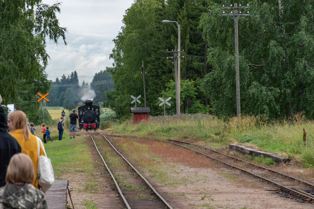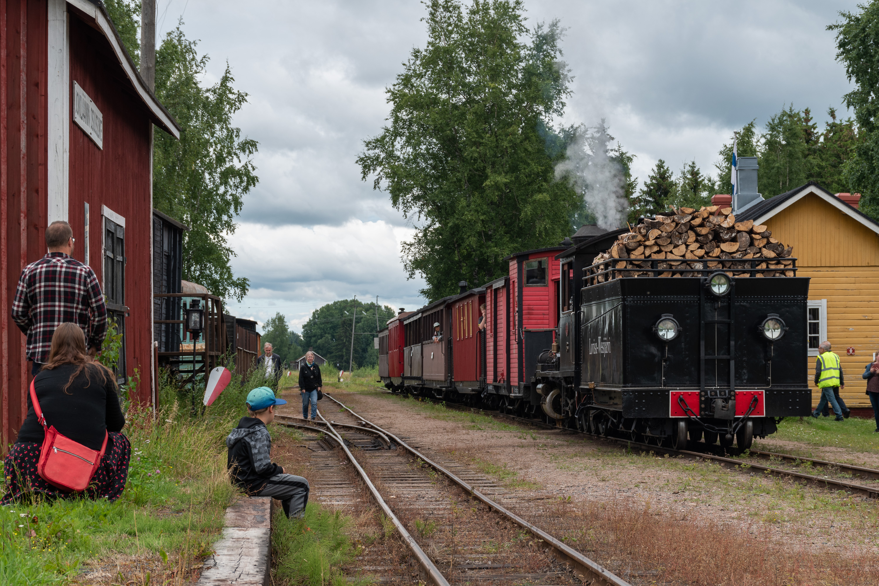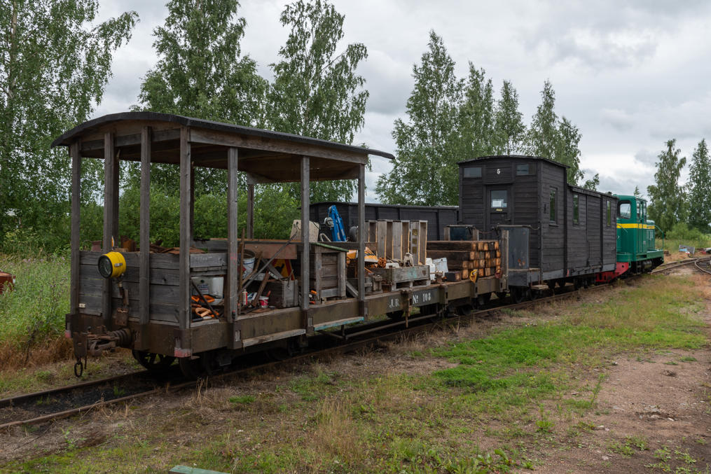 6. Минкиё и наш поезд. Нас везет паровоз как раз с бывшей узкоколейки Ловииса-Весиярви (Лахти), с коллекцией разных вагонов. В целом подвижной состав на узкоколейке весьма разнообразный; почти все, что в Финляндии физически сохранилось колеи 750 мм, находится тут, хотя, думаю, на ходу далеко не все локомотивы.