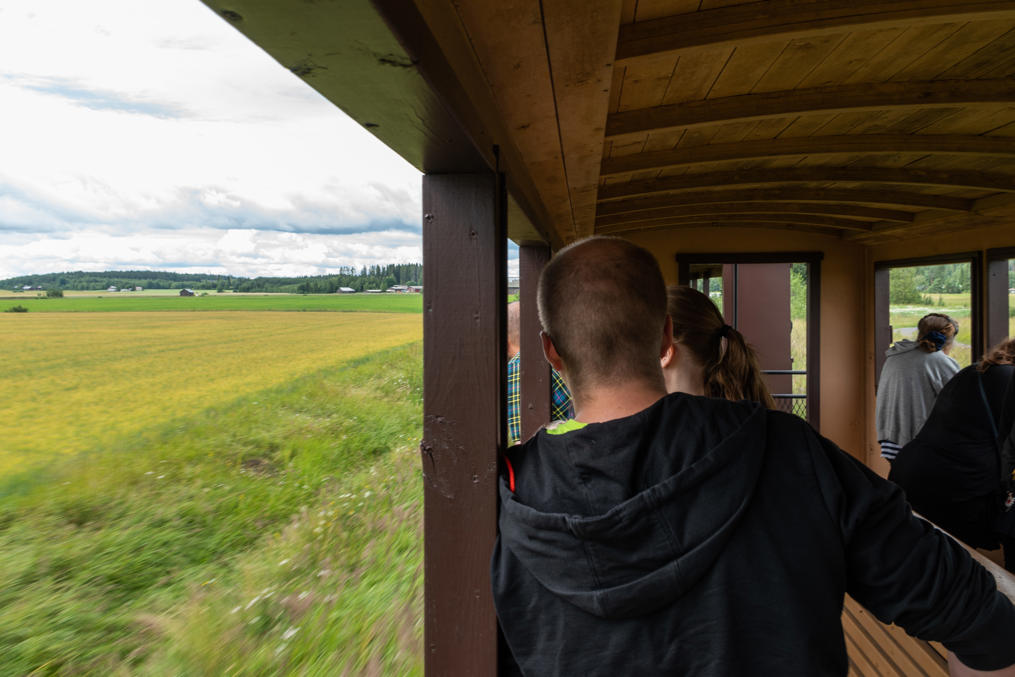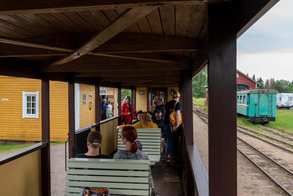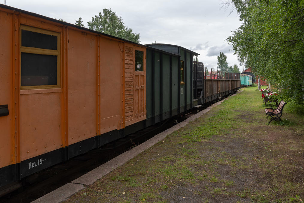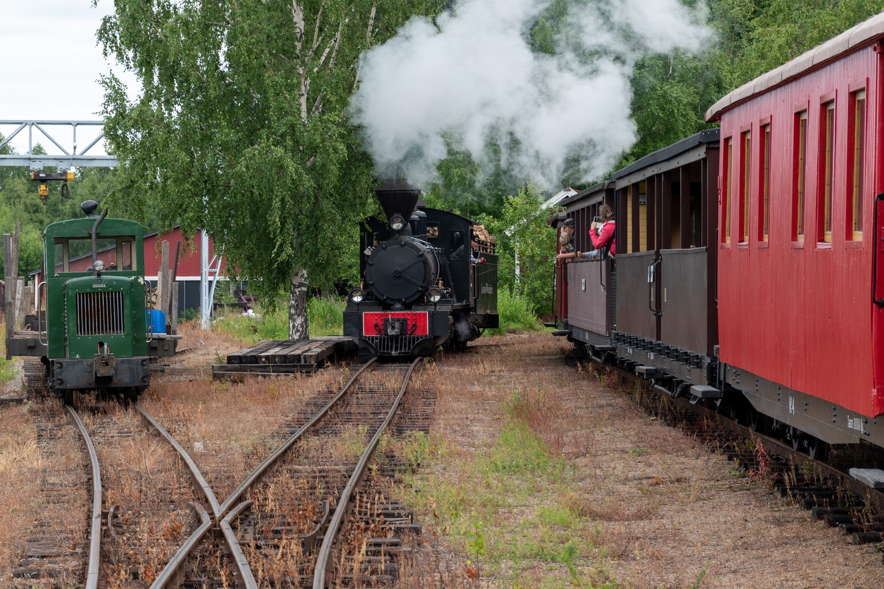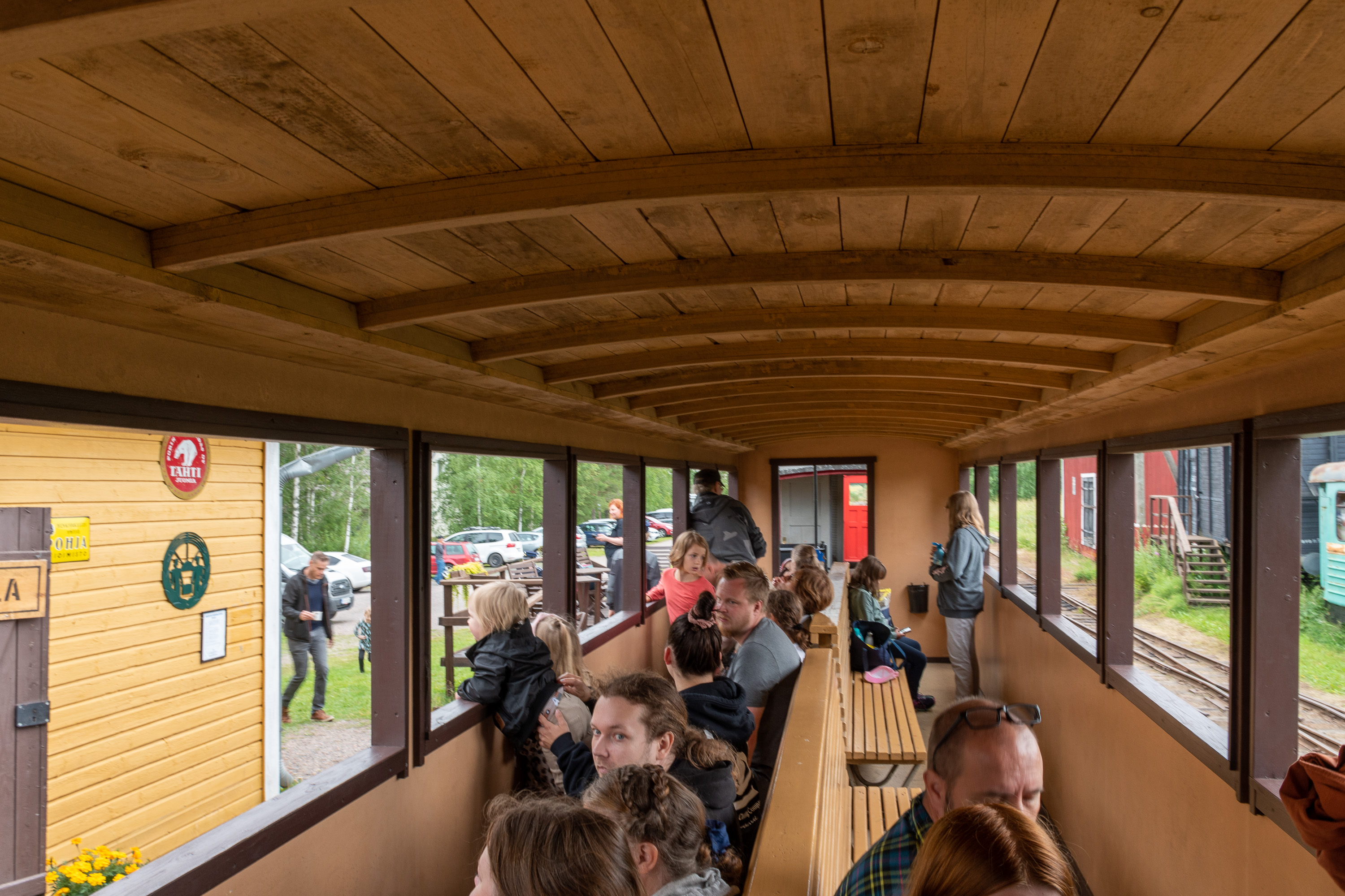 6. Минкиё и наш поезд. Нас везет паровоз как раз с бывшей узкоколейки Ловииса-Весиярви (Лахти), с коллекцией разных вагонов. В целом подвижной состав на узкоколейке весьма разнообразный; почти все, что в Финляндии физически сохранилось колеи 750 мм, находится тут, хотя, думаю, на ходу далеко не все локомотивы.