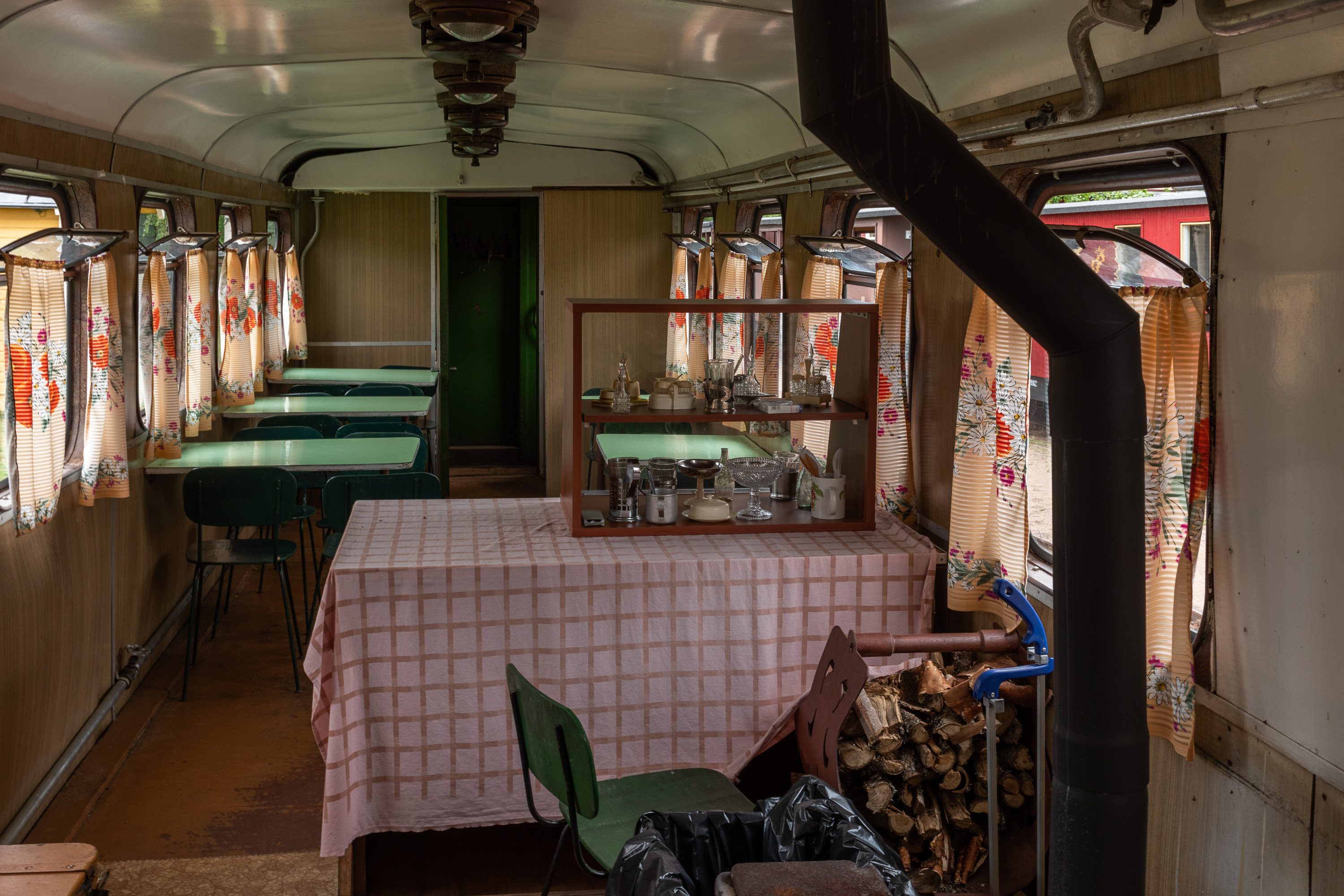 7. Подвижной состав восточного соседа тоже представлен. Характерный зеленый советский узкоколейный вагон-столовая с достаточно неплохо воссозданным интерьером. Из Эстонии вроде.