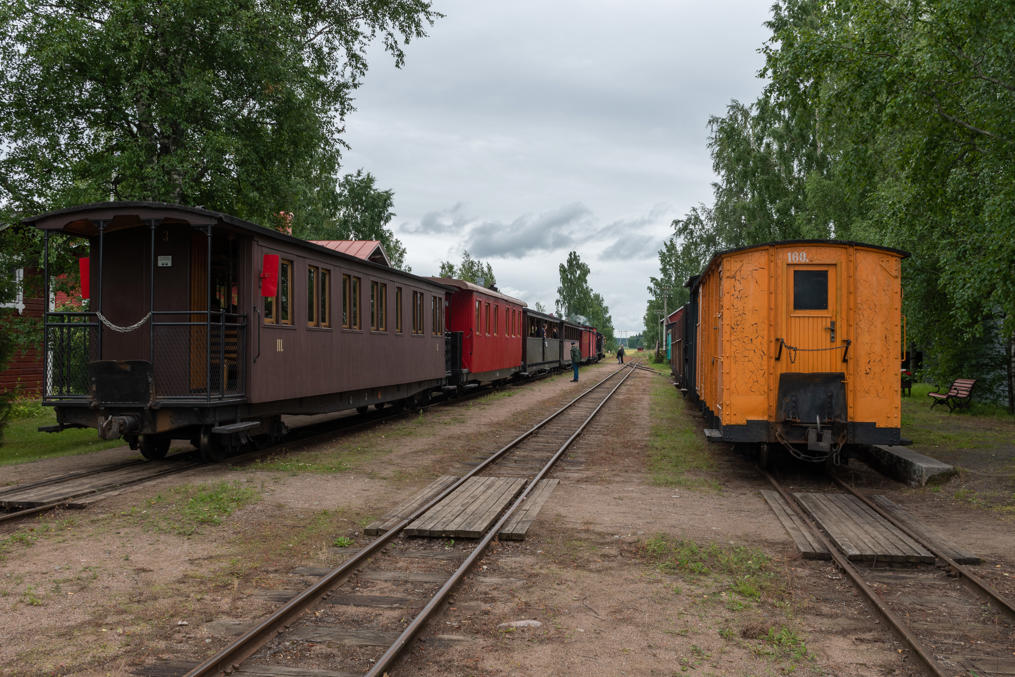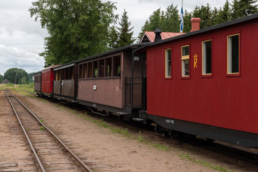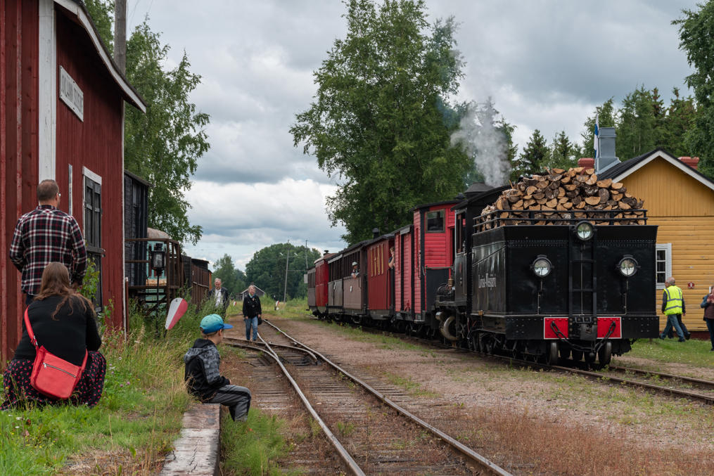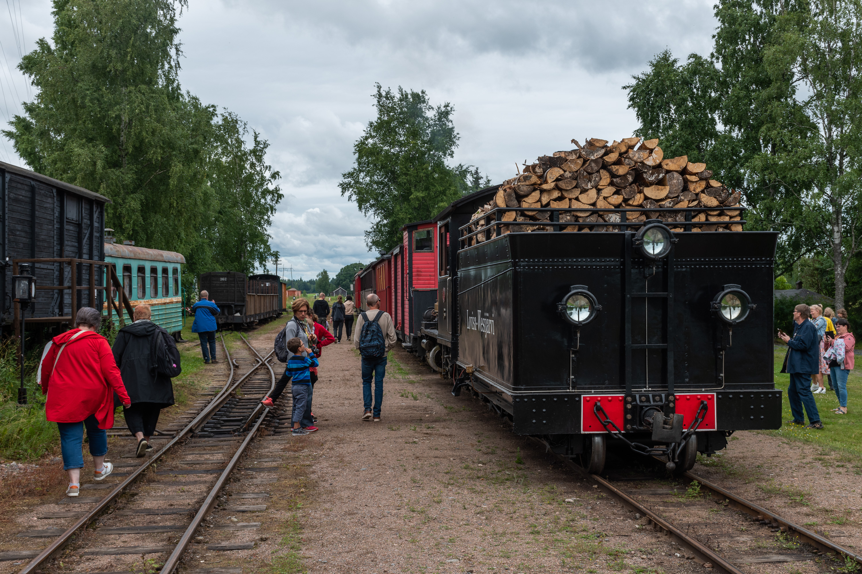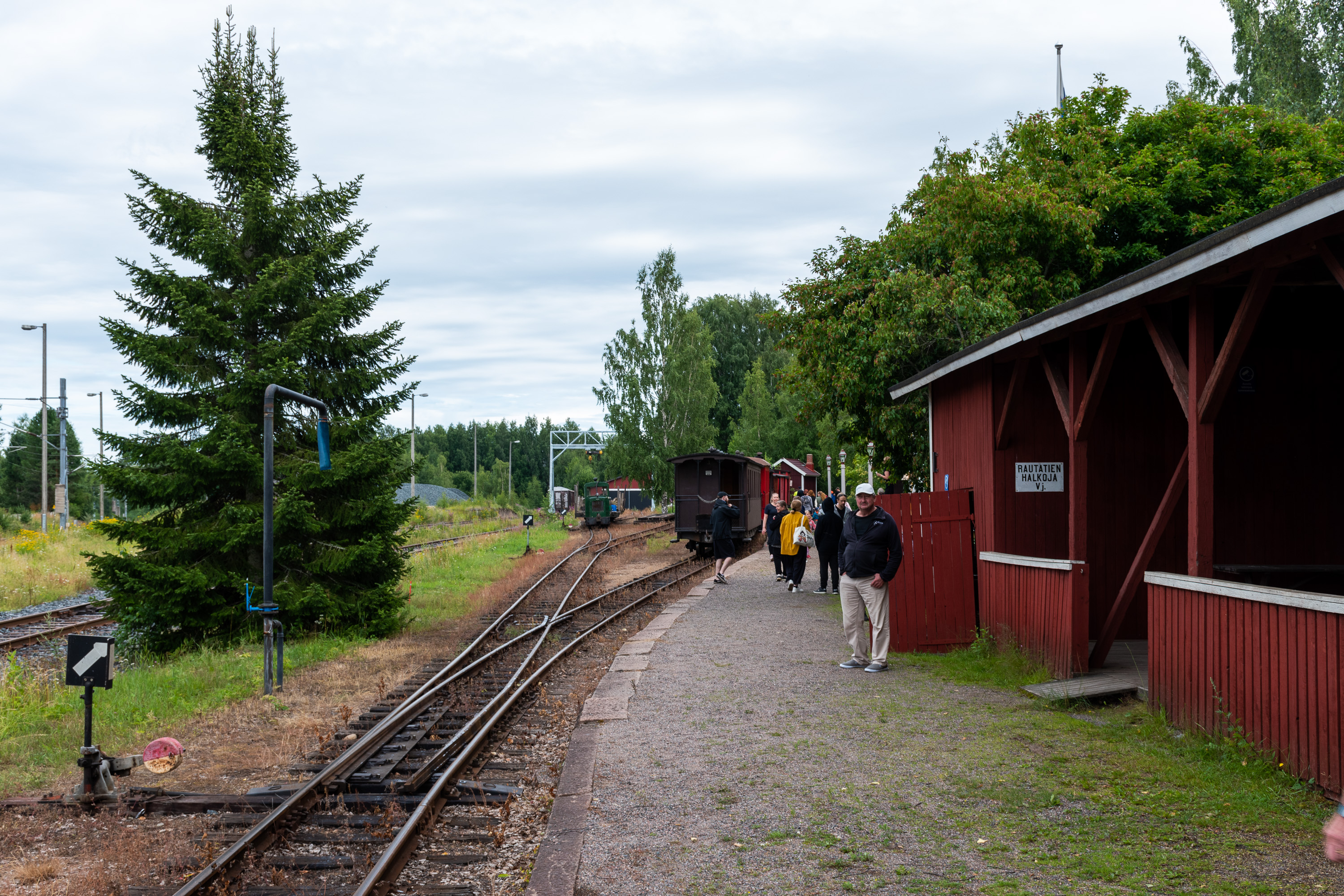 6. Минкиё и наш поезд. Нас везет паровоз как раз с бывшей узкоколейки Ловииса-Весиярви (Лахти), с коллекцией разных вагонов. В целом подвижной состав на узкоколейке весьма разнообразный; почти все, что в Финляндии физически сохранилось колеи 750 мм, находится тут, хотя, думаю, на ходу далеко не все локомотивы.