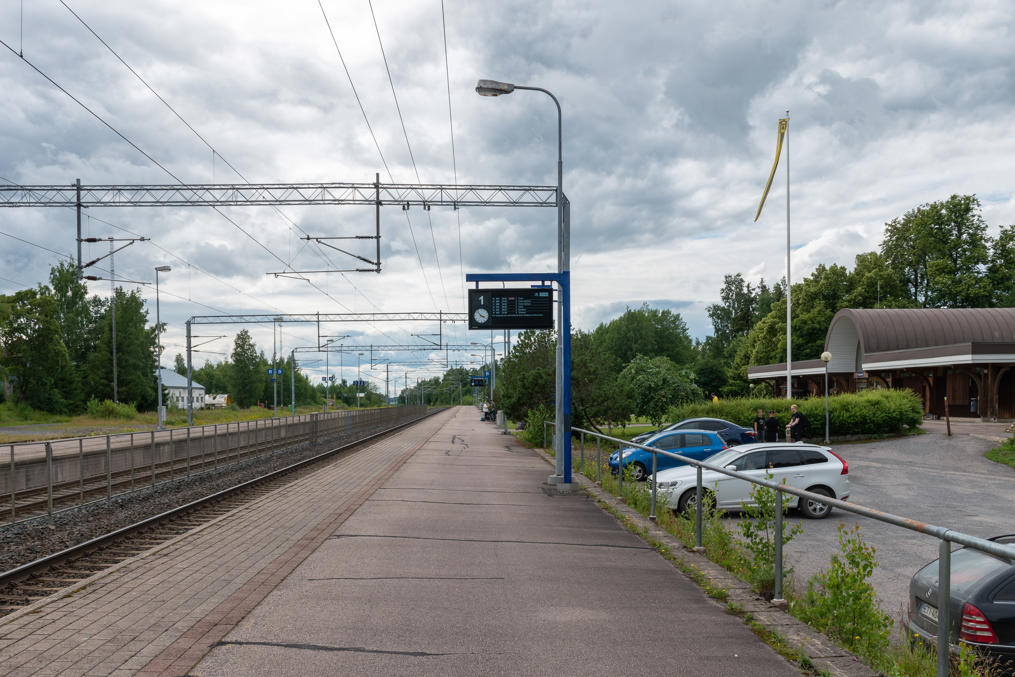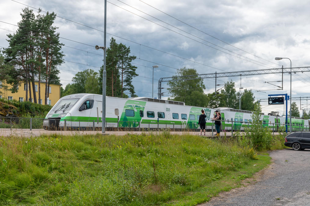 25. Ст. Хумппила и останавливающийся на ней "Пендолино" Тампере-Турку. Станция необычна вокзалом 1983 года нетиповой архитектуры, в те годы вокзалы редко строили, а интересные — и того реже. Памятник у вокзала посвящен местному стекольному заводику, закрывшемуся в 2016.