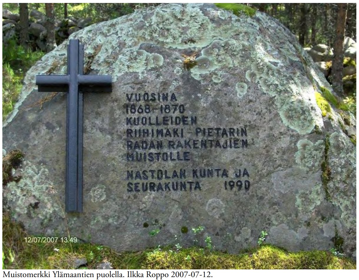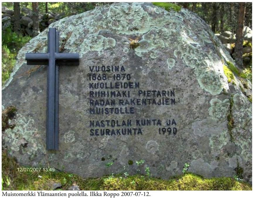 Но ее строили как раз в те годы (открыта в 1870), на стройке тоже умерло очень много рабочих — люди уже были истощены, бушевали эпидемии. Ту ж/д тогда прозвали Голодной (Nälkärata), или Костяной дорогой (Luurata). Фото памятника погибшим из Уусикюля под Лахти из интернета.