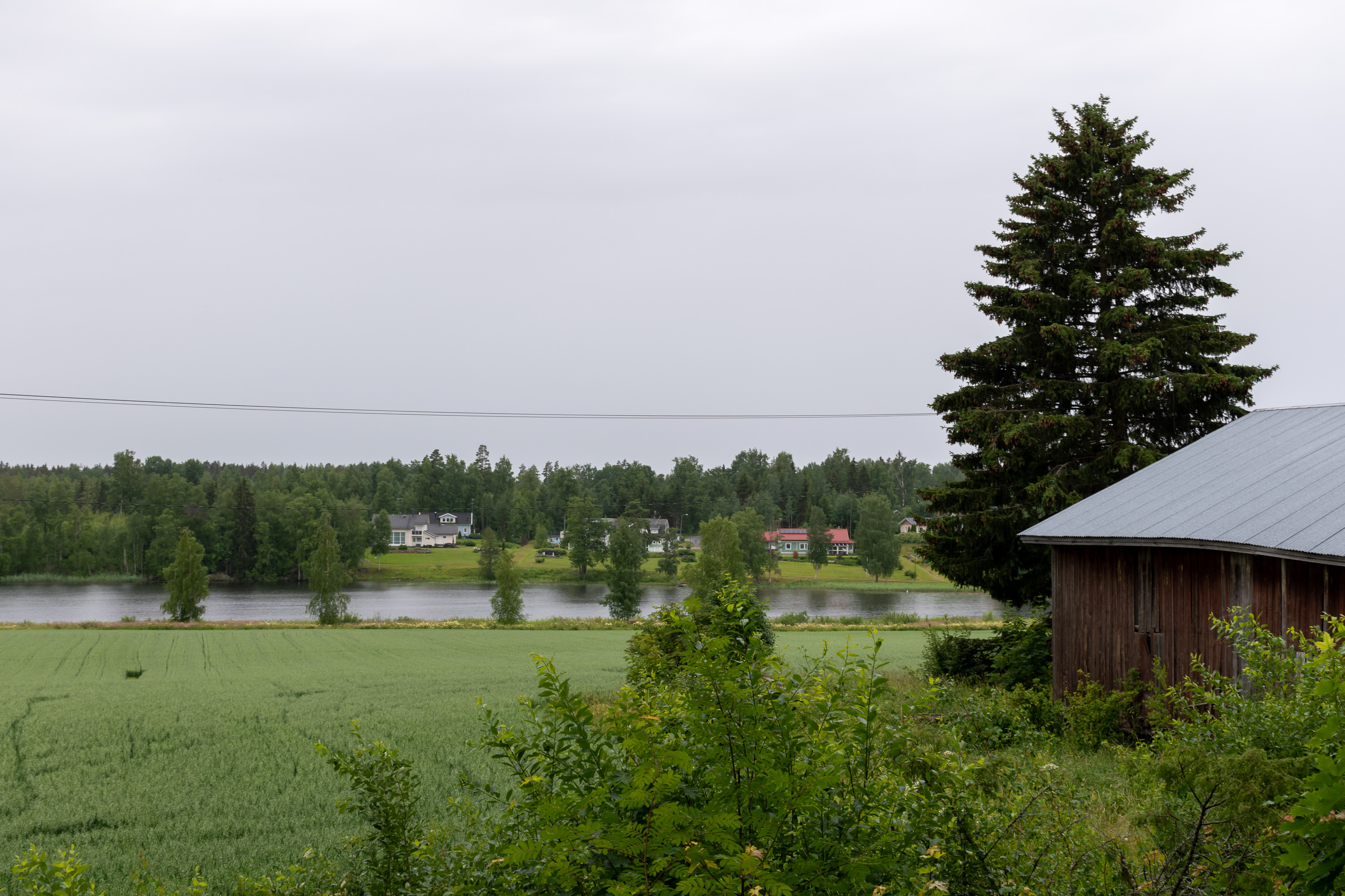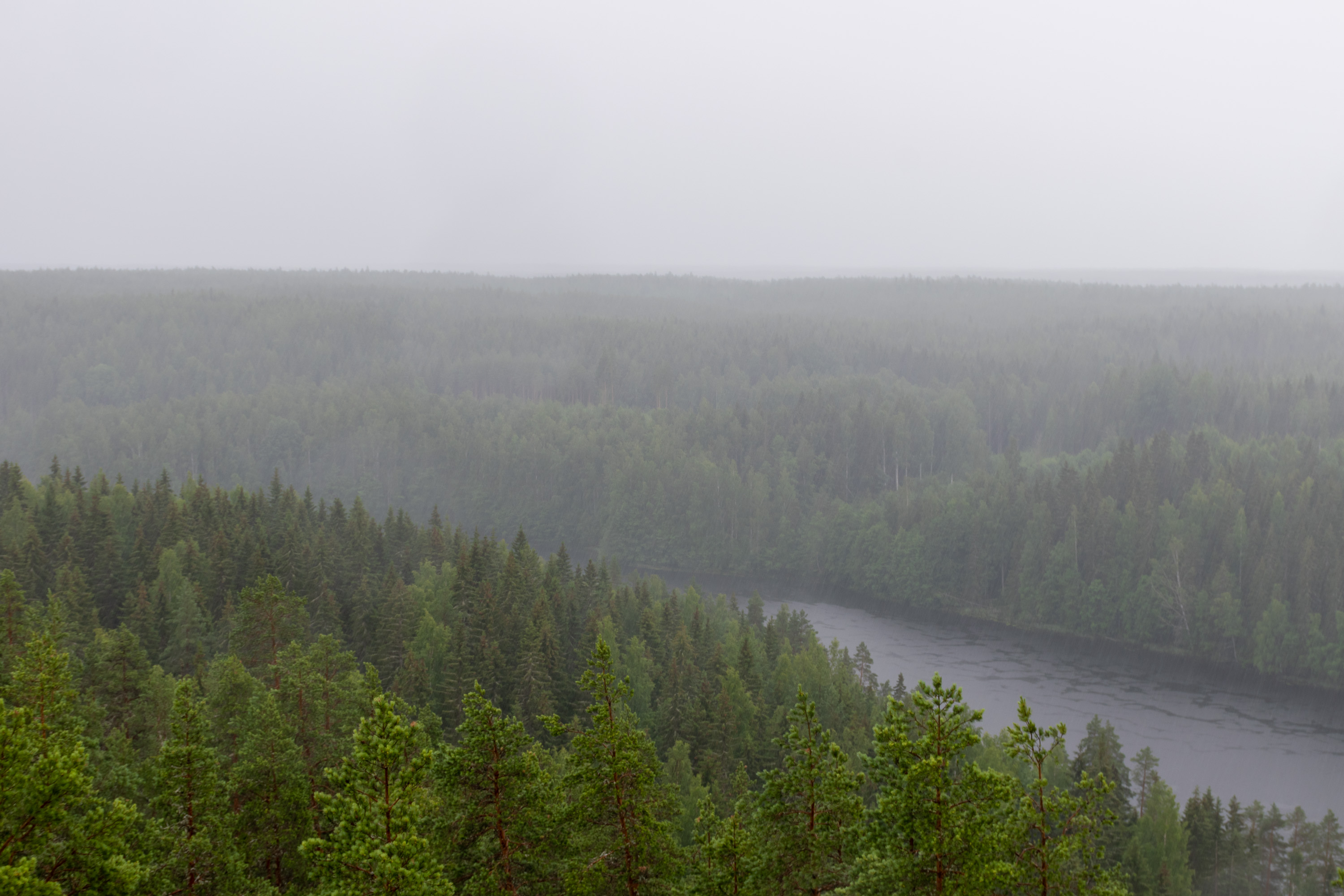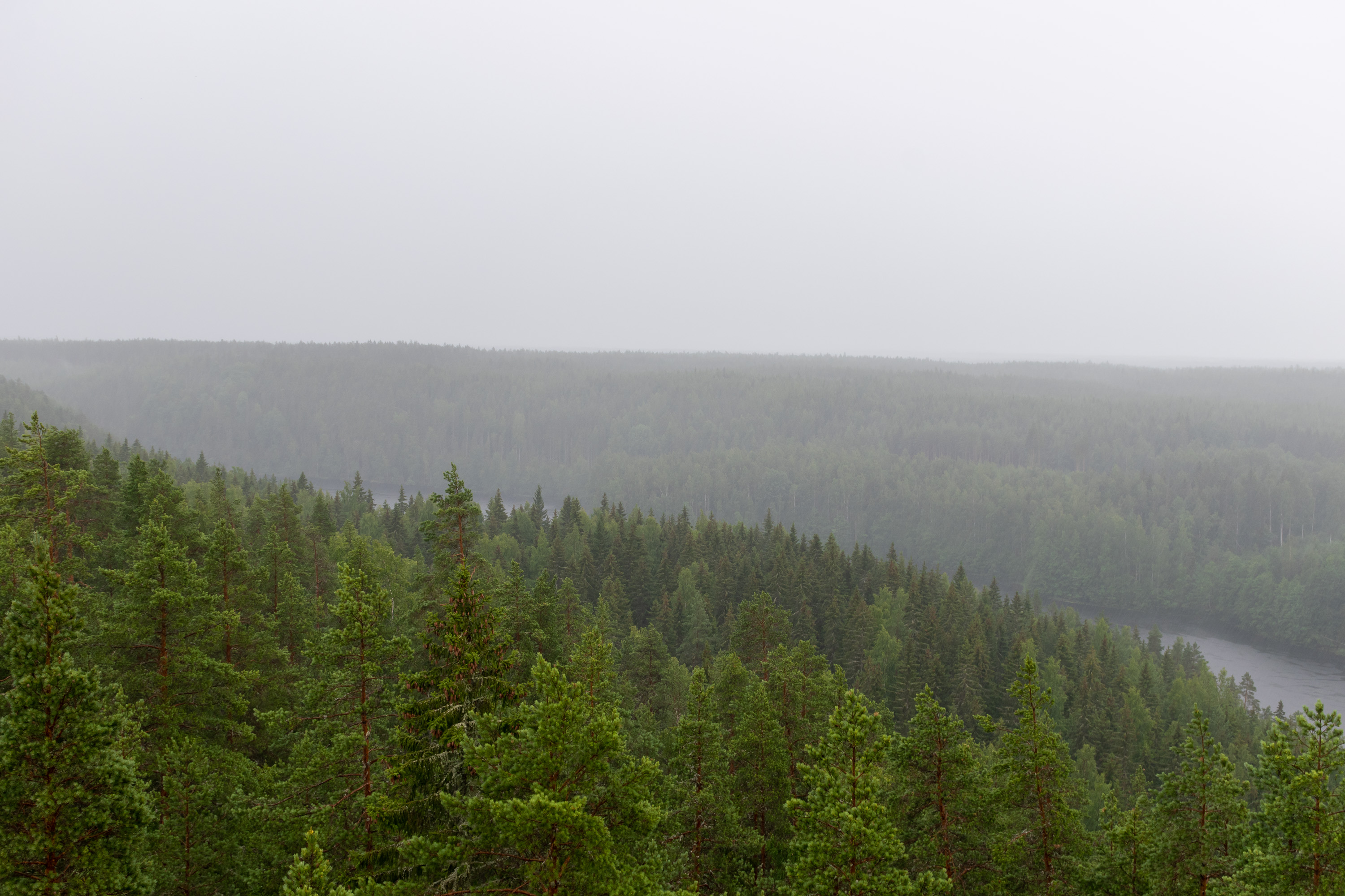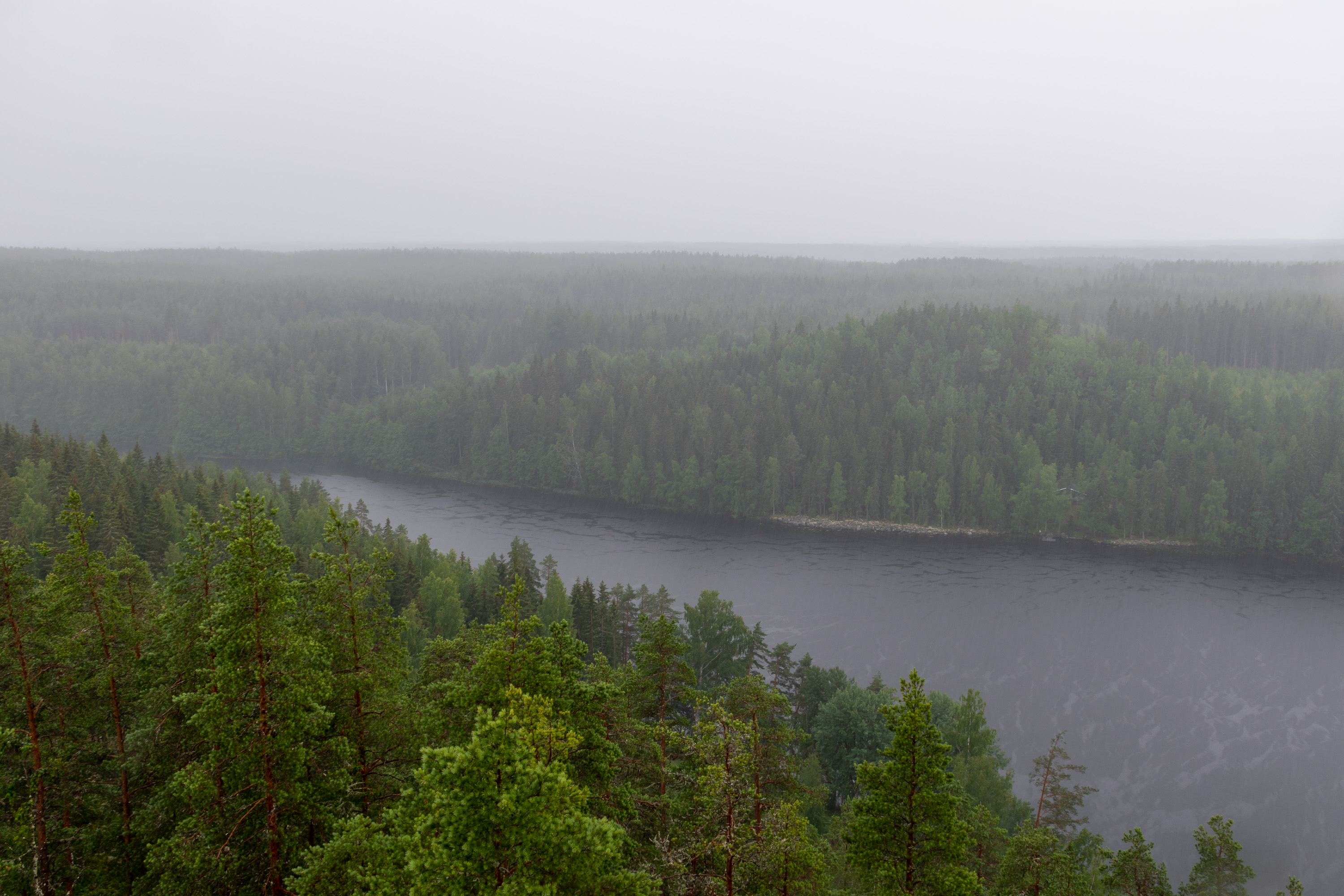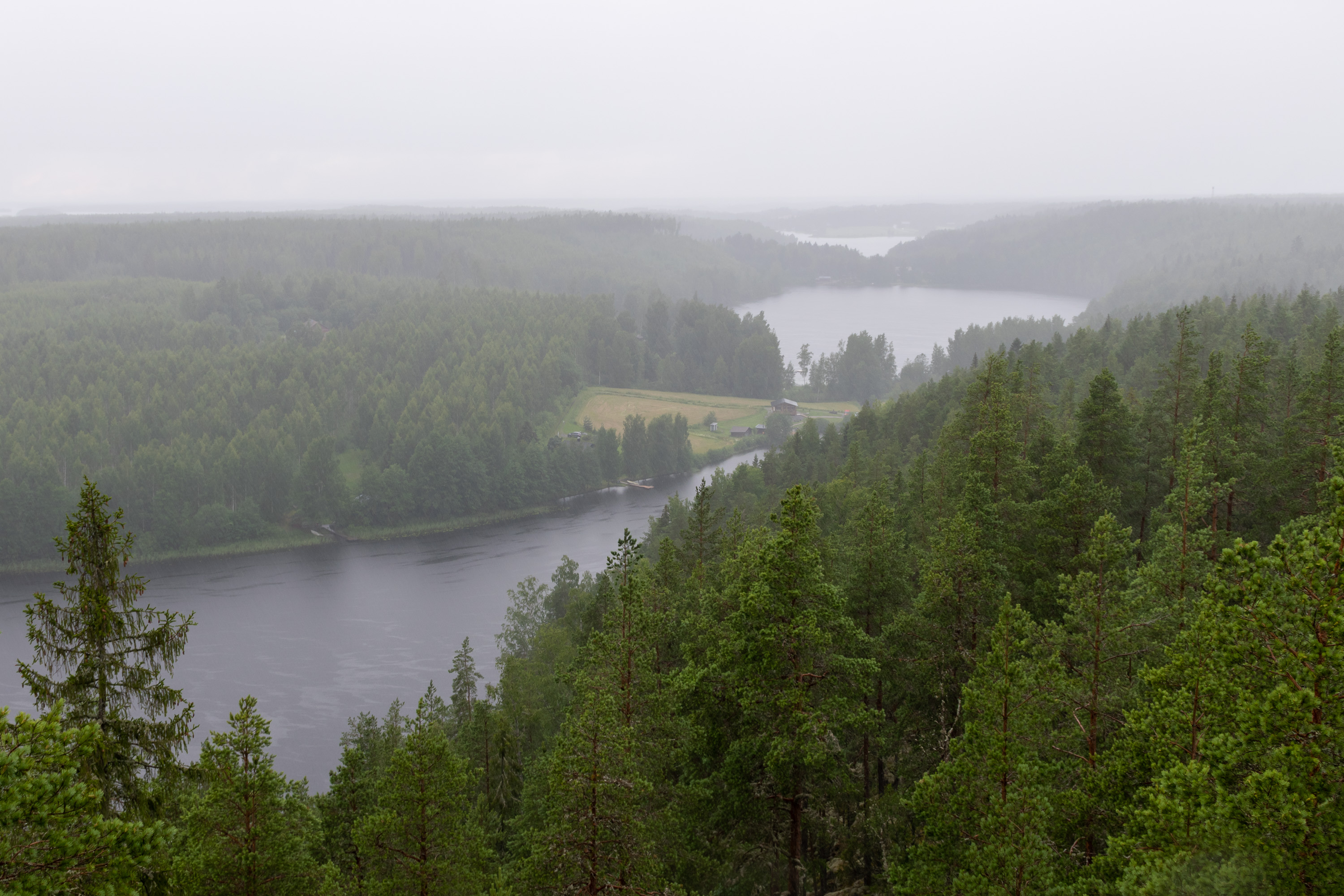 Озер четыре, последнее Лавиярви, и за ним уже долина кончается, и начинается гораздо более крупное, не вытянутое таким образом, Кархиярви. Лавиярви здесь немножко видно, третье отсюда озеро, на заднем плане, а Кархиярви за ним уже почти не различить в дождь.