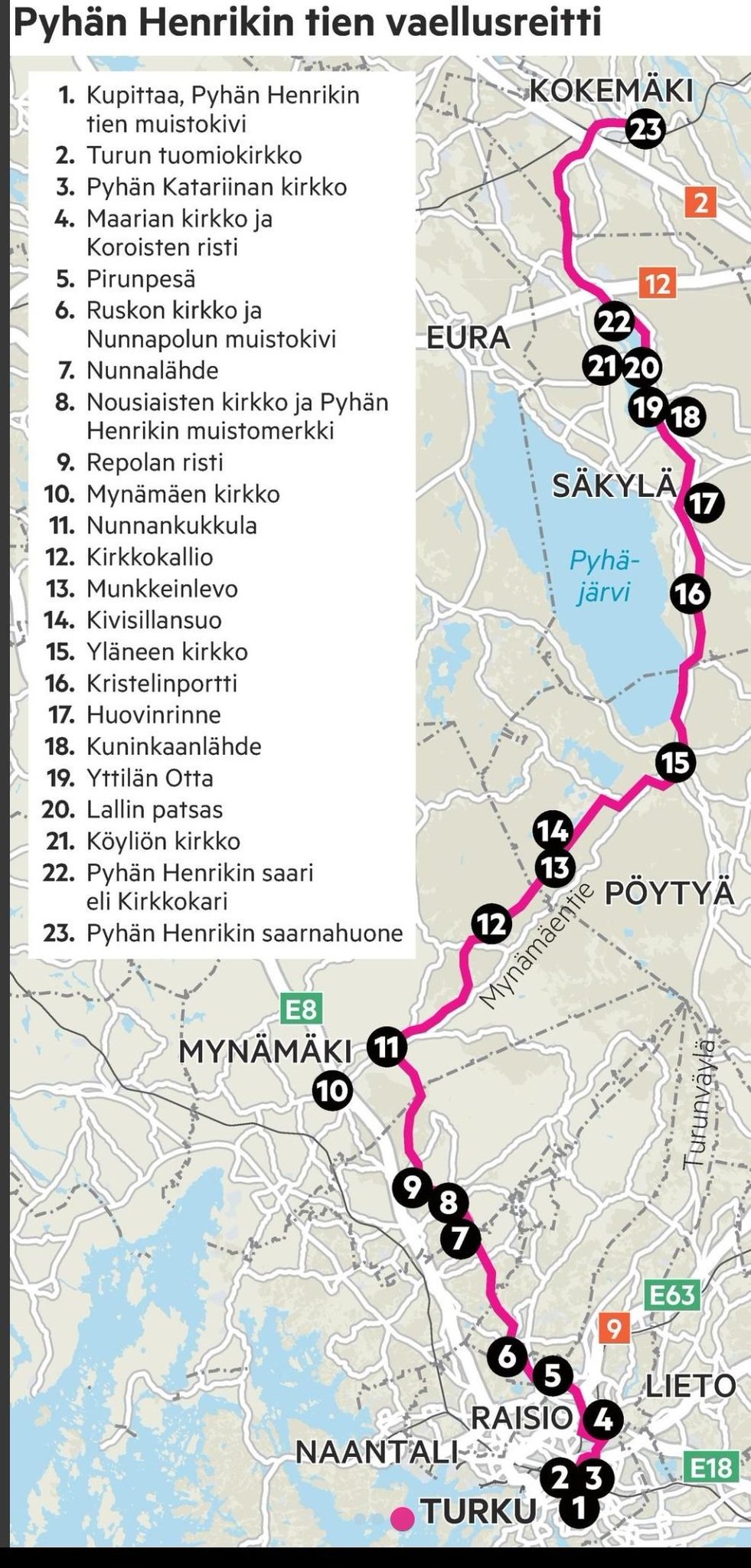 12. Отсюда начинается также Дорога Святого Генриха (Pyhän Henrikin tie), паломнический маршрут через Ноусиайнен и Кёюлиё (место, где Лалли убил епископа Генриха) до часовни св. Генриха в Кокемяки, около 140 км. Надо будет на велосипеде проехать когда-нибудь :)