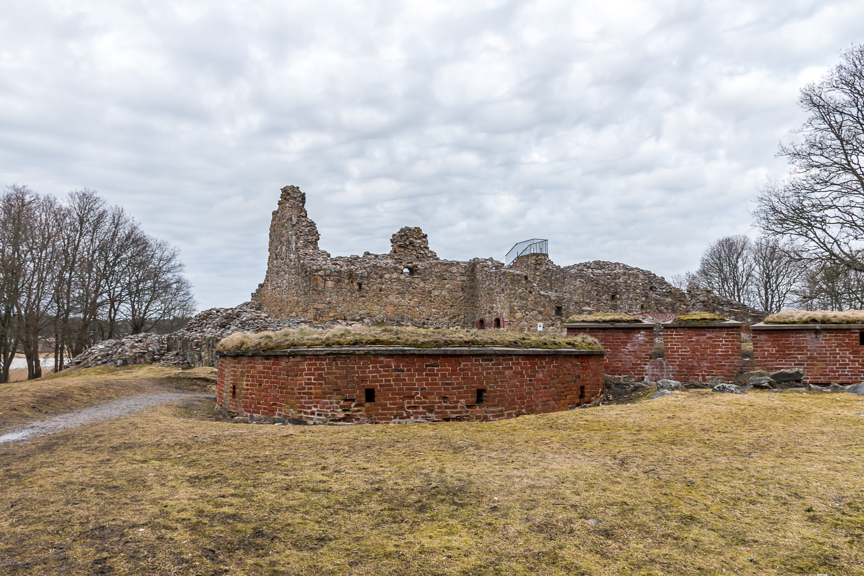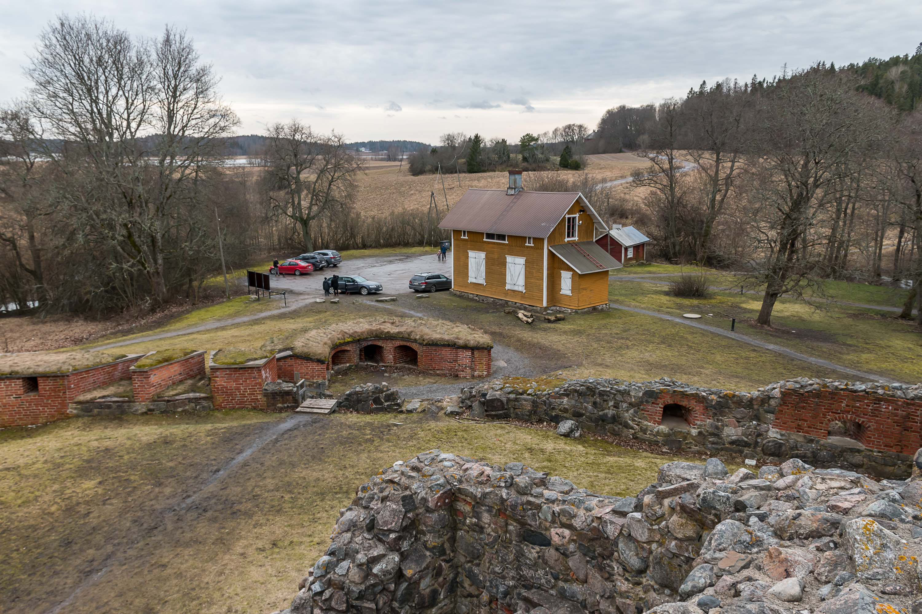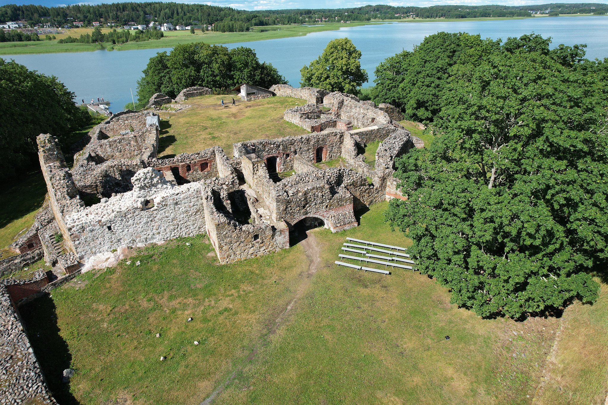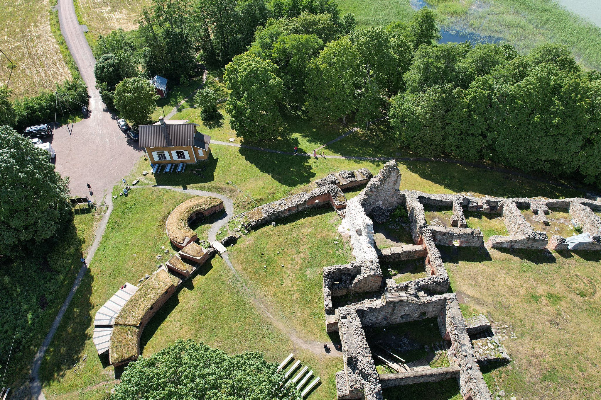 12. Камни с руин использовались для строительства и ремонта в т. ч. Туркусского замка, замка Кастельхольм и нескольких церквей. Изучать и реставрировать руины начали в конце 19 века. Сейчас за ними ухаживает Лесное управление. Фото с воздуха из вики.
