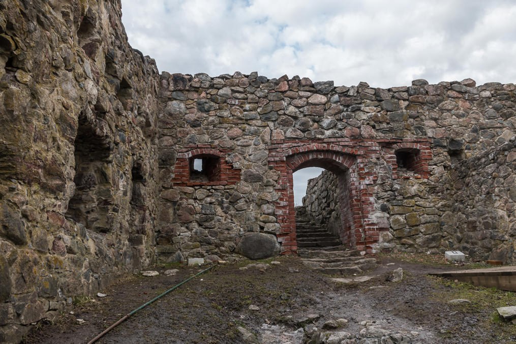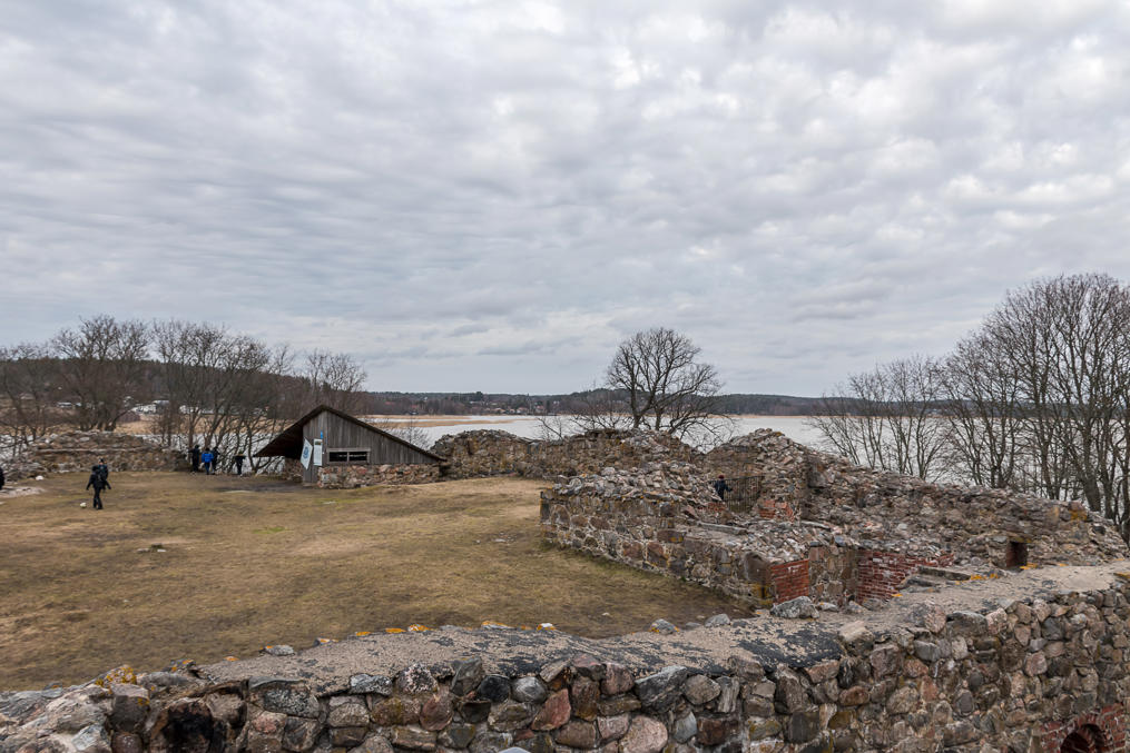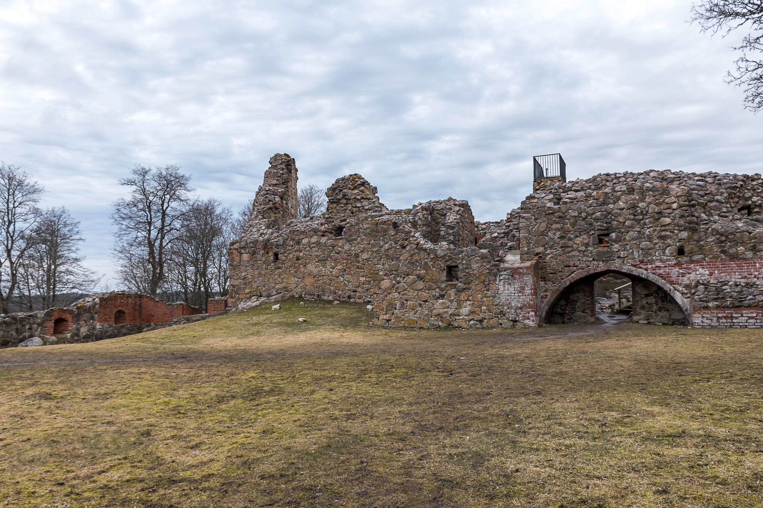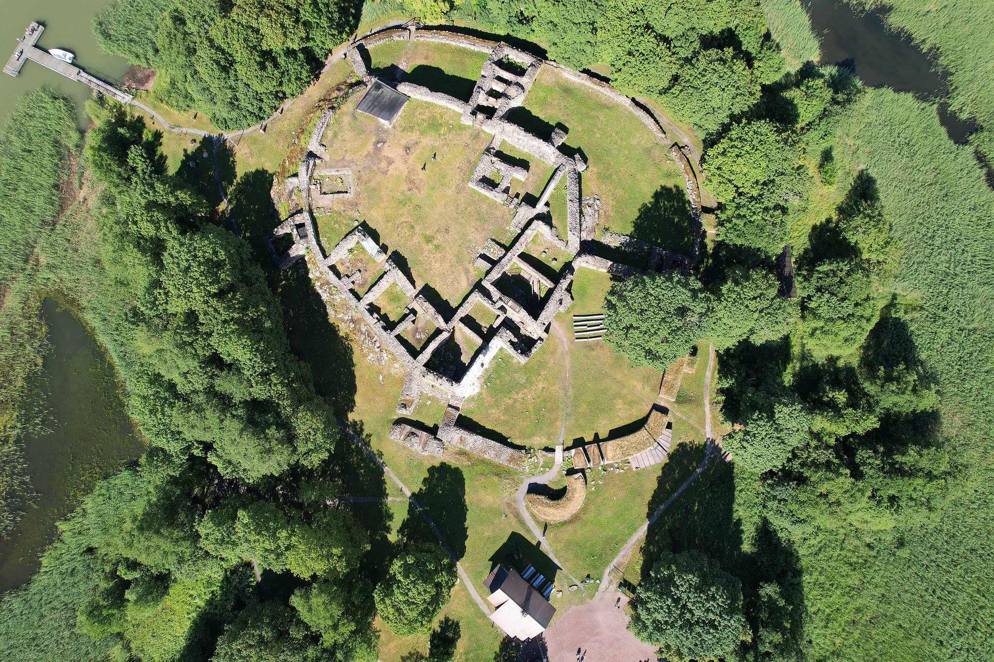 12. Камни с руин использовались для строительства и ремонта в т. ч. Туркусского замка, замка Кастельхольм и нескольких церквей. Изучать и реставрировать руины начали в конце 19 века. Сейчас за ними ухаживает Лесное управление. Фото с воздуха из вики.