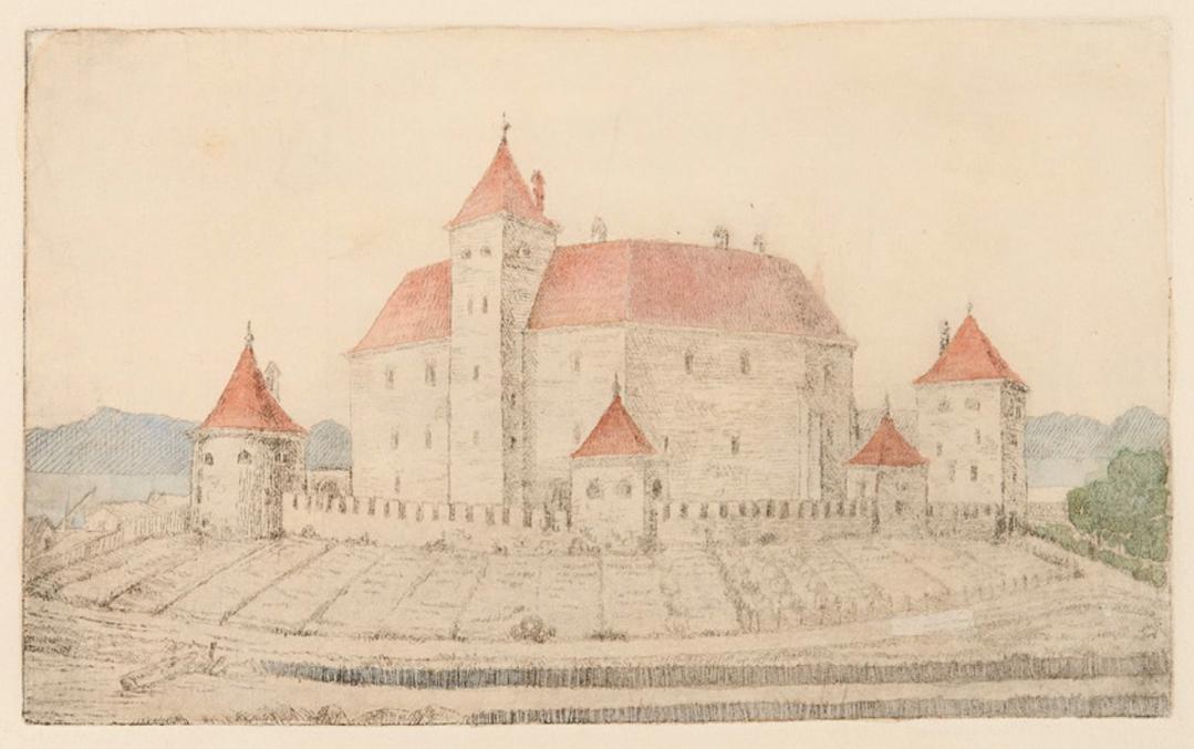 3. На рисунке архитектора Магнуса Шерфбека из Национального архива предполагаемый облик замка в начале 16 в.