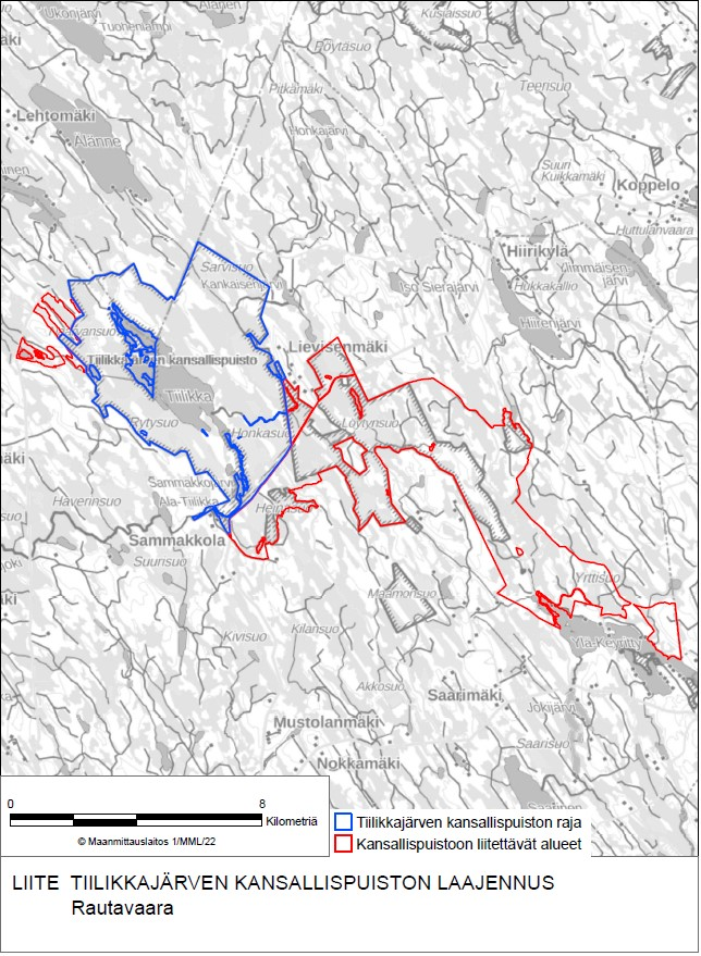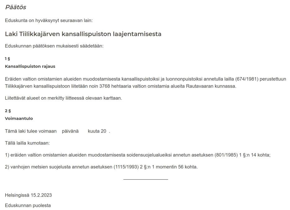 16. А в начале 2023 парламент одобрил закон, присоединяющий к нац. парку обширные государственные земли на востоке, частично уже имевшие природоохранный статус. 37.7 кв. км, то есть Тийликкаярви выросла более чем вдвое, стало 71 кв. км. Закон вступил в силу с июня 2023, и теперь Тийликкаярви — второй самый большой национальный парк за пределами Северной Финляндии, правда, пешие маршруты в новой его части пока развиты слабо.