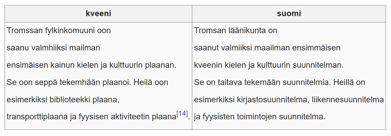 В квенском много норвежских, а также саамских слов, но фактически это все же скорее диалект финского, из перяпохьольской группы. С 2005 имеет статус официального языка меньшинства, правда, только в одном муниципалитете, Порсангер.