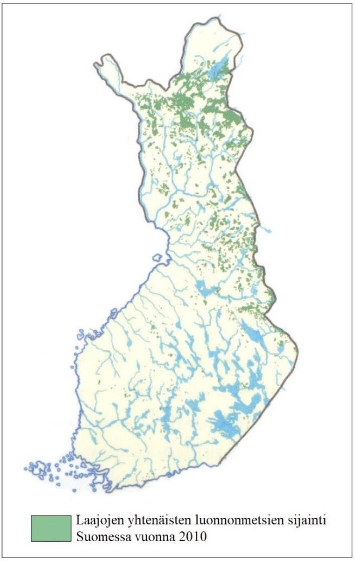 Это карта таких лесов по состоянию на 2010. Как видно, южнее линии Оулу-Йоэнсуу девственные леса сохранились лишь редкими отдельными маленькими кусочками. В нашли дни многих из них являются заповедниками или национальными парками — как Пюхя-Хякки.