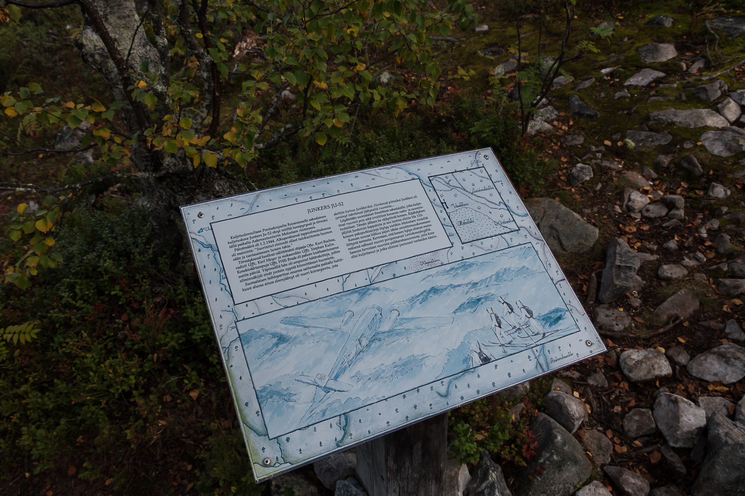 А еще достопримечательность Аакенуса — место крушения германского транспортного самолета Ju-52 в войну, в феврале 1944. "Юнкерс" вез запчасти самолетов Bf-110 из российской Карелии в Рованиеми, но из-за сложных погодных условий (пурга) сбился с пути и врезался в склон Аакенуса.