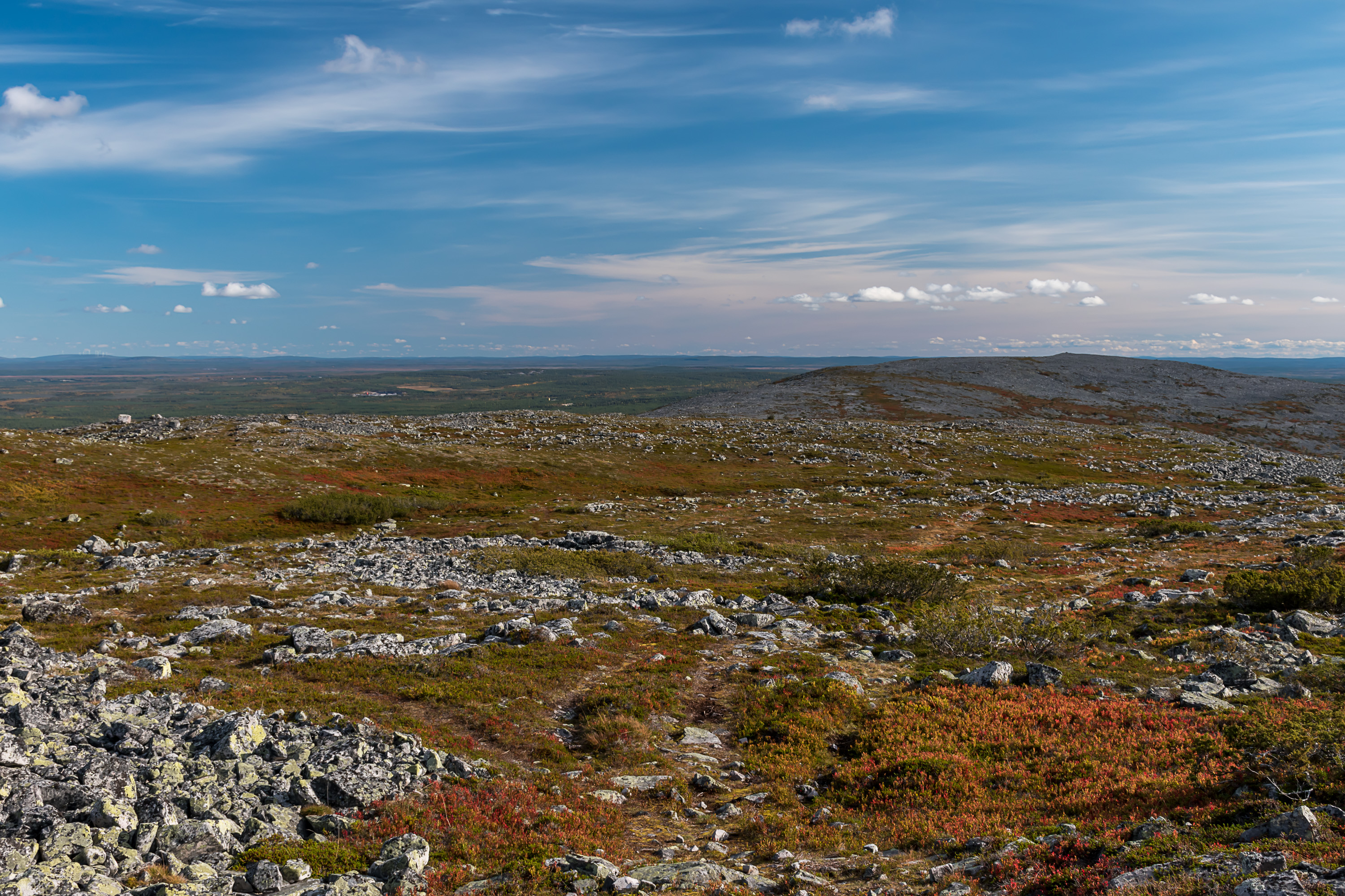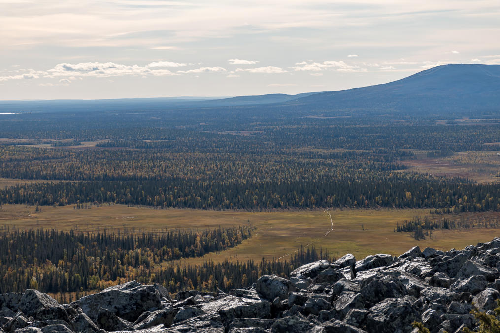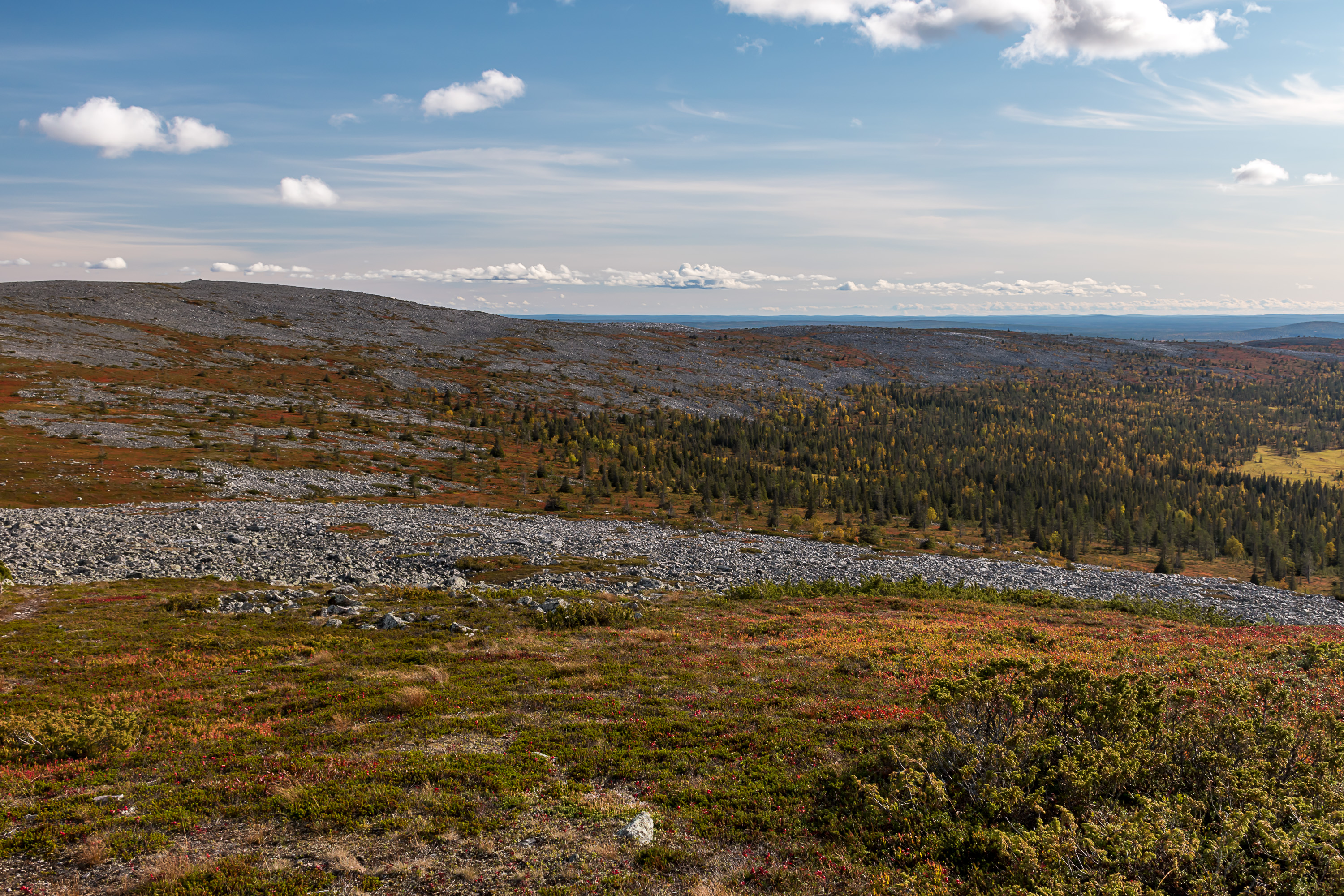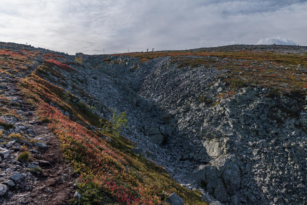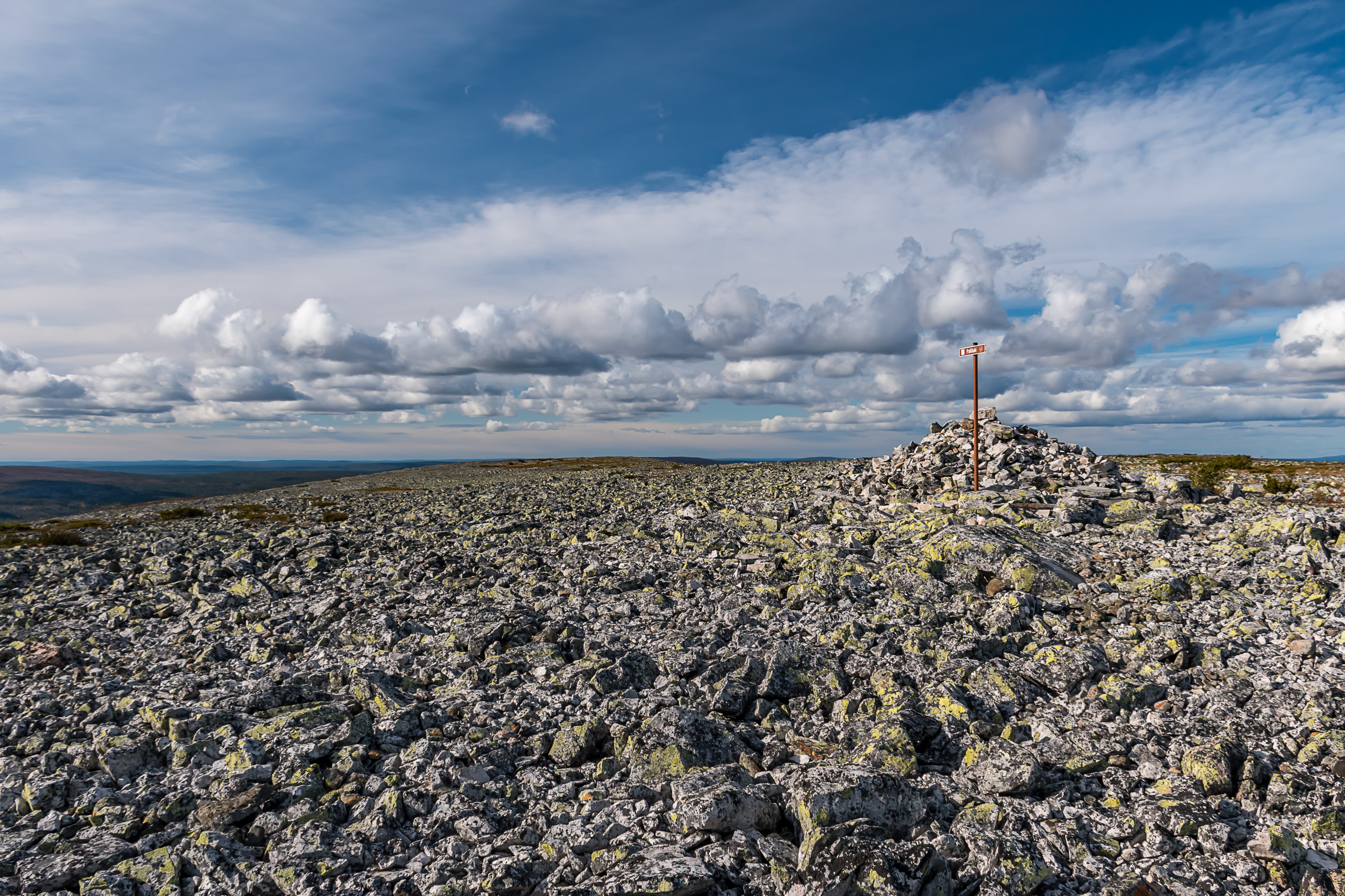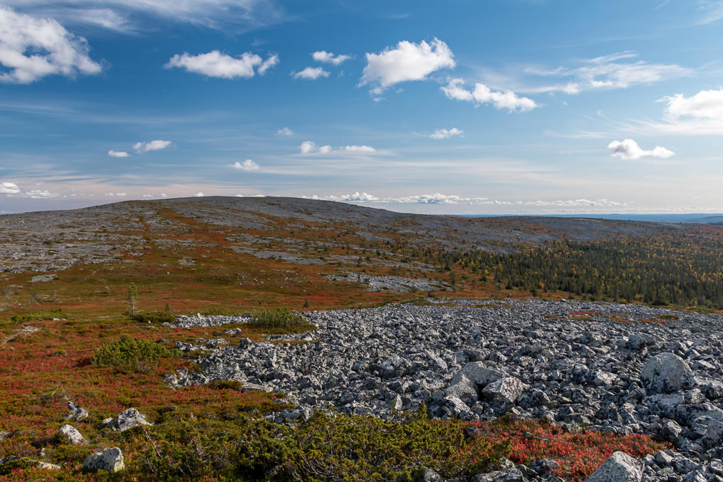 Тундры типа Аакенуса довольно пологие, и с самой вершины обычно особенно ничего и не видно, кроме моря камней-курумника, а красивые виды все на склонах.