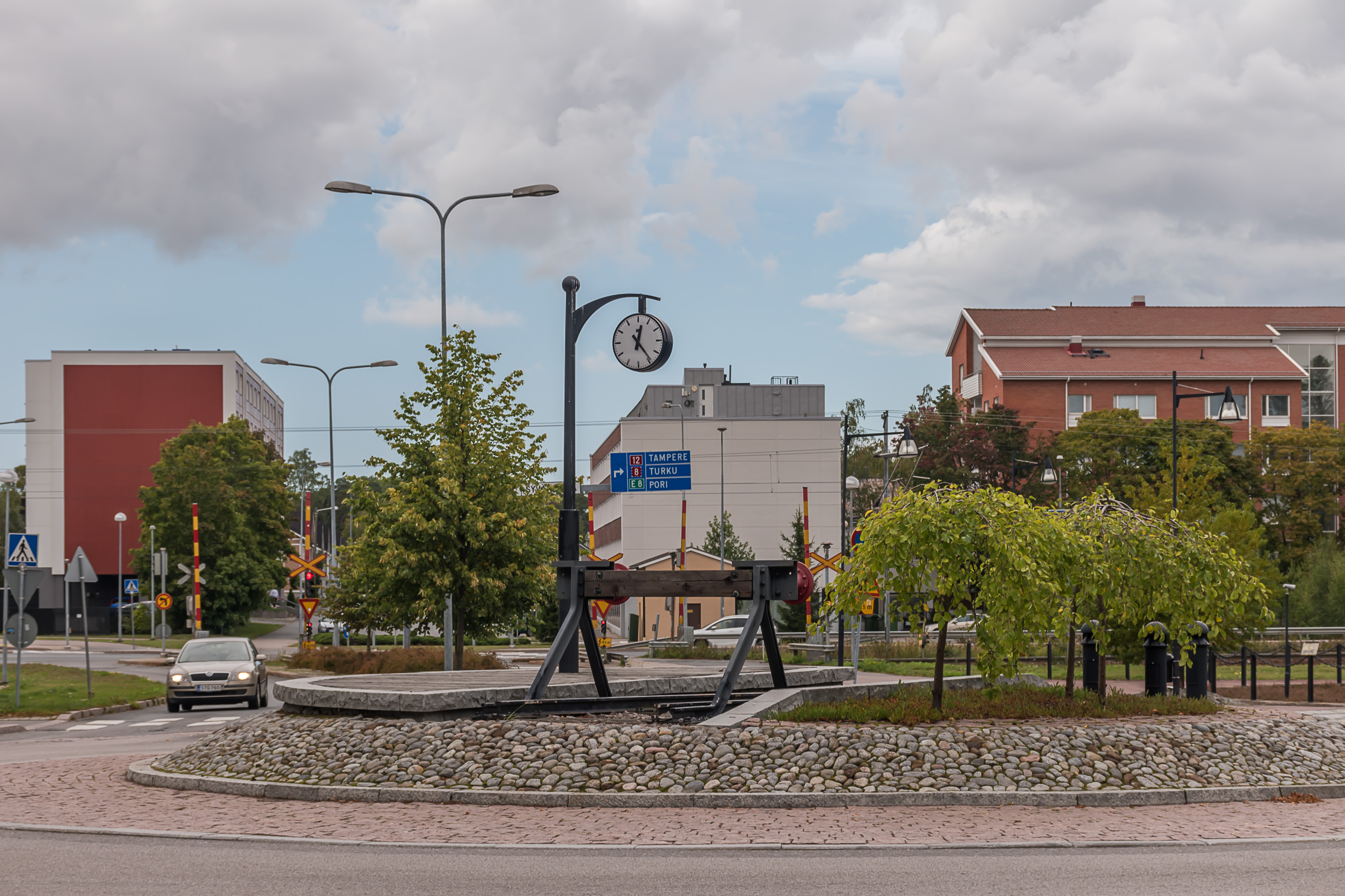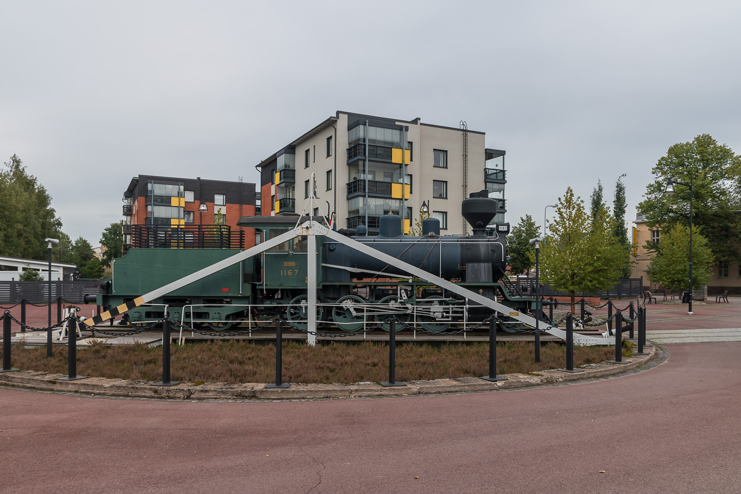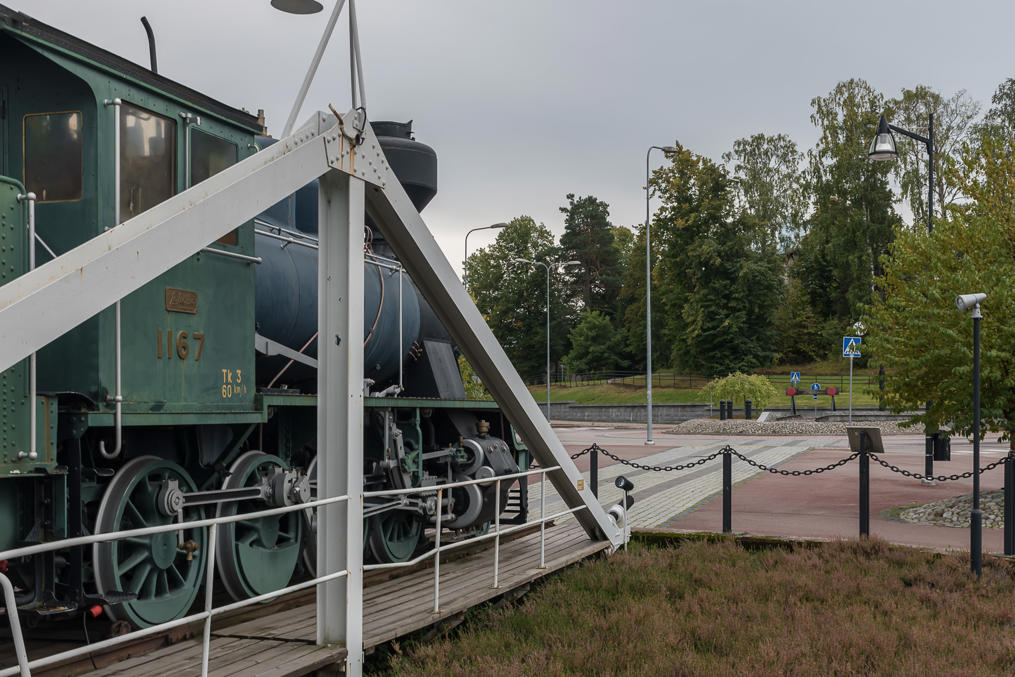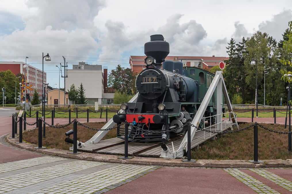 39. Очень мне понравившийся памятник Раумской железной дороге, устроенный прямо посреди кругового движения на перекрестке и рядом с ним, с паровозом Tk3 и имитацией поворотного круга. Ж/д Тампере-Пори построили в 1895, и в Рауме так испугались, что порт соседнего Пори оставит их позади, что стали строить свою. Так что уже в 1897 город Раума построил себе свою ж/д в 47 км, ответвлявшуюся от ж/д Тампере-Пори на ст. Пейпохья (ныне Кокемяки). В отличие от некоторых других подобных железных дорог (например, на Ловиису или Нюкарлебю) им хватило ума также сразу построить ее обычной колеи, так что город смог ее содержать аж до 1950, только тогда продали государству — единственная муниципальная ж/д страны оставалась на тот момент.